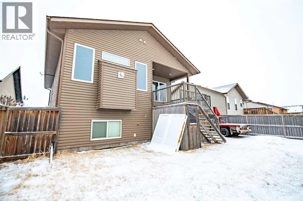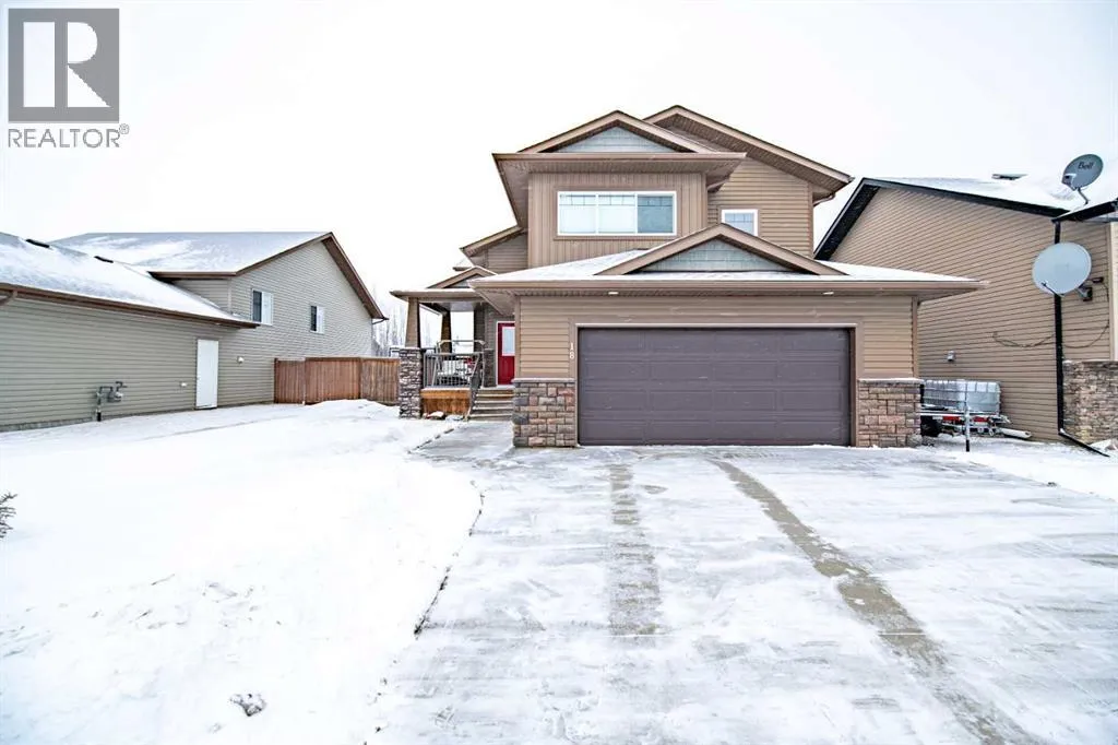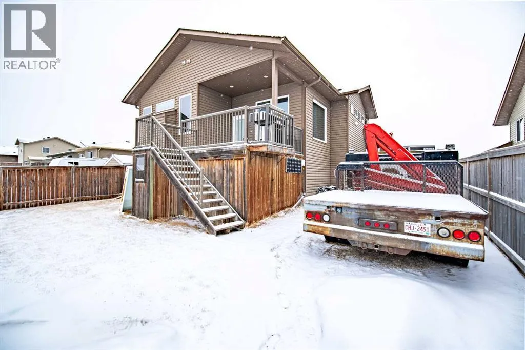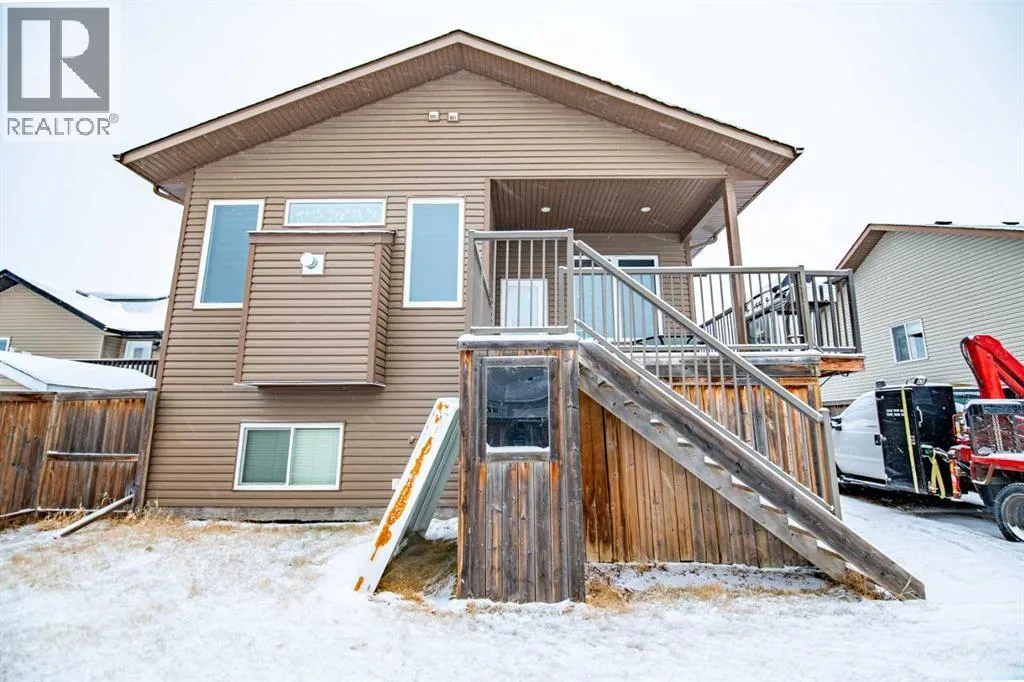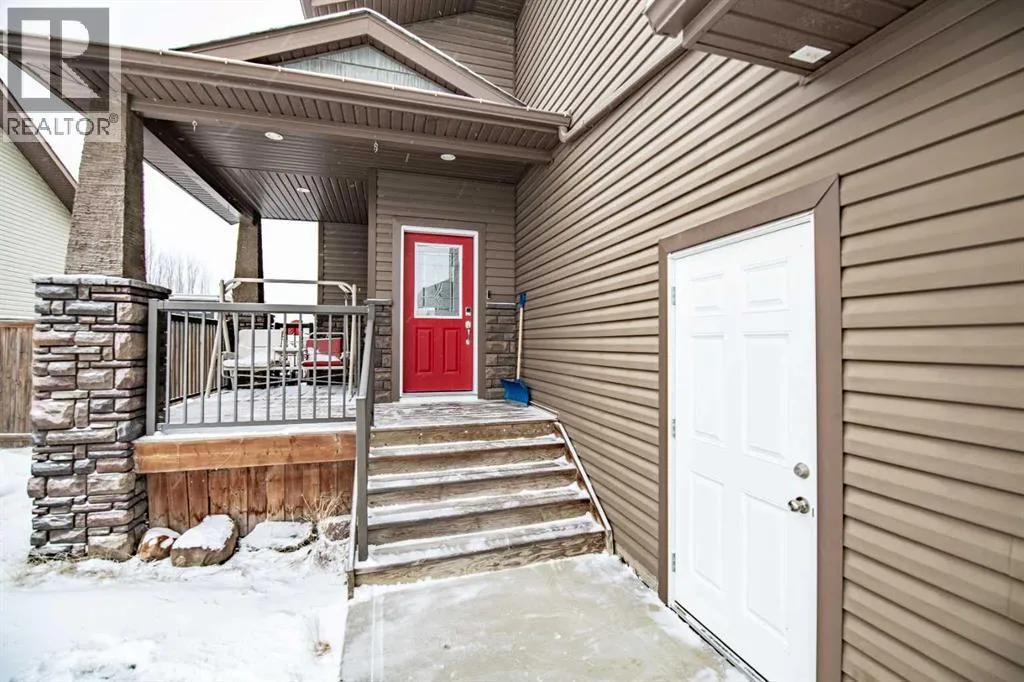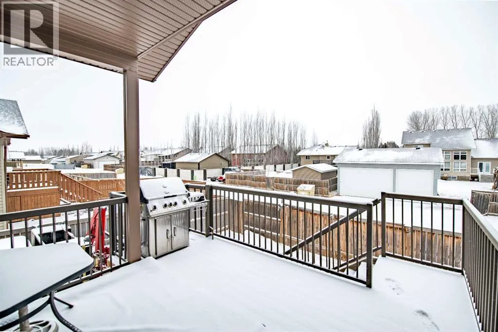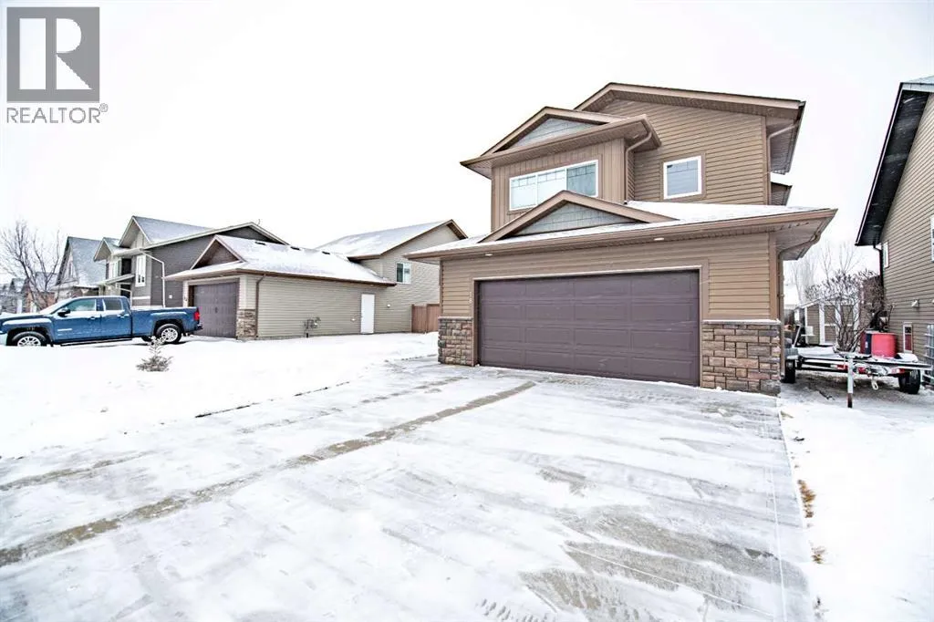Nestled on a quiet crescent in one of Lacombe's well-established neighbourhoods, this charming 1½ storey home offers a functional and inviting layout with quality finishes throughout. The main floor welcomes you with a bright living room featuring a striking feature wall and a cozy fireplace with beautiful stone surround. Natural light flows generously through the home, creating an airy and comfortable atmosphere. The kitchen is a standout space, thoughtfully designed with ample workspace and easy access to the partially covered back deck that offers a gas hookup for a BBQ. Gas stove top with electric double ovens and dishwasher 4 years old. Two bedrooms are located on the main floor, with the spacious primary suite on the upper level, complete with a large walk-in closet and private ensuite. The fully developed basement with 9 ft ceilings adds excellent versatility, offering two additional bedrooms, a full bathroom, dedicated laundry/utility room, and a storage room. The impressive wet bar makes this lower level a natural gathering space, and in-floor heat throughout ensures year-round comfort. Outside, the large heated double attached garage provides convenient parking and storage. The backyard is a practical featuring dedicated RV parking with a 50-amp hookup and the added benefit of an extra-wide back alley for easy access.Additional features include central air conditioning and central vacuum. A meticulously well kept home home offering space, comfort, and standout amenities. This home is ready to welcome its next family. (id:27476)