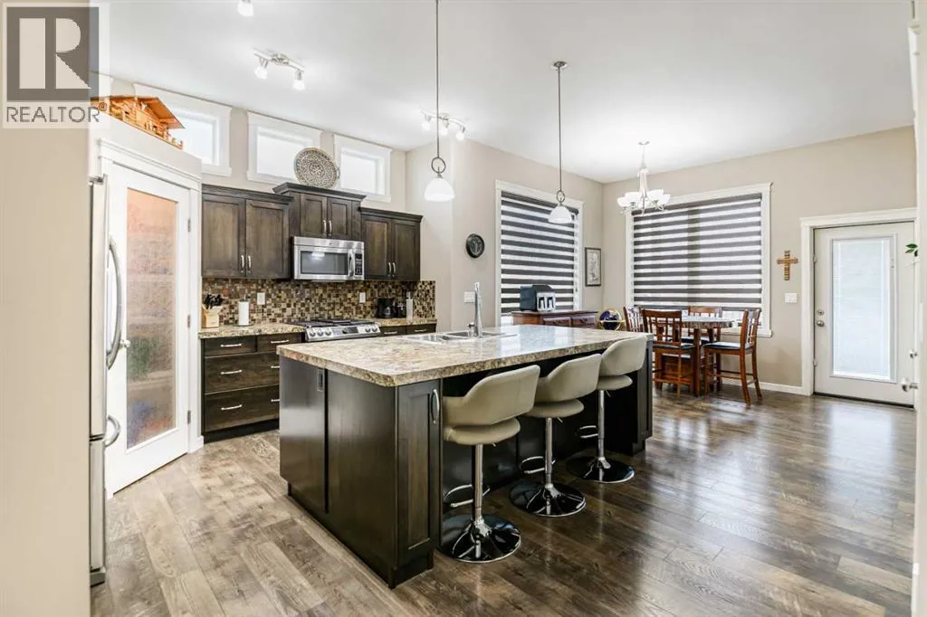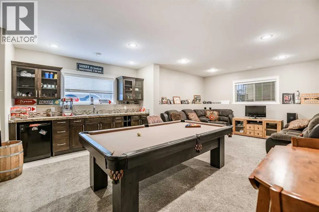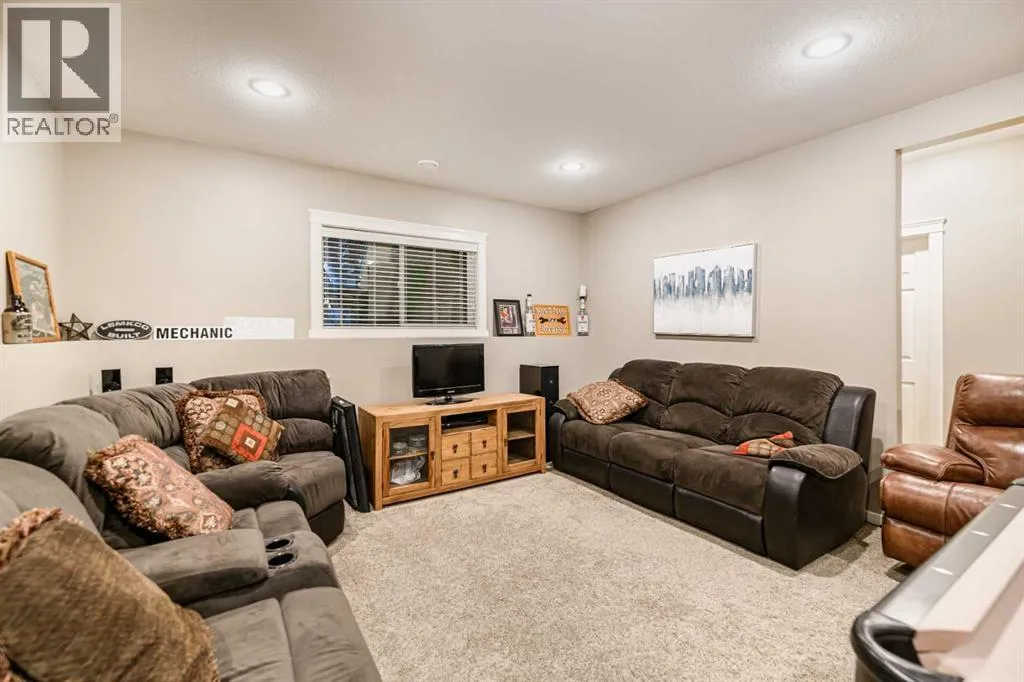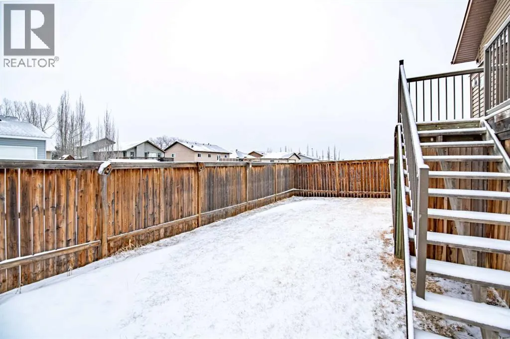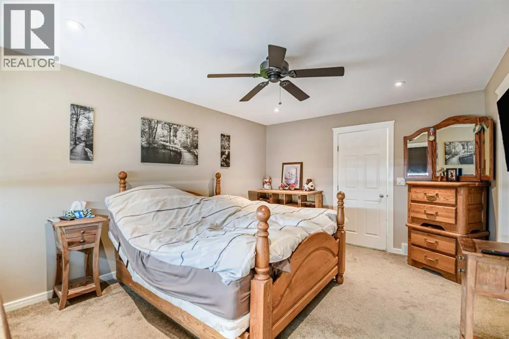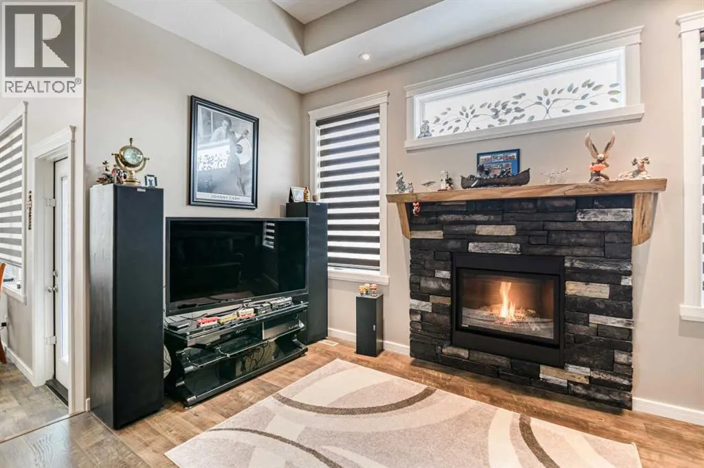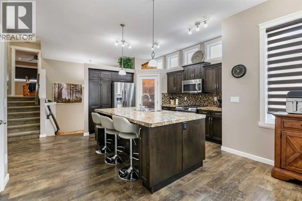 Nestled on a quiet crescent in one of Lacombe's well-established neighbourhoods, this charming 1½ storey home offers a functional and inviting layout with quality finishes throughout. The main floor welcomes you with a bright living room featuring a striking feature wall and a cozy fireplace with beautiful stone surround. Natural light flows generously through the home, creating an airy and comfortable atmosphere. The kitchen is a standout space, thoughtfully designed with ample workspace and easy access to the partially covered back deck that offers a gas hookup for a BBQ. Gas stove top with electric double ovens and dishwasher 4 years old. Two bedrooms are located on the main floor, with the spacious primary suite on the upper level, complete with a large walk-in closet and private ensuite. The fully developed basement with 9 ft ceilings adds excellent versatility, offering two additional bedrooms, a full bathroom, dedicated laundry/utility room, and a storage room. The impressive wet bar makes this lower level a natural gathering space, and in-floor heat throughout ensures year-round comfort. Outside, the large heated double attached garage provides convenient parking and storage. The backyard is a practical featuring dedicated RV parking with a 50-amp hookup and the added benefit of an extra-wide back alley for easy access.Additional features include central air conditioning and central vacuum. A meticulously well kept home home offering space, comfort, and standout amenities. This home is ready to welcome its next family. (id:27476)