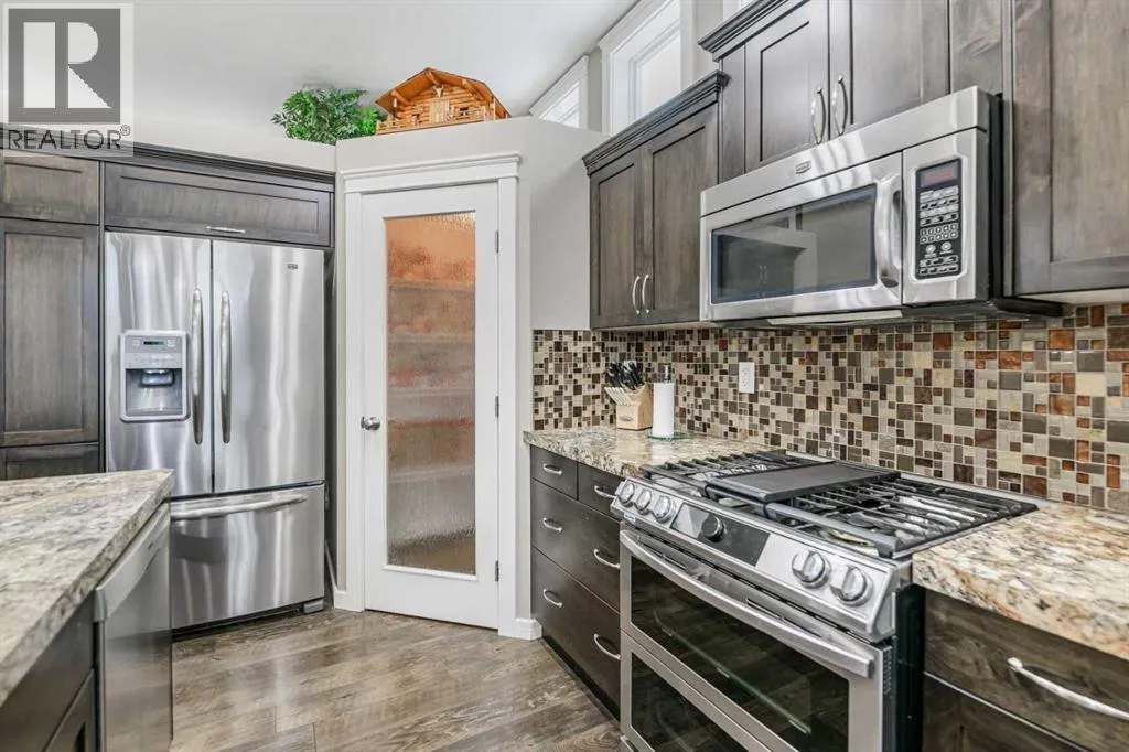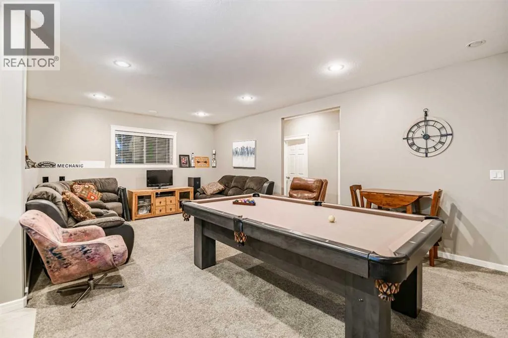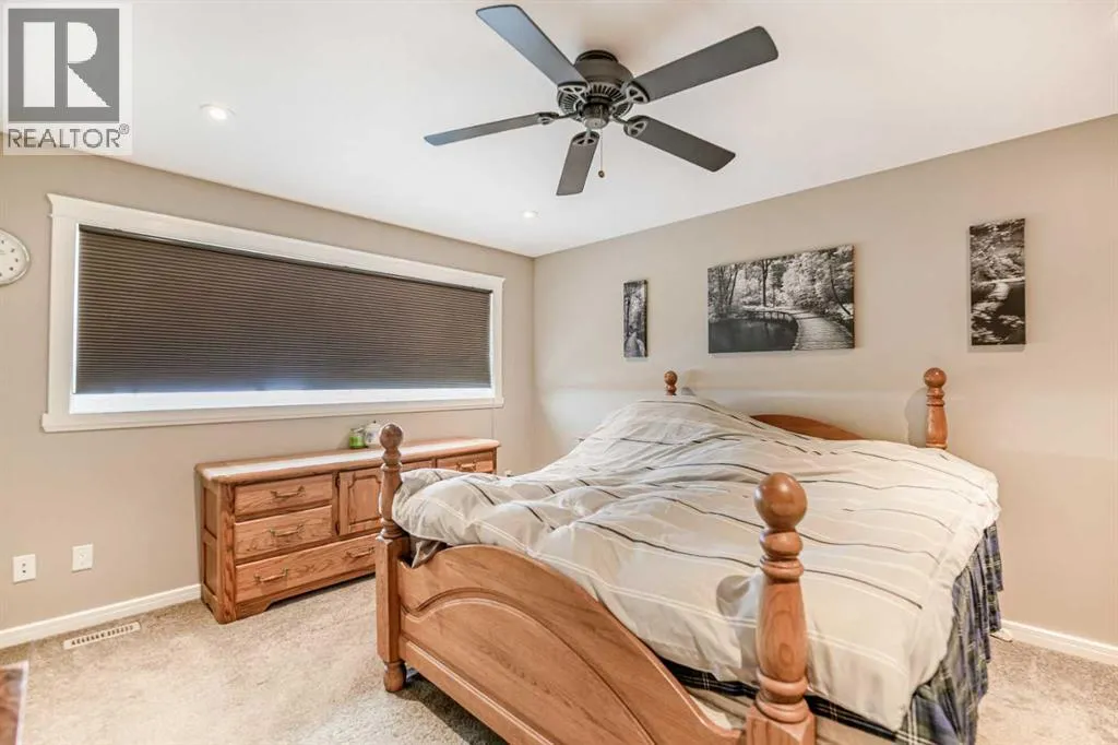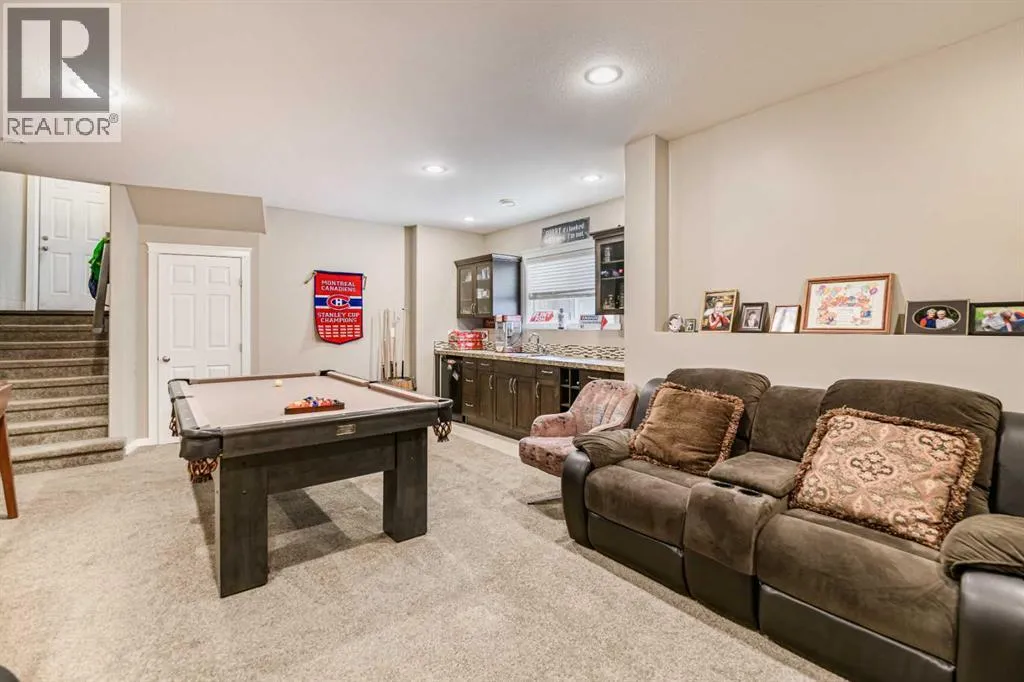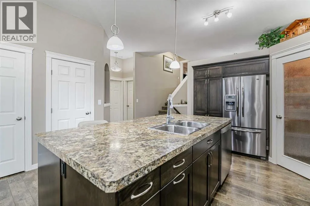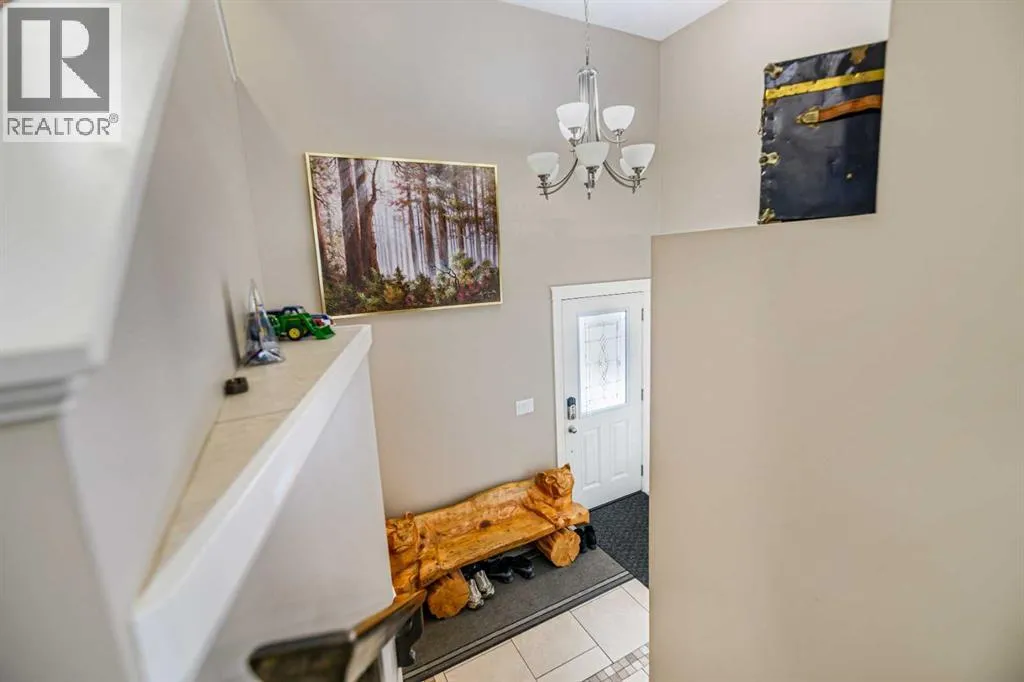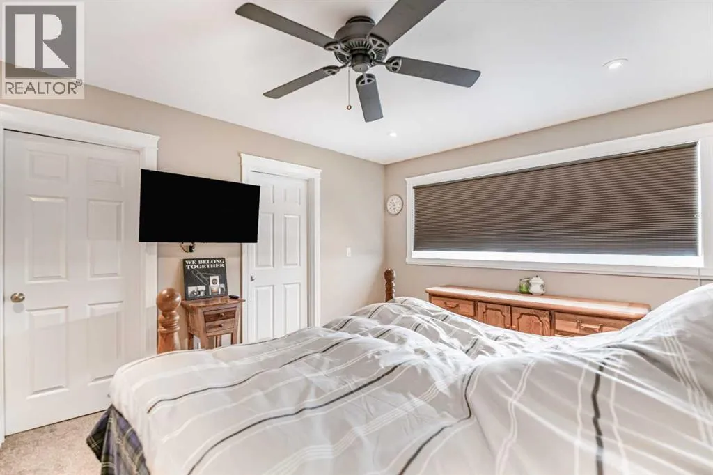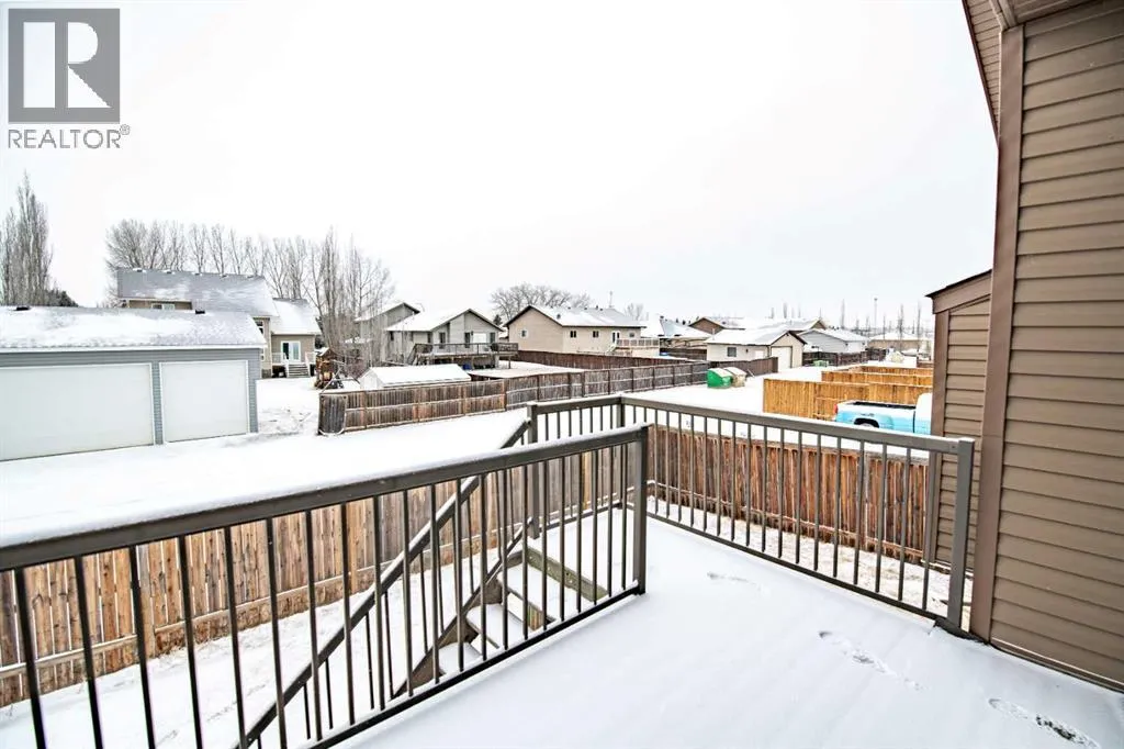 Nestled on a quiet crescent in one of Lacombe's well-established neighbourhoods, this charming 1½ storey home offers a functional and inviting layout with quality finishes throughout. The main floor welcomes you with a bright living room featuring a striking feature wall and a cozy fireplace with beautiful stone surround. Natural light flows generously through the home, creating an airy and comfortable atmosphere. The kitchen is a standout space, thoughtfully designed with ample workspace and easy access to the partially covered back deck that offers a gas hookup for a BBQ. Gas stove top with electric double ovens and dishwasher 4 years old. Two bedrooms are located on the main floor, with the spacious primary suite on the upper level, complete with a large walk-in closet and private ensuite. The fully developed basement with 9 ft ceilings adds excellent versatility, offering two additional bedrooms, a full bathroom, dedicated laundry/utility room, and a storage room. The impressive wet bar makes this lower level a natural gathering space, and in-floor heat throughout ensures year-round comfort. Outside, the large heated double attached garage provides convenient parking and storage. The backyard is a practical featuring dedicated RV parking with a 50-amp hookup and the added benefit of an extra-wide back alley for easy access.Additional features include central air conditioning and central vacuum. A meticulously well kept home home offering space, comfort, and standout amenities. This home is ready to welcome its next family. (id:27476)