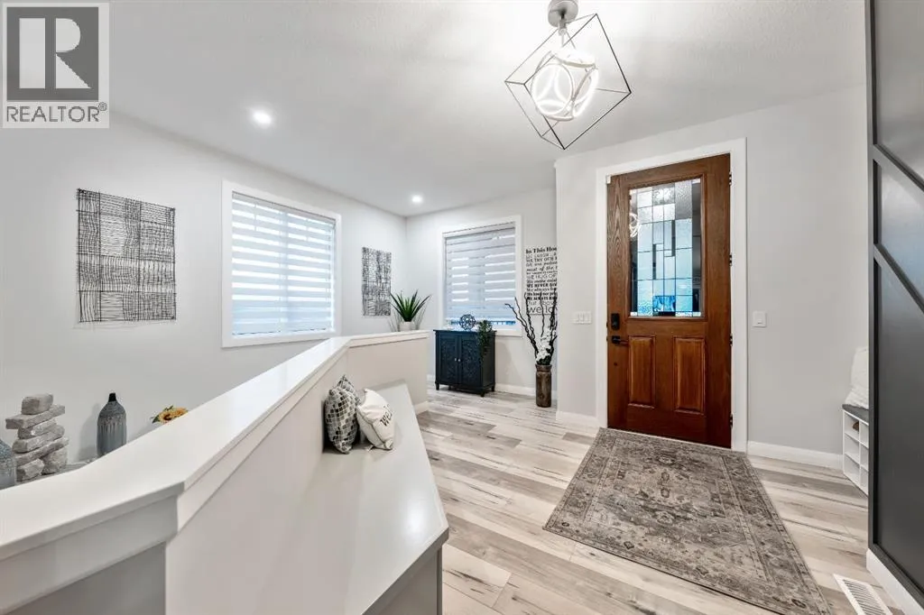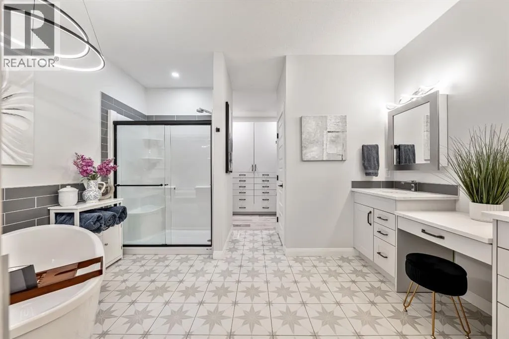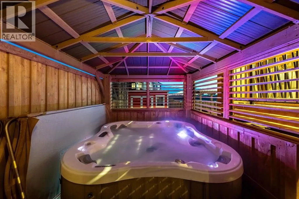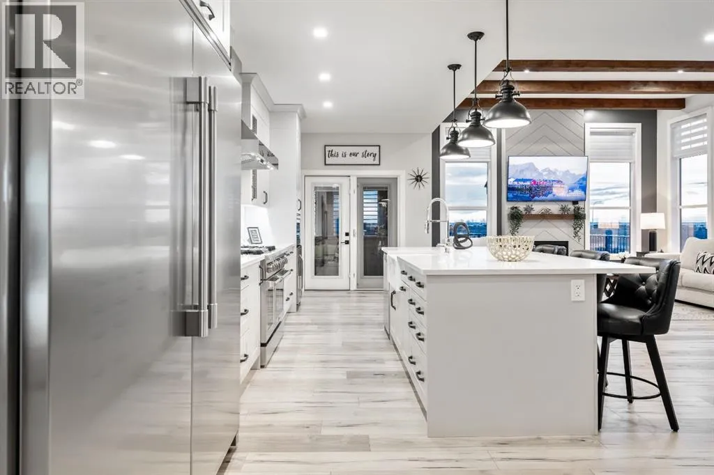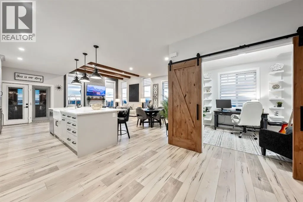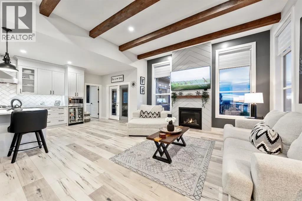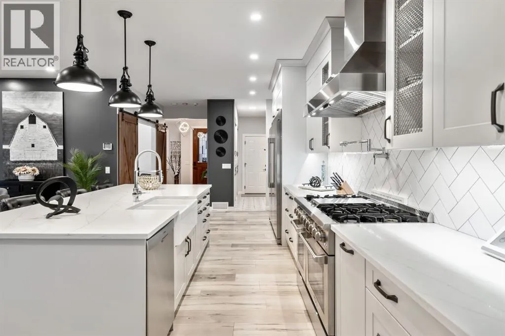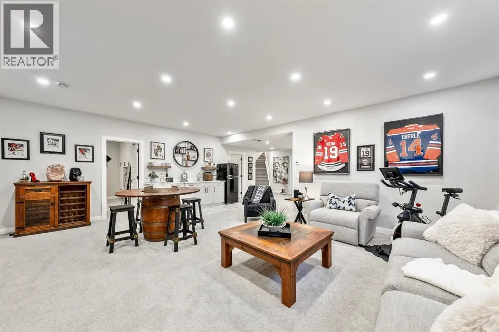 Welcome to this EXCEPTIONAL, FULLY FINISHED BUNGALOW in the sought-after community of THE BRIDGES OF LANGDONâan outstanding opportunity for buyers seeking a TRUE MOVE-IN READY HOME with MODERN COMFORT and TIMELESS DESIGN. From the moment you arrive, the FULLY COMPLETED LANDSCAPING and premium HARDIE BOARD SIDING create striking curb appeal, while the charming VAULTED FRONT PORCH sets the tone for the quality found throughout.Inside, this CUSTOM-DESIGNED home showcases an EXPANSIVE, FUNCTIONAL LAYOUT enhanced by VAULTED CEILINGS, DESIGNER LIGHTING, and beautiful LAMINATE FLOORING across the bright, open-concept main level. Large WEST-FACING WINDOWS flood the living space with natural light, drawing your eye to the inviting GAS FIREPLACE that anchors the room and creates a warm, welcoming atmosphere.The kitchen is truly the CENTREPIECE of the home, designed to impress and built for everyday living. A substantial QUARTZ ISLAND with FARMHOUSE SINK, DESIGNER PENDANT LIGHTING, CUSTOM HOOD FAN, and a full STAINLESS STEEL APPLIANCE PACKAGEâincluding a SIDE-BY-SIDE FULL FRIDGE AND FREEZER and a THOR GAS STOVE with POT FILLER TAPâmake this a dream space for cooking and entertaining. Crisp CABINETRY and carefully selected backsplash finishes provide a clean, sophisticated aesthetic. Double patio doors open seamlessly to the REAR COVERED DECK, offering effortless INDOOR-OUTDOOR LIVING.Sliding BARN DOORS reveal a beautifully appointed OFFICE/DEN complete with a feature wallâperfect for working from home or creating a stylish flex space. The spacious PRIMARY SUITE offers a peaceful retreat with 9-FOOT CEILINGS, an accent wall, and a CUSTOM WALK-IN CLOSET with extensive built-ins. The SPA-INSPIRED ENSUITE elevates everyday living with DUAL SINKS, a MAKE-UP STATION, FREESTANDING SOAKER TUB, and HIS AND HERS VANITIES.The main level is completed by a generous LAUNDRY ROOM featuring DESIGNER TILE, cabinetry, and a sink for added convenience. Downstairs, the FULLY DEVELOPED BAS EMENT offers a comfortable lounge atmosphere with IN-FLOOR HEATING, plush carpeting, a spacious recreation area with WET BAR, THREE ADDITIONAL BEDROOMS with CUSTOM BUILT-IN CLOSETS, a SECOND FULL BATHROOM, and a ROUGHED-IN FUTURE LAUNDRY SPACE. An extension to the home is the closed in exterior deck, this is a true retreat area with the option to open or close the shutters, enjoy family and friends around a cozy fireplace while watching your favorite game on the exterior TV! Finish off the evening with a quick soak in the HOT TUB!Extensive upgrades continue in the TRIPLE ATTACHED GARAGE, complete with IN-FLOOR HEATING, built-in cabinetry, and a dedicated workbench areaâtruly a perfect retreat for hobbies or storage.Ideally located near PARKS, the NEW HIGH SCHOOL, and the many amenities that make Langdon such a desirable place to call home, this stunning bungalow offers the perfect balance of LOCATION, LIFESTYLE, AND LUXURY. Call today to experience it for yourself. (id:27476)