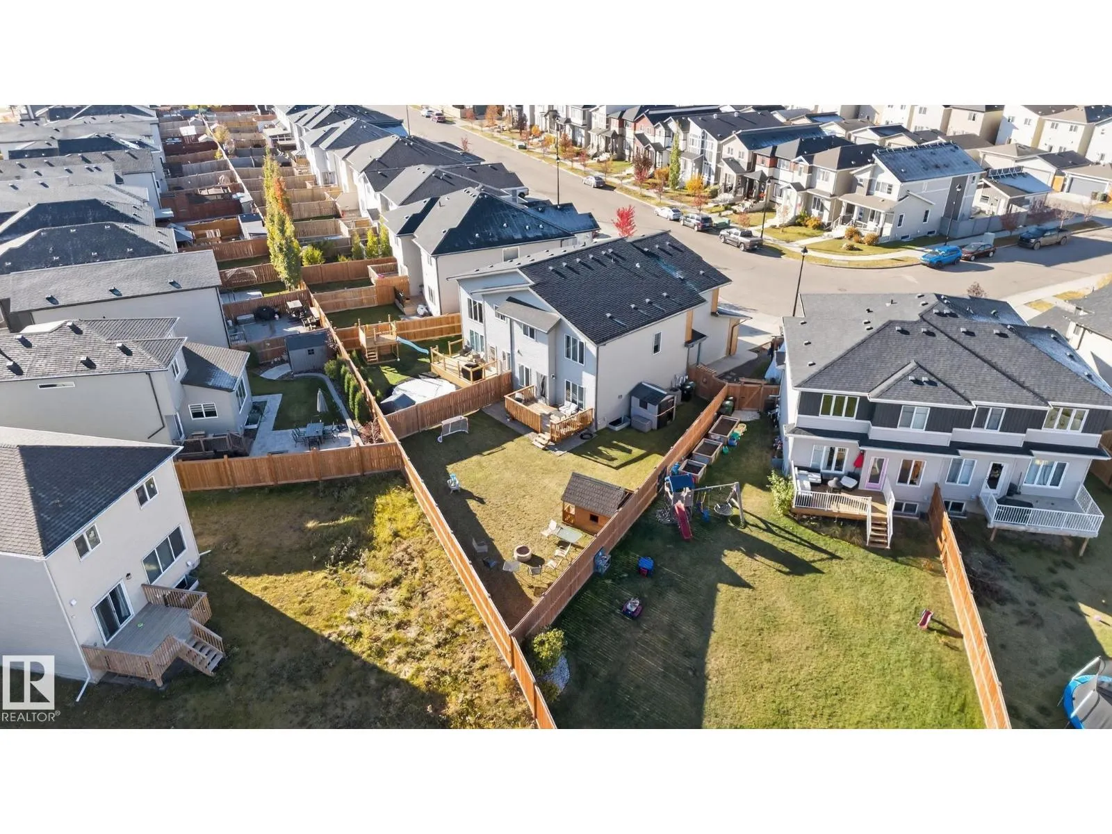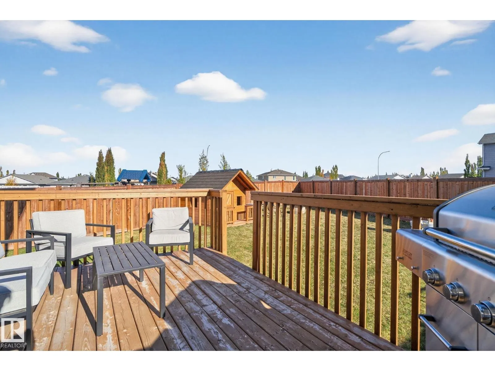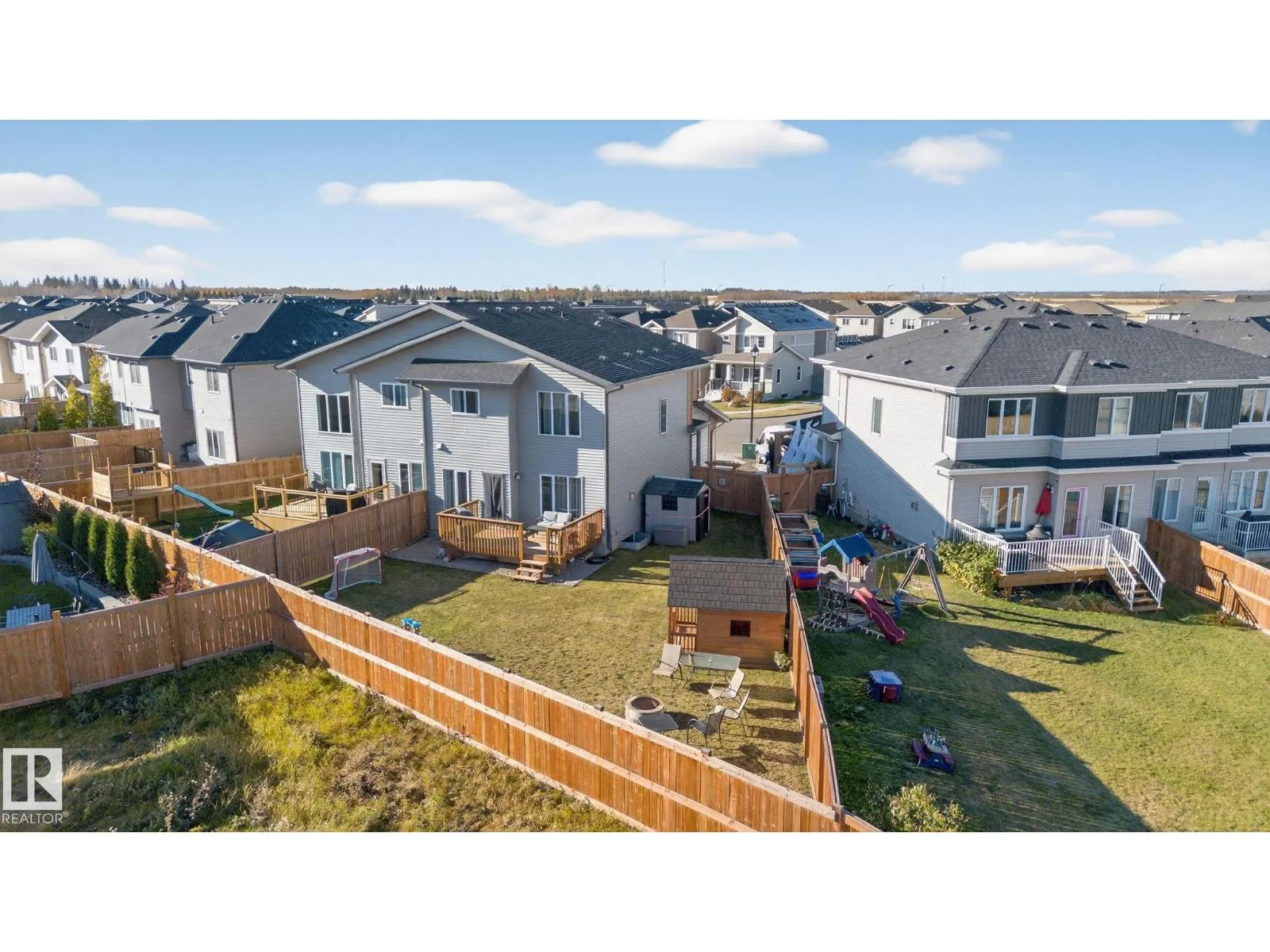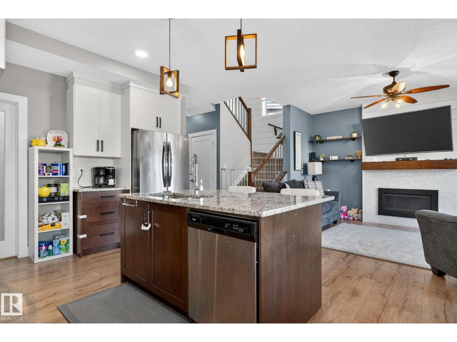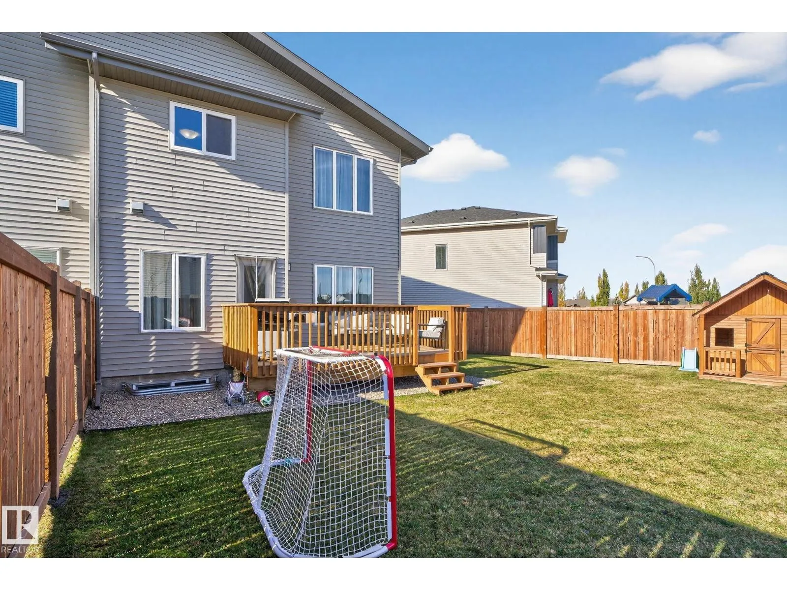 Welcome to this beautifully maintained half duplex in the family-friendly community of Blackstone! Offering a thoughtfully designed living space, this home truly shows pride of ownership. The bright and open main floor features a welcoming layout with a walkthrough pantry leading to a stunning kitchen with granite countertops and newer stainless steel appliances. The living room is highlighted by a shiplap feature wall with a ceramic tile fireplace and large windows that fill the space with natural light while overlooking the backyard. Step outside to enjoy a large pie-shaped, fully fenced, and beautifully landscaped yardâcomplete with a deck, fire pit, and charming wooden playhouse, perfect for summer entertaining. Upstairs, youâll find a spacious primary suite with a luxurious 5-piece ensuite and walk-in closet. A cozy bonus room, convenient upstairs laundry, and two additional bedrooms with a 4-piece bathroom complete the upper level. Additional features include a double attached garage and A/C (2024) (id:27476)