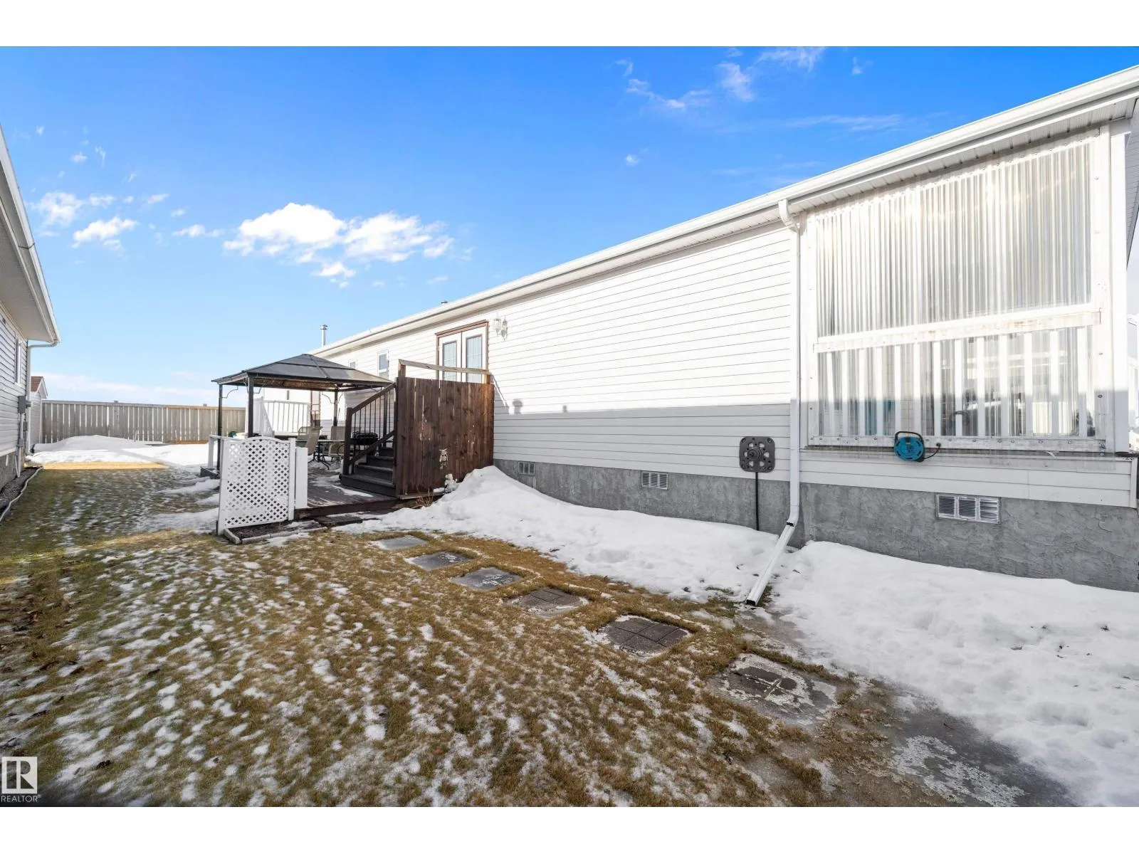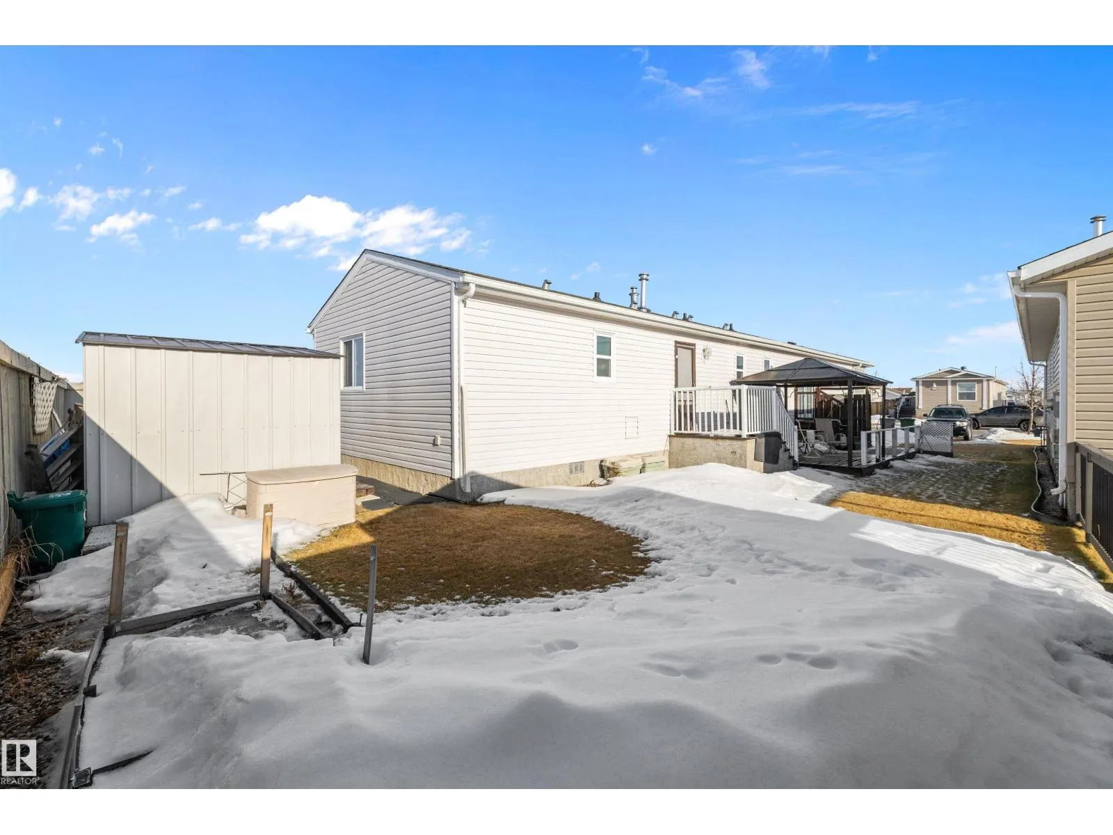 Welcome to your new home in Aspen Creek! This home has a front veranda and is one of the larger floorplans in the park. As you step into the large entryway you are greeted with a sun-filled living room that looks into the spacious kitchen and dining room. The kitchen has ample counter space and an oversized pantry. Down the hall from the kitchen you have a 4 piece bathroom, a large laundry room, and three bedrooms that are all a great size with primary suite being oversized. The primary suite has a large walk-in closet and a spacious en-suite with modified shower tub combo for easy accessibility. This home is in fantastic condition and has a large yard with wood patio and shed. Quiet location with no rear neighbours, all within a well-managed park. (id:27476)