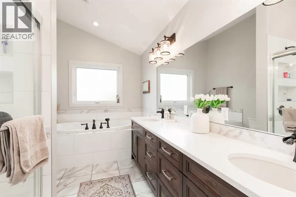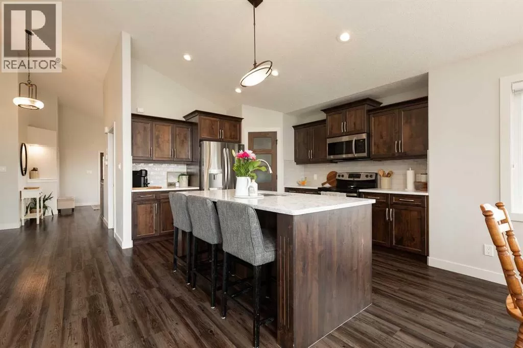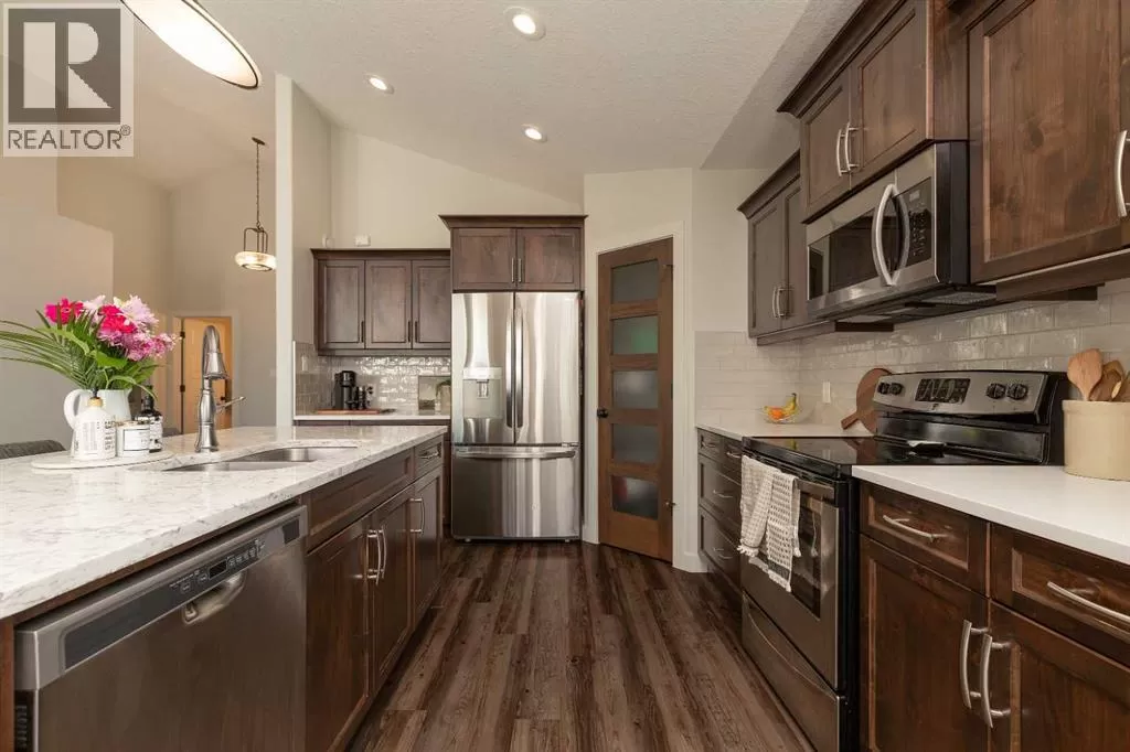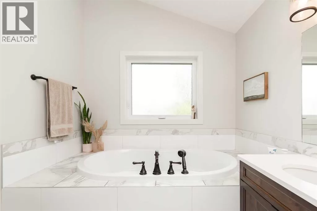 If youâve been holding out for the perfect bungalow, this might just be the one! Sitting on a corner lot, this custom-built home checks a ton of boxes. From the moment you walk in, youâll notice the vaulted ceilings, great hardwood floors, and all the natural light flooding in. The main floor layout is smart and super functional with an open concept kitchen (quartz countertops, of course), dining and living space, a full 4-piece bathroom, and a good-sized bedroom. Main floor laundry? Yep, that too!The primary suite is a standoutâitâs got a walk-in closet, a big 5-piece ensuite with a jetted tub, dual vanity, and just feels like a proper retreat. Head downstairs and youâre greeted by a massive family room (over 500 sq ft!) with a cozy fireplace, two more large bedrooms (one with another walk-in closet), and another full 4-piece bath. And the extras? This place is loaded. A/C, underground sprinklers, air exchange system, surround sound, heated garage, central vac, custom blinds, and window coverings throughout. Outside, you get an amazing deck, and some of the best landscaping you'll see on the market right now! If you're looking for a bungalow that doesnât cut corners, this one's worth a look. (id:27476)