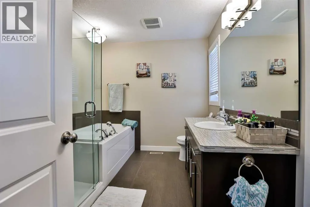 Check out this fantastic fully developed 3 bedroom home with mountain views! Located in the Sunridge neighborhood, this home, built by Cedar Ridge Homes, has it all; all of the quality upgrades you would expect to find in a showhome, located on a quiet street close to amenities, backs onto an open field so no back neighbor, and stunning views of both the mountains and the coulees. This home has been immaculately maintained and it shows. The main floor offers a bright open floorplan with beautiful espresso colored cabinets, gorgeous granite countertops, a pantry, and stainless steel appliances. The dining room and living room have large picture windows to take in the expansive views offered by having no back neighbor or development behind the property. The backyard is fully fenced and landscaped. Upstairs offers 3 bedrooms and boasts newer premium carpet with upgraded underlay you can see and feel instantly. The master bedroom has a walk-in closet and ensuite with tiled glass shower and large soaker tub. The basement was professionally finished in 2021 to seamlessly match the rest of the home and adds an additional TV room, storage room, and 3 piece bathroom with a glass tiled shower. The bright white walls, windows, and premium finishes make this a beautiful and comfortable space. The home also has all of the functional features you would want for added convenience like a double attached garage with gas heater, air conditioning, tankless hot water heater, and a shed in the backyard for additional storage. This is the perfect home with everything you could want, quick possession possible, call your favorite real estate agent today to view before it is gone! (id:27476)