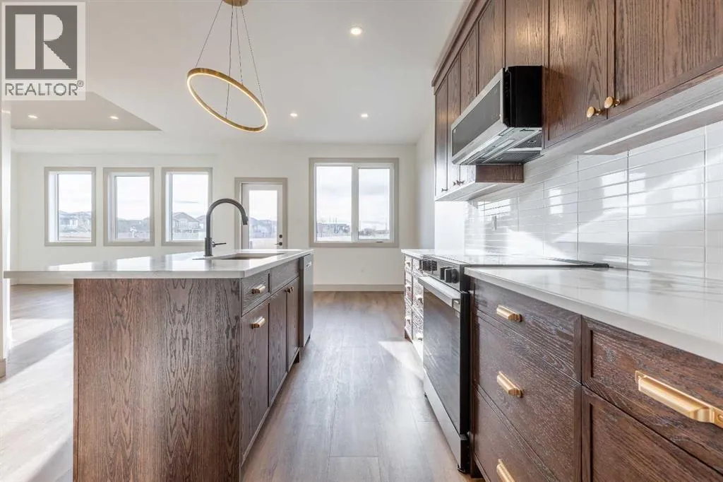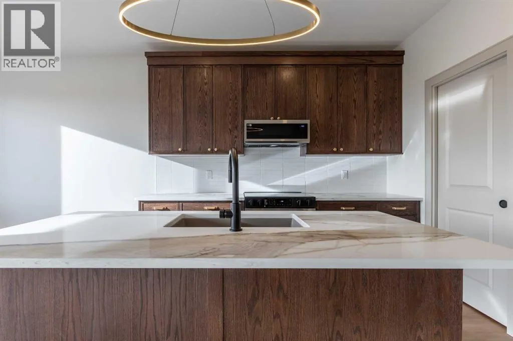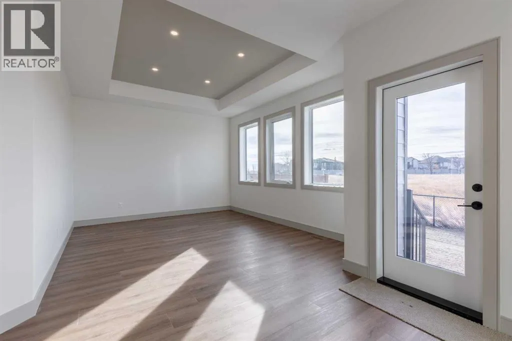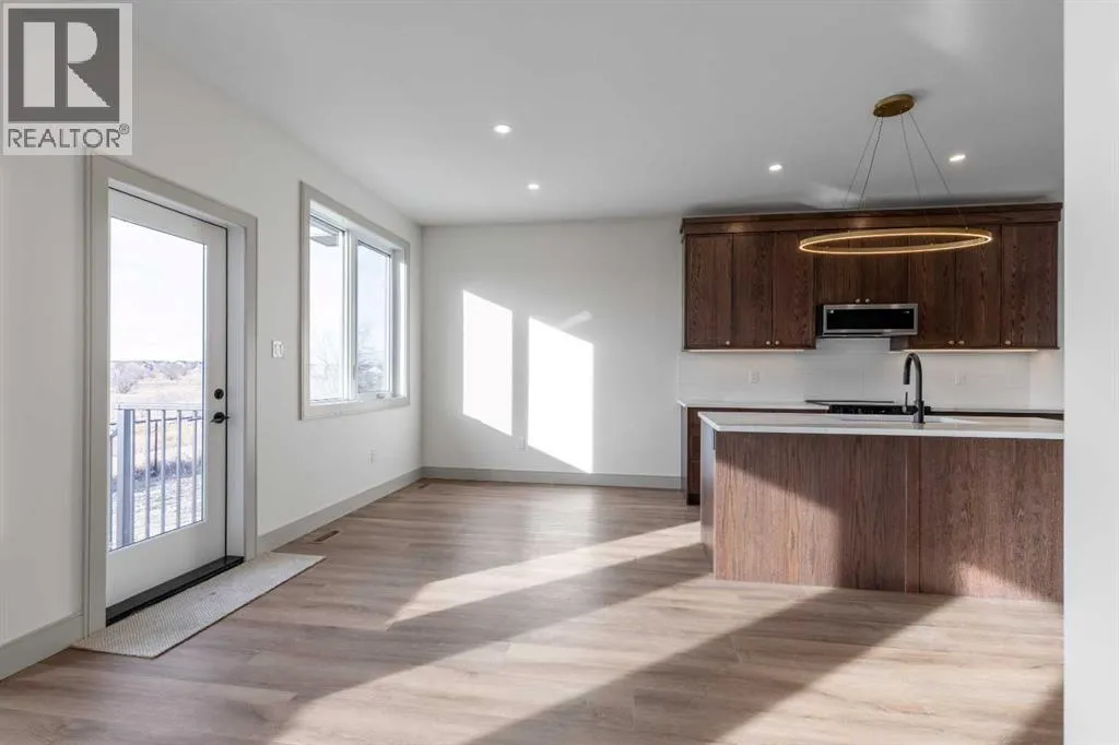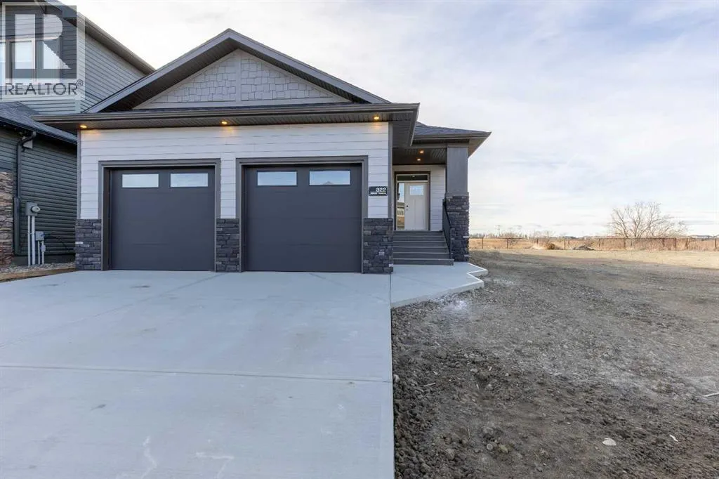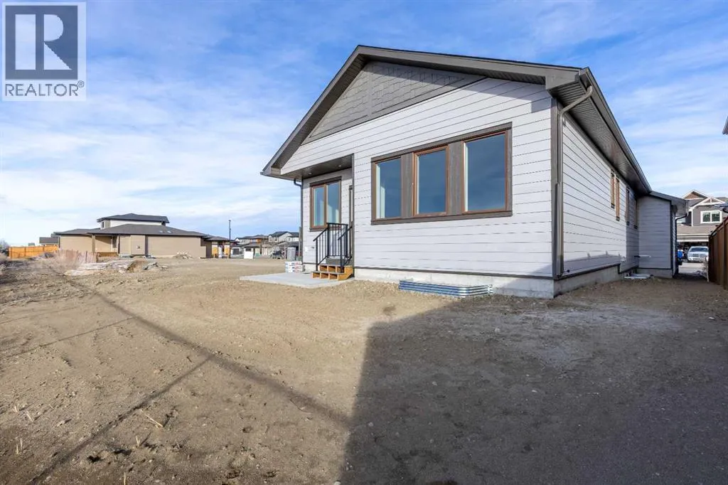 A thoughtfully designed bungalow by Janus Homes backing onto a green space - the ideal home for someone hoping for main floor living! It's not often you find bungalows, especially one with a view! This modern home enjoys a west-facing backyard, meaning you'll get to soak up the sun all summer! The tall ceilings, rich tones and elegant finishes lend themselves to the uniqueness of this build. There's a main floor laundry room, 4 piece bathroom with plentiful counter space and a spare bedroom or office, the primary suite boasts a tray ceiling with 4 piece ensuite (dual sinks!) and walk-in closet. The kitchen enjoys natural light that highlights the gorgeous walnut tones of the cabinetry, statement quartz counters and walk-in pantry. The basement is undeveloped but offers tons of space to make your own - including an additional 2 bedrooms and bathroom along with large family room. The yard has direct access to walking paths that connect to the coulees and Canyons Park! (id:27476)