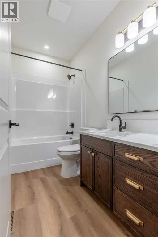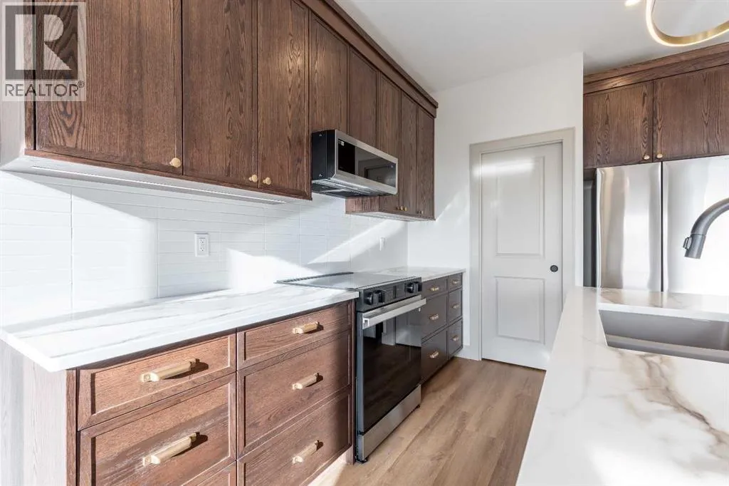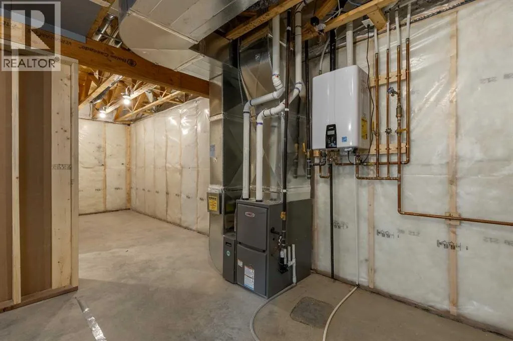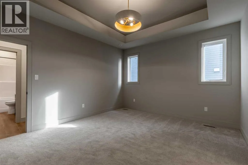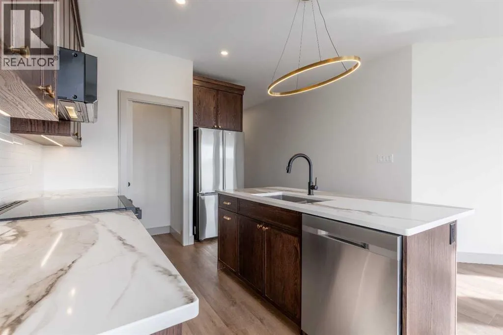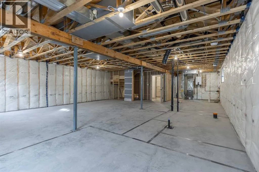 A thoughtfully designed bungalow by Janus Homes backing onto a green space - the ideal home for someone hoping for main floor living! It's not often you find bungalows, especially one with a view! This modern home enjoys a west-facing backyard, meaning you'll get to soak up the sun all summer! The tall ceilings, rich tones and elegant finishes lend themselves to the uniqueness of this build. There's a main floor laundry room, 4 piece bathroom with plentiful counter space and a spare bedroom or office, the primary suite boasts a tray ceiling with 4 piece ensuite (dual sinks!) and walk-in closet. The kitchen enjoys natural light that highlights the gorgeous walnut tones of the cabinetry, statement quartz counters and walk-in pantry. The basement is undeveloped but offers tons of space to make your own - including an additional 2 bedrooms and bathroom along with large family room. The yard has direct access to walking paths that connect to the coulees and Canyons Park! (id:27476)