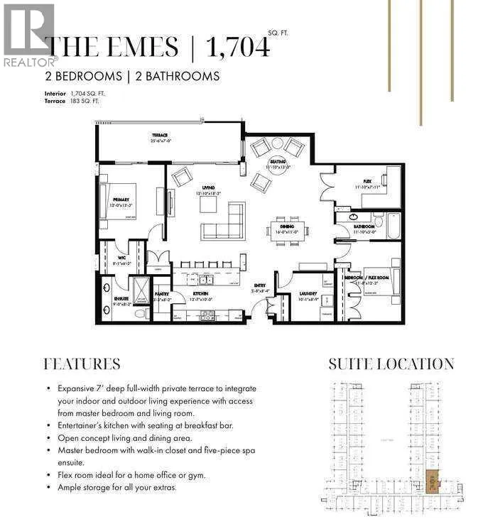 For more information, please click the "More Information" button. Step into a residence where thoughtful design meets modern luxury, offering a lifestyle of comfort, convenience, and sophistication. The spectacular 7-foot-deep private terrace seamlessly integrates the indoor and outdoor living experience. Enjoy direct access from both the primary bedroom and living room - ideal for relaxing mornings, evening gatherings, or entertaining guests in style. The entertainers kitchen is a chef's dream, featuring a spacious breakfast bar with seating. Perfect for hosting friends or enjoying casual family meals, this kitchen is the heart of the home. It's open-concept living area flows effortlessly into a separate dining space, creating a bright and inviting environment for gatherings, celebrations, or quiet evenings at home. Retreat to the primary bedroom, complete with a walk-in closet and four-piece ensuite. This private sanctuary offers comfort and elegance, providing the perfect escape at the end of the day. A versatile flex room adapts to needs - ideal as a hoe office gym, creative studio, or guest space. This suite provides ample storage solutions throughout, including a large walk-in pantry, ensuring there's a place for all the extras and essentials, keeping the home organized and clutter-free. Photos contain digitally rendered and/or sample images. (id:27476)