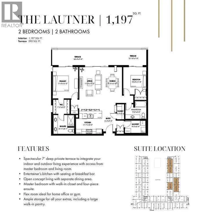 For more information, please click the "More Information" button. This exceptional property combines functional design with refined finishes, delivering a home that truly elevates everyday living. The expansive 7'-deep, full width private terrace seamlessly blending indoor and outdoor living, with elegant access from both primary bedroom, second bedroom and living room. Gourmet entertainer's kitchen with a stylish breakfast bar, perfect for casual dining and social gatherings. Sophisticated open-concept living and dining area designed for effortless flow and natural light. Luxurious primary suite featuring a spacious walk-in closet and a spa inspired four-piece ensuite. Photos contain digitally rendered and/or sample images. (id:27476)
