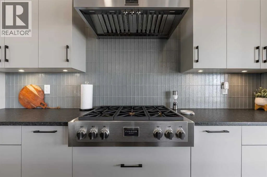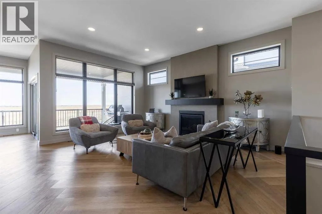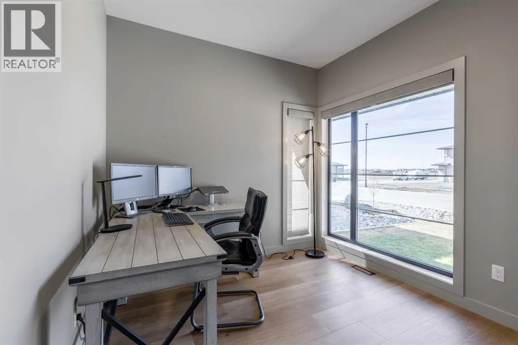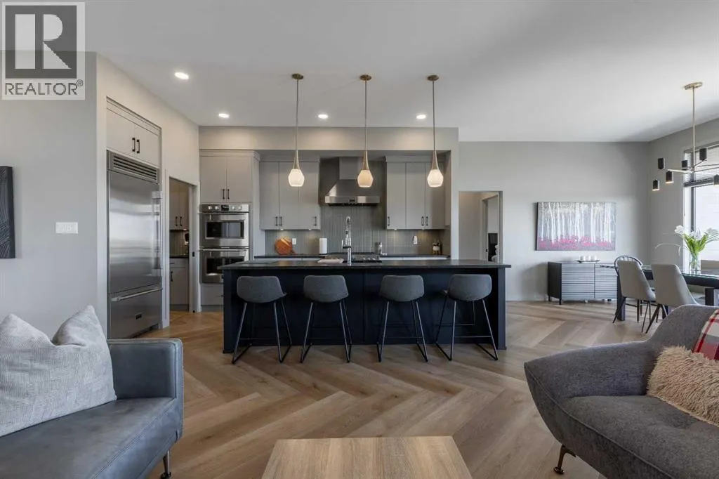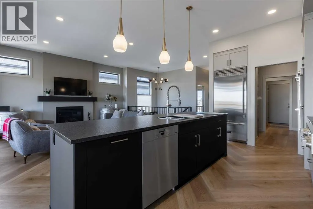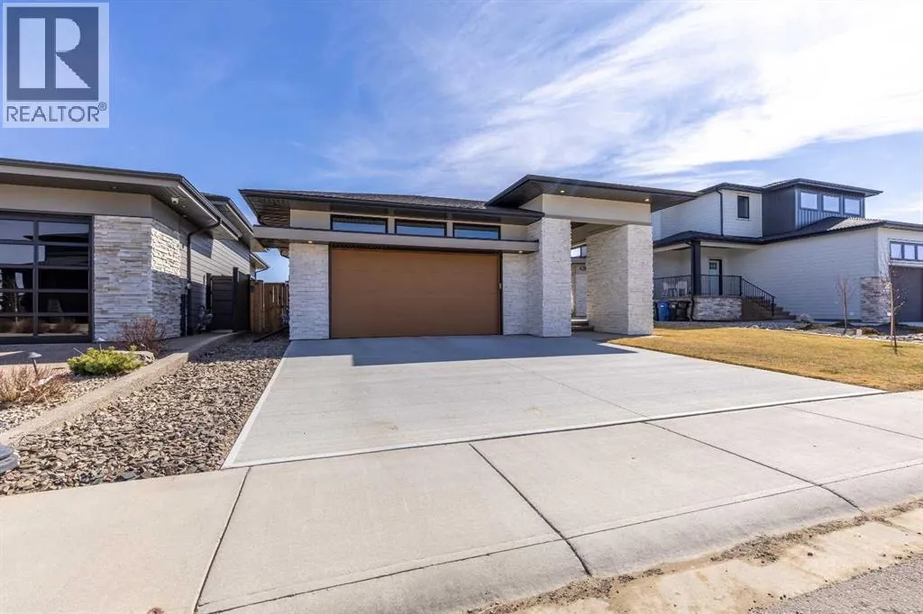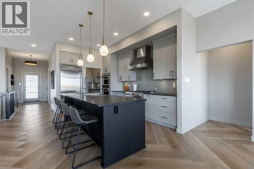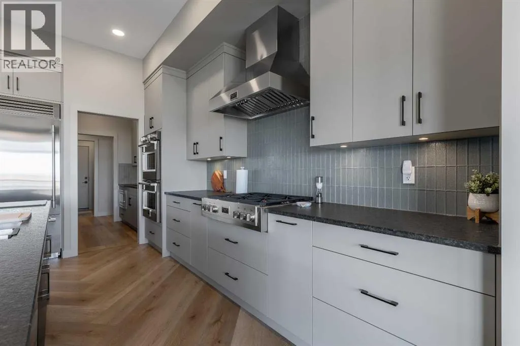 This stunning CUSTOM built bungalow is the executive home, steps away from Canyon Pond that you've been searching for! Loaded with high-end extras and great proximity to walking paths, this home is an ideal option for those looking for a quiet lifestyle with great views! The custom features start from the outside - a covered front entry that welcomes you to the grand entrance with soaring 10' ceilings and direct views to the backyard. There's custom herringbone flooring, a main floor office, open concept living area with gas fireplace, leathered granite counters throughout and the KITCHEN! These appliances are made for those who love to cook: a 6 burner Fulgor Milano Sofia gas cooktop, double oven, 36" professional series fridge, stylish butlers pantry and plentiful storage. The primary suite enjoys its own section of the main floor with beautiful views, a 4 piece ensuite with fully tiled shower with 3 shower heads and a huge walk-in closet that connects to the laundry room. The walk-out basement continues the theme of soaring 9' ceilings, boasts a wet bar, gym area with glass wall, 2 bedrooms that share a 5 piece bathroom (with separate toilet/shower room), stylish gas fireplace and even more storage space! The owners added 2" of foam insulation to the flooring in the basement for extra comfort, there's a dual-zone furnace, custom Hunter Douglas blinds throughout and underground sprinklers with Hunter Hydrawise controlled app! The extra large garage provides abundant space for vehicles (can fit a truck!), storage or projects and it is complete with a utility sink. (id:27476)
