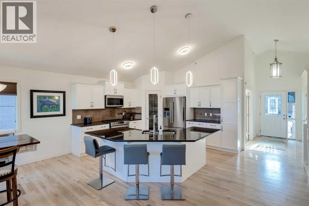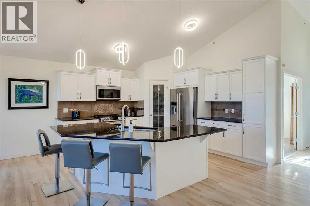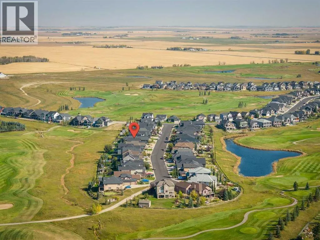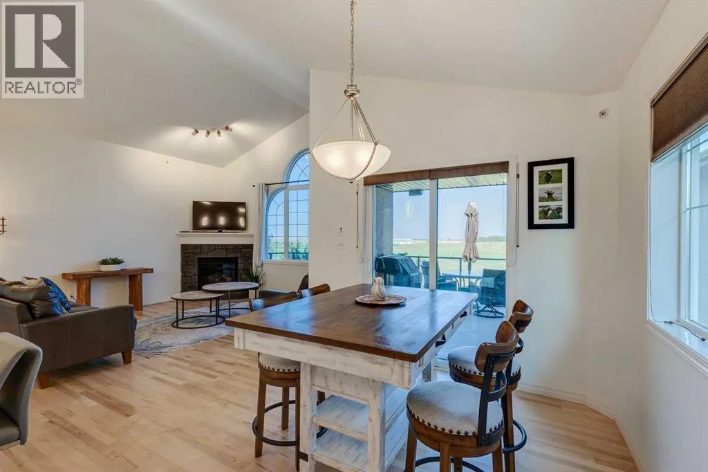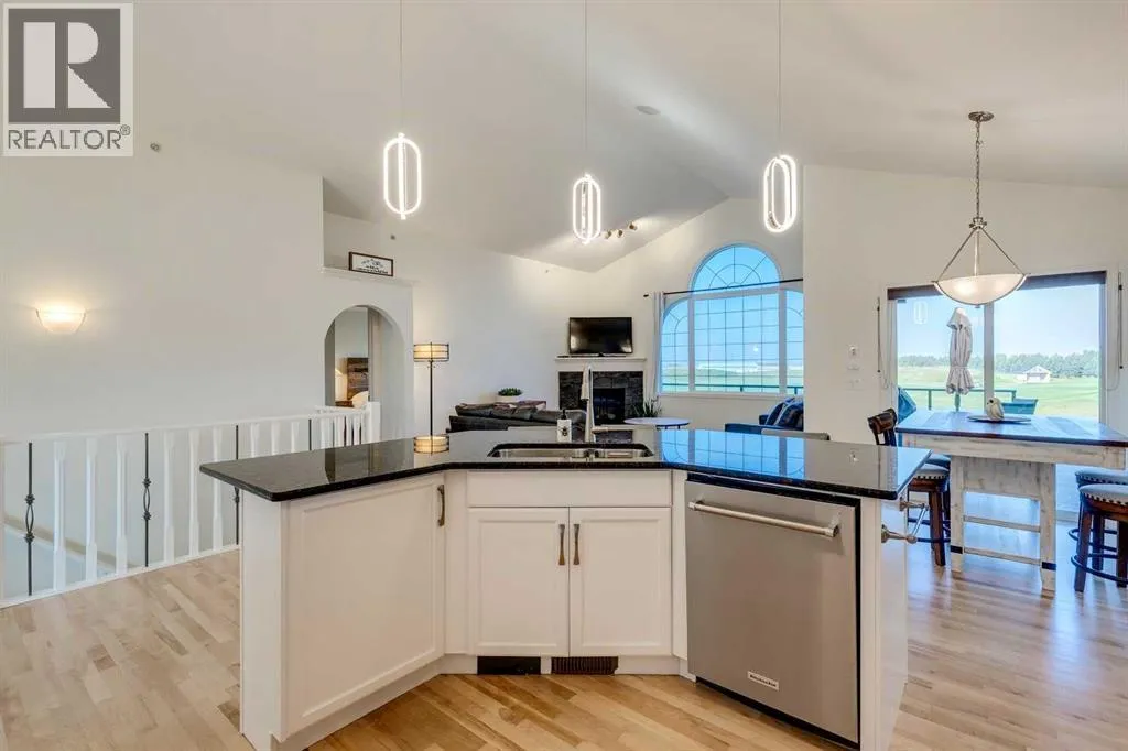 Your Dream Walk-Out Bungalow Awaits - Discover the Hidden Gem of The Lakes of MuirfieldTucked into the serene community of Lyalta, this beautifully appointed walk-out bungalow offers over 3,000 sq.ft. of thoughtfully designed living space, blending comfort, style, and functionality. The heated, oversized double garage adds convenience, while the homeâs layout caters perfectly to modern living.Step into a freshly painted main level bathed in natural light, where an airy open-concept design welcomes you. The chef-inspired kitchen is a true centerpiece, showcasing a sleek eat-up island, granite countertops, a spacious corner pantry, and brand-new stainless-steel appliances. Re-sprayed cabinetry and updated light fixtures add a crisp, contemporary flair.The expansive primary suite is a private retreat, featuring a spa-like ensuite with dual sinks, a luxurious soaker tub, separate shower, and a walk-in closet ready for your custom touch. The cozy living room invites relaxation with its corner gas fireplace, while patio doors from the dining area open to a west-facing deckâideal for morning coffee or sunset cocktails. Central air conditioning ensures year-round comfort.A bright main floor den offers versatility for work or quiet reading, complemented by a stylish 2-piece bath and a convenient laundry room.Downstairs, the walk-out basement extends your living space with a spacious family room overlooking the golf course. A second corner gas fireplace adds warmth, while the sleek wet bar sets the stage for effortless entertaining. Two additional bedrooms, a full 3-piece bath, and a generous storage room complete this level with practicality and charm.Outside, the west-facing backyard is designed for low-maintenance enjoyment, featuring beautifully arranged gardens and a spacious shed for all your outdoor essentials.Whether you're downsizing, starting fresh, or seeking a tranquil place to call home, this property delivers. Experience the timeless appeal of The Lakes o f Muirfieldâjust 15 minutes from Strathmore, Langdon, or Chestermere, and only 20 minutes to Calgary. (id:27476)