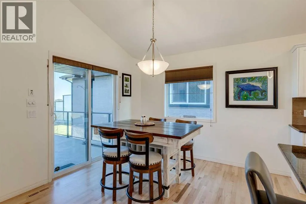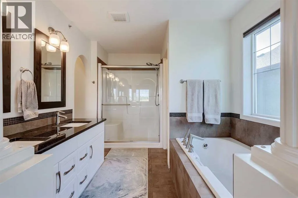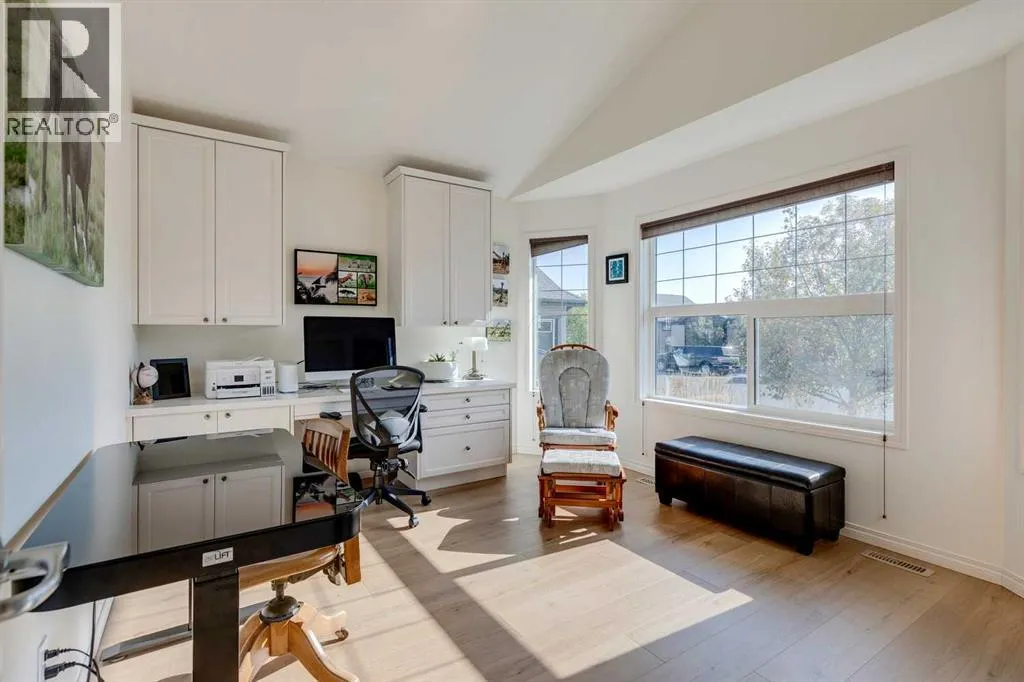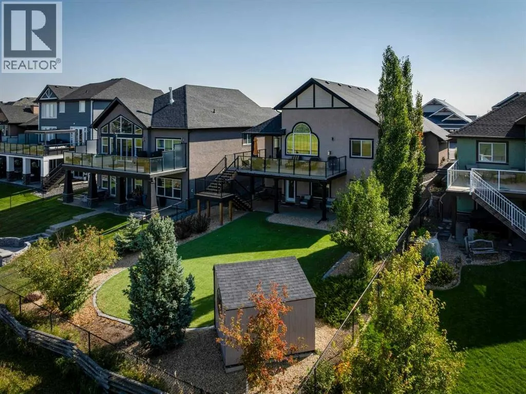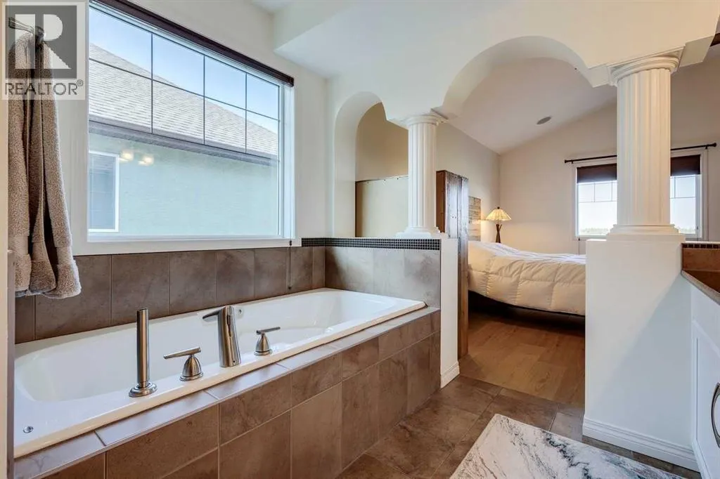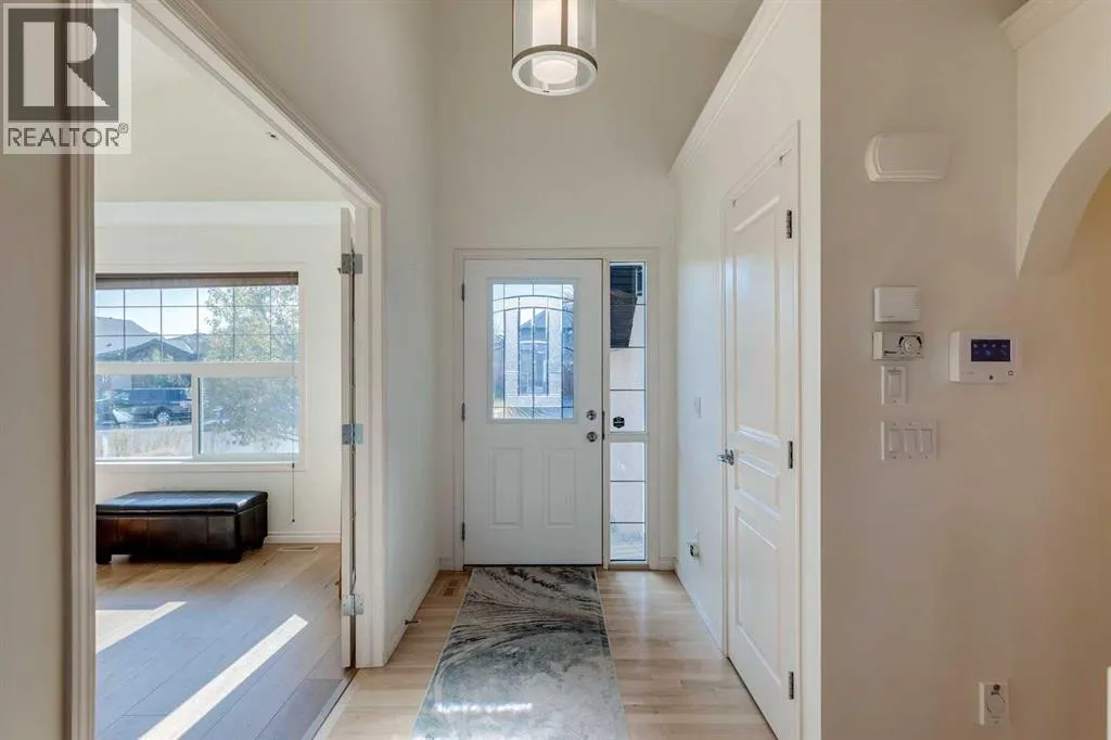 Your Dream Walk-Out Bungalow Awaits - Discover the Hidden Gem of The Lakes of MuirfieldTucked into the serene community of Lyalta, this beautifully appointed walk-out bungalow offers over 3,000 sq.ft. of thoughtfully designed living space, blending comfort, style, and functionality. The heated, oversized double garage adds convenience, while the homeâs layout caters perfectly to modern living.Step into a freshly painted main level bathed in natural light, where an airy open-concept design welcomes you. The chef-inspired kitchen is a true centerpiece, showcasing a sleek eat-up island, granite countertops, a spacious corner pantry, and brand-new stainless-steel appliances. Re-sprayed cabinetry and updated light fixtures add a crisp, contemporary flair.The expansive primary suite is a private retreat, featuring a spa-like ensuite with dual sinks, a luxurious soaker tub, separate shower, and a walk-in closet ready for your custom touch. The cozy living room invites relaxation with its corner gas fireplace, while patio doors from the dining area open to a west-facing deckâideal for morning coffee or sunset cocktails. Central air conditioning ensures year-round comfort.A bright main floor den offers versatility for work or quiet reading, complemented by a stylish 2-piece bath and a convenient laundry room.Downstairs, the walk-out basement extends your living space with a spacious family room overlooking the golf course. A second corner gas fireplace adds warmth, while the sleek wet bar sets the stage for effortless entertaining. Two additional bedrooms, a full 3-piece bath, and a generous storage room complete this level with practicality and charm.Outside, the west-facing backyard is designed for low-maintenance enjoyment, featuring beautifully arranged gardens and a spacious shed for all your outdoor essentials.Whether you're downsizing, starting fresh, or seeking a tranquil place to call home, this property delivers. Experience the timeless appeal of The Lakes o f Muirfieldâjust 15 minutes from Strathmore, Langdon, or Chestermere, and only 20 minutes to Calgary. (id:27476)