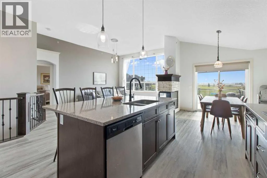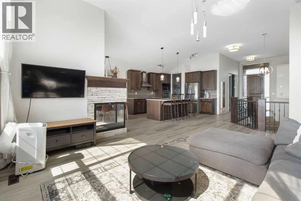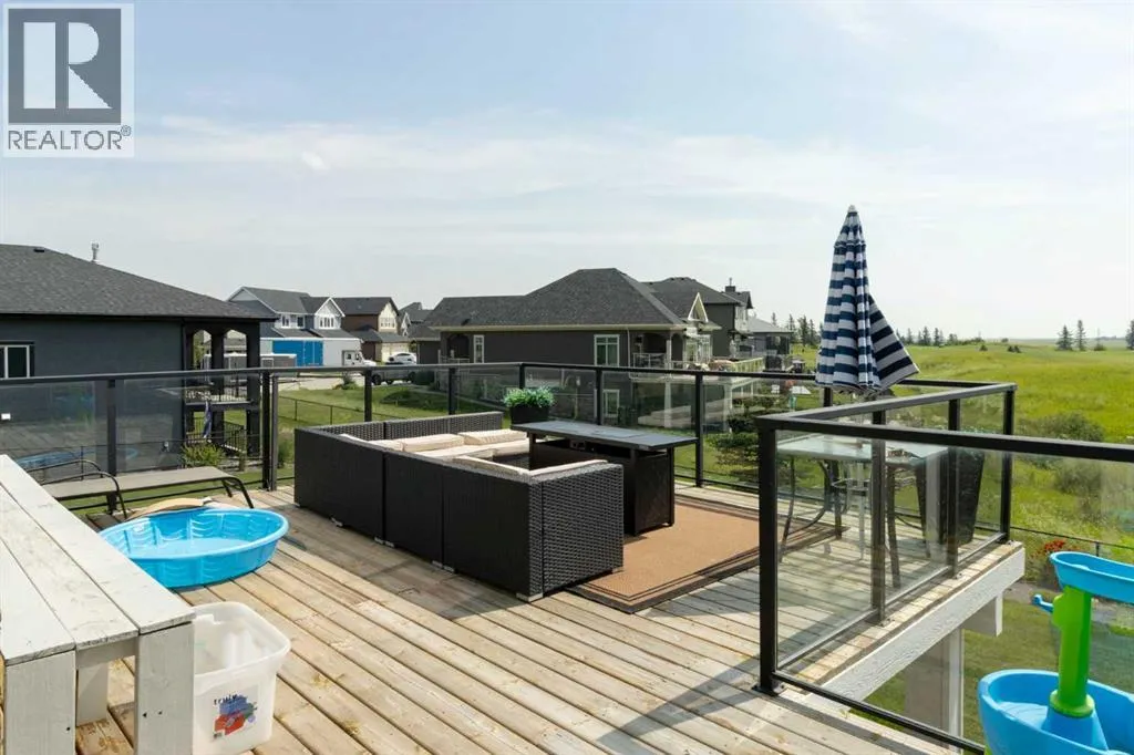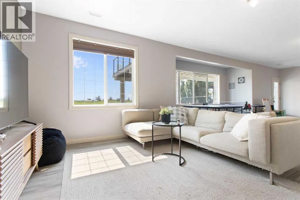 Welcome to this stunning walkout bungalow on a quiet cul-de-sac, backing onto the peaceful links of Muirfield Lakes Golf Course. Soaring vaulted ceilings and a wall of windows frame breathtaking golf-course views. As you enter, youâll find a versatile flex roomâperfect for a home office or extra bedroom. The main floor opens to a chefâs kitchen featuring quartz countertops, plenty of cabinetry, a cooktop, wall oven, and a large corner pantry. The kitchen flows into the dining and living areas, anchored by a stylish three-sided fireplace and spectacular vistas of the course. The primary suite is spacious with vaulted ceilings, serene views, a spacious walk-in closet, and a spa-inspired ensuite with a double vanity, soaker tub, and separate shower. The ensuite connects conveniently to the laundry room. Step outside to the expanded raised deckâideal for entertaining or relaxingâwhere you can enjoy unobstructed views and stunning sunsets. Low-maintenance landscaping and a fully fenced yard complete the scene. The finished walkout basement adds a large bedroom, full bathroom, and a welcoming rec room that opens to the backyard. An attached oversized double garage provides ample space for vehicles, storage, and a workshop. Located in the golf-course community of Lakes of Muirfield, just 20 minutes from Calgary, Airdrie, and Strathmore. (id:27476)