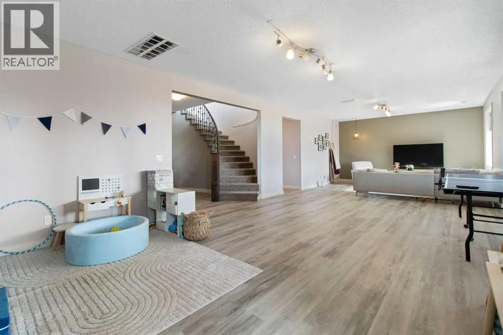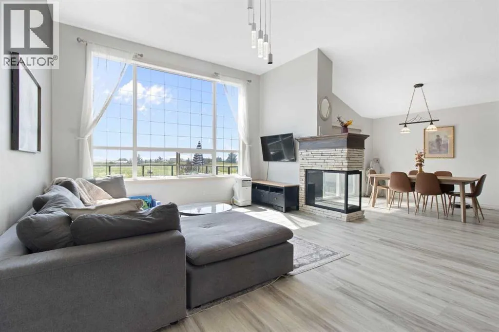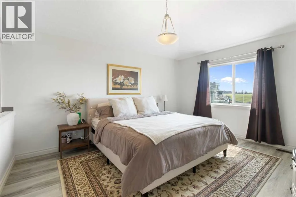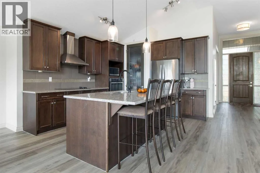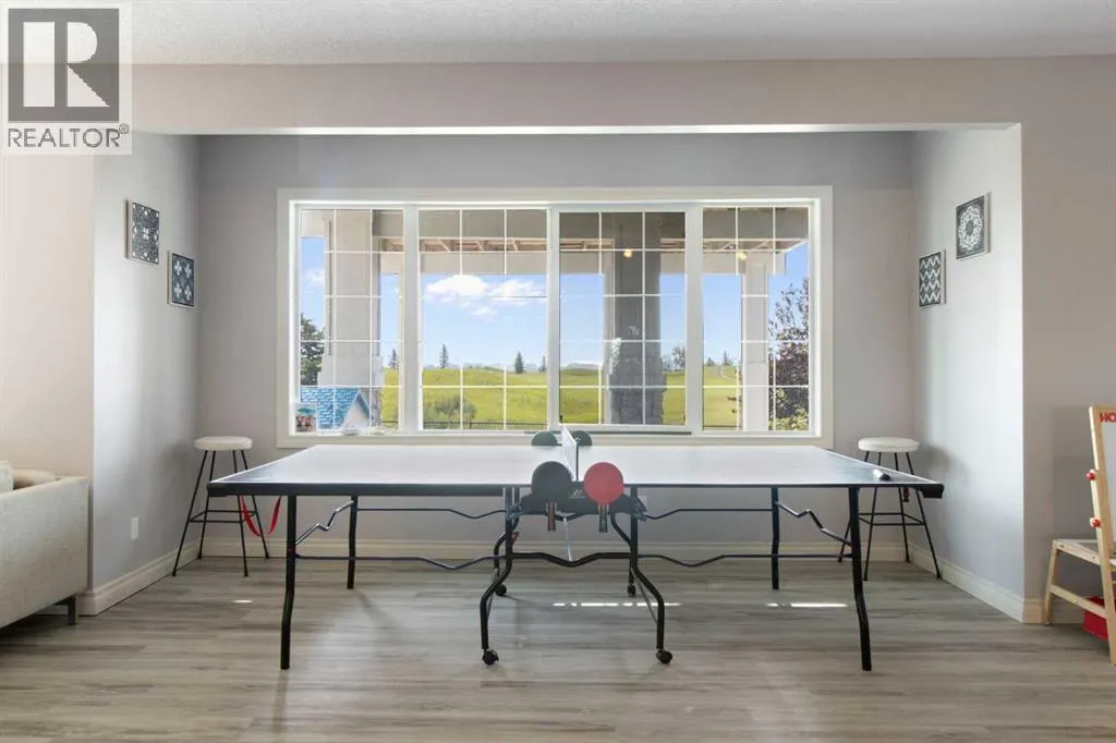 Welcome to this stunning walkout bungalow on a quiet cul-de-sac, backing onto the peaceful links of Muirfield Lakes Golf Course. Soaring vaulted ceilings and a wall of windows frame breathtaking golf-course views. As you enter, youâll find a versatile flex roomâperfect for a home office or extra bedroom. The main floor opens to a chefâs kitchen featuring quartz countertops, plenty of cabinetry, a cooktop, wall oven, and a large corner pantry. The kitchen flows into the dining and living areas, anchored by a stylish three-sided fireplace and spectacular vistas of the course. The primary suite is spacious with vaulted ceilings, serene views, a spacious walk-in closet, and a spa-inspired ensuite with a double vanity, soaker tub, and separate shower. The ensuite connects conveniently to the laundry room. Step outside to the expanded raised deckâideal for entertaining or relaxingâwhere you can enjoy unobstructed views and stunning sunsets. Low-maintenance landscaping and a fully fenced yard complete the scene. The finished walkout basement adds a large bedroom, full bathroom, and a welcoming rec room that opens to the backyard. An attached oversized double garage provides ample space for vehicles, storage, and a workshop. Located in the golf-course community of Lakes of Muirfield, just 20 minutes from Calgary, Airdrie, and Strathmore. (id:27476)