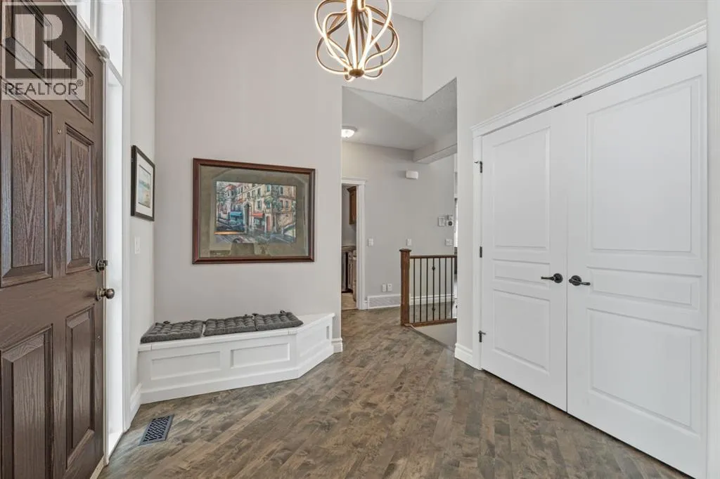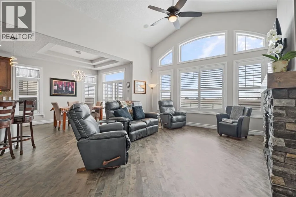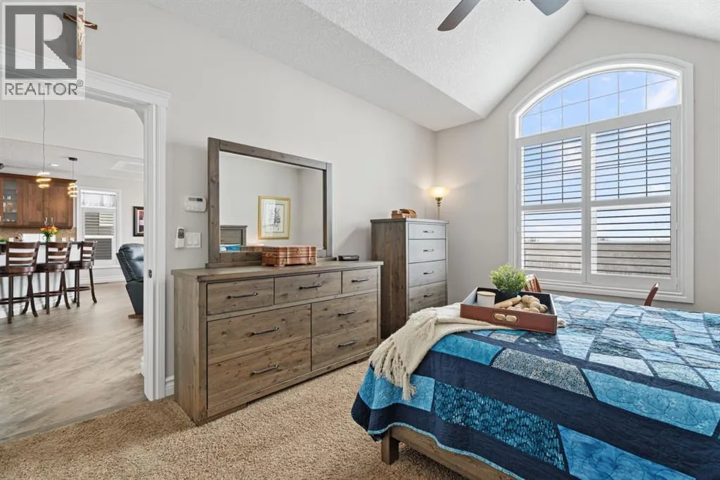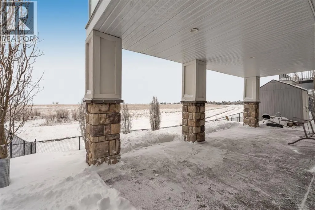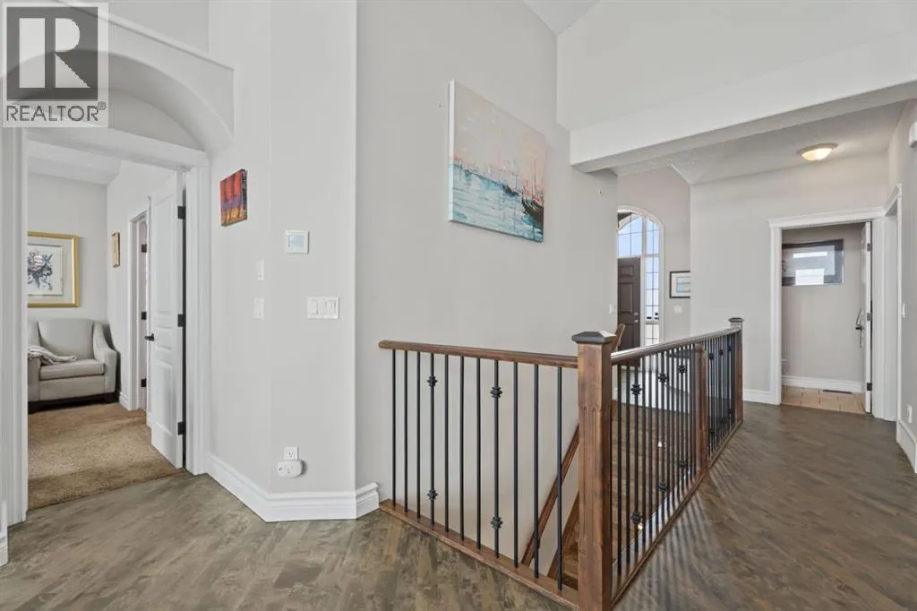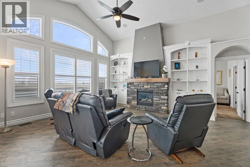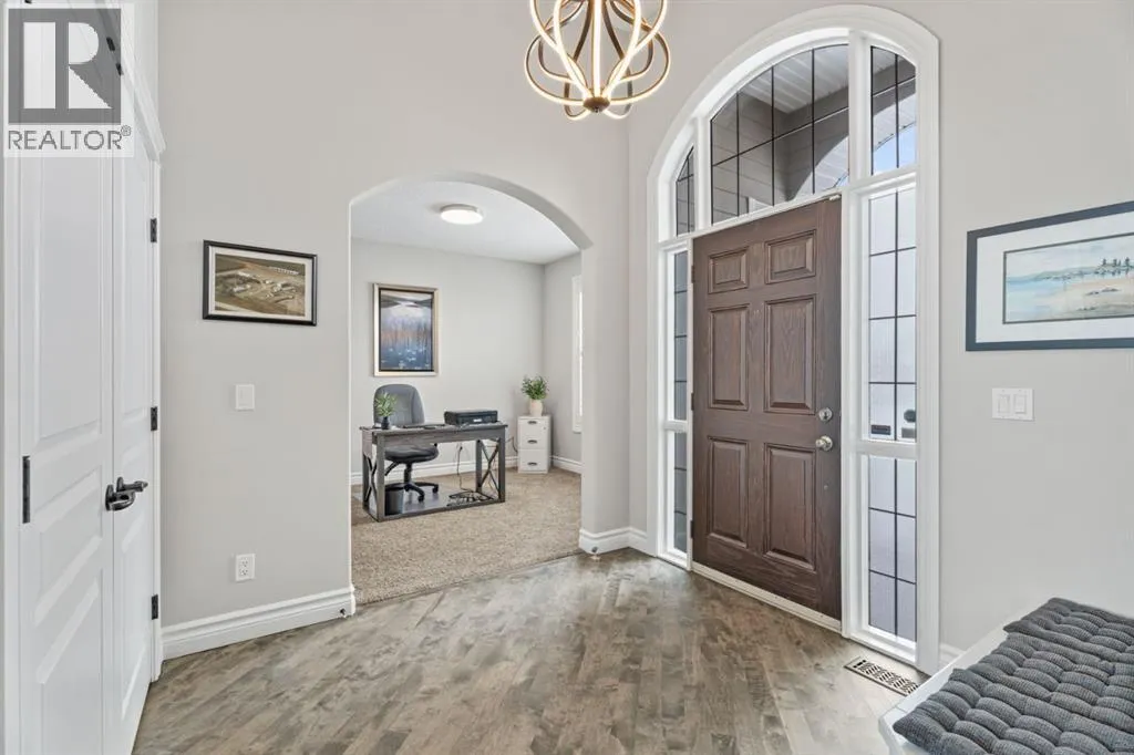 Welcome to golf course living and this beautiful well maintained walk out bungalow in the country. As you step inside, you will marvel at the large foyer and open floor plan, vaulted ceilings, refurbished hardwood floors and upgraded luxury vinyl tile in the kitchen and pantry. Take in the abundance of natural light from the large living room and pocket windows in the kitchen. This open and cozy upper main level offers so much space, including a comfortable office/den, large kitchen with granite counters and breakfast bar, walk through pantry with pocket doors and main floor laundry, extended cabinets, built in storage benches and under cabinet lighting. The feature fireplace offers warmth and ambience for those cold winter nights. Enjoy the oversized garage, extra wide driveway, work bench and tool wall for working on various projects with plenty of shelving for storage. Enjoy the pristine view of wildlife and golfers off of the large deck and invite neighbours, family and friends to join you on the aggregate patio below. The front and backyard are fully landscaped and an automatic underground sprinkler system is in place. This community is 30 minutes from Calgary, 20 minutes to Chestermere and 20 minutes from Strathmore. Enjoy time on the 18 Hole Golf Course, a secure RV Storage lot exclusive to Lakes of Muirfield Residents and the natural landscapes of country living and wildlife backing onto the canal! Book your showing today with your favourite REALTOR®. (id:27476)