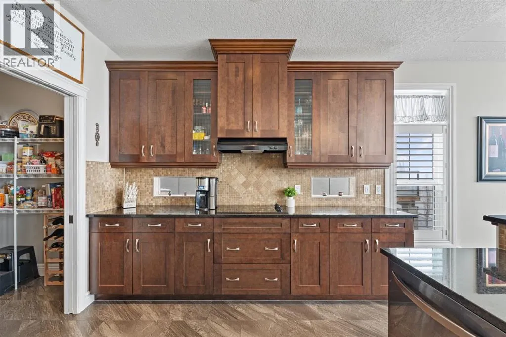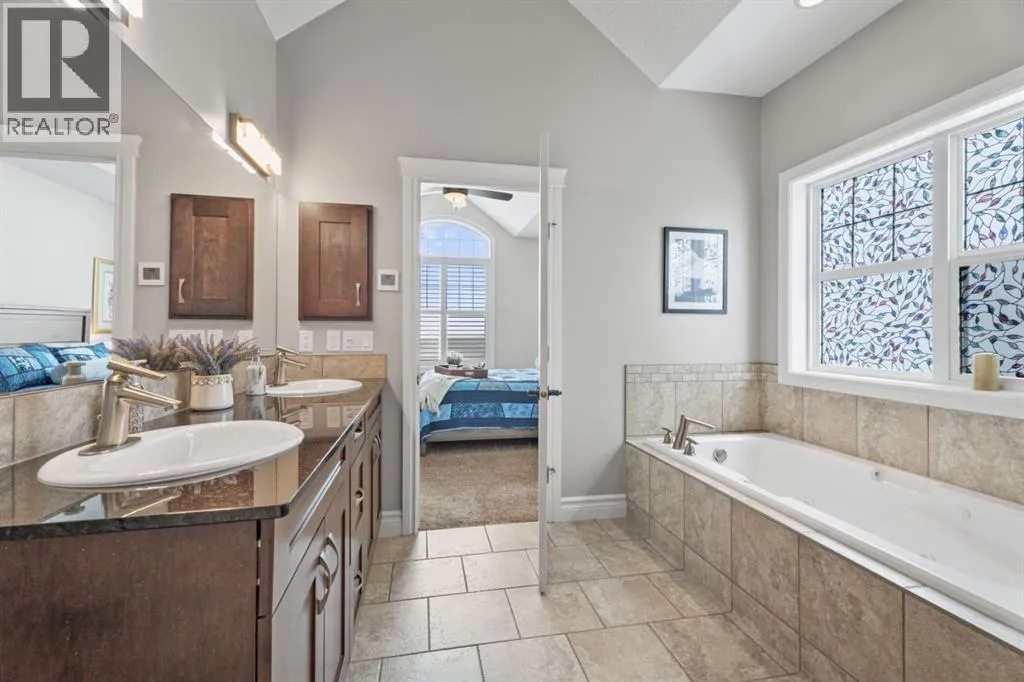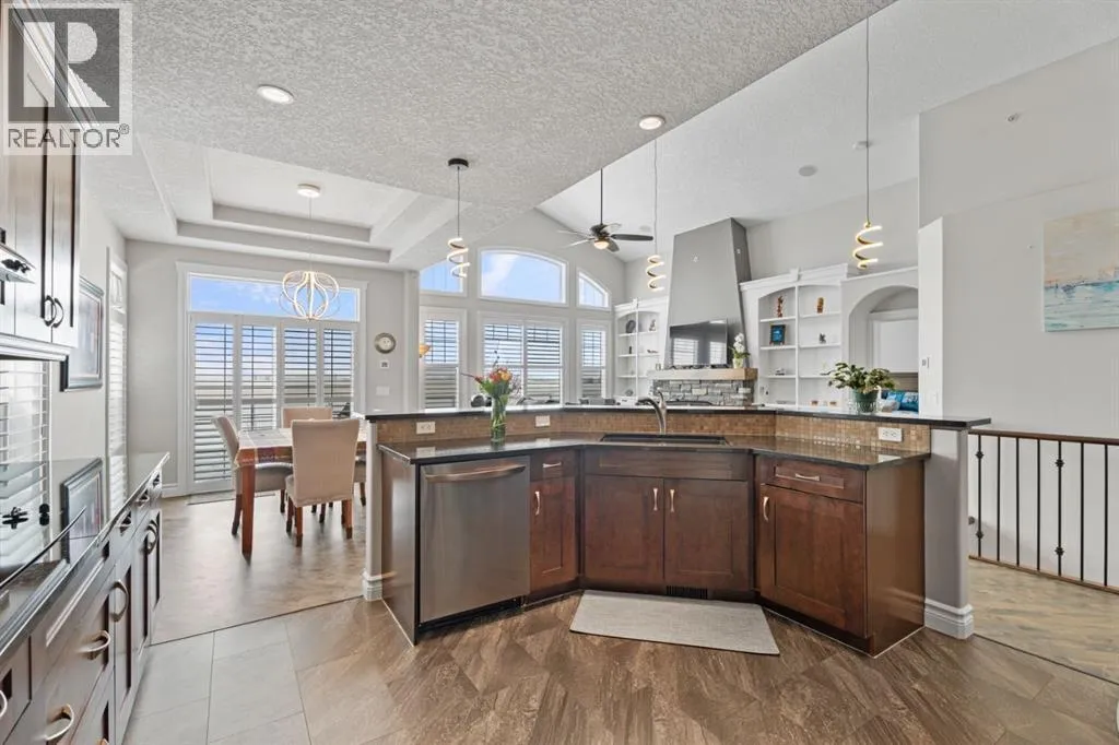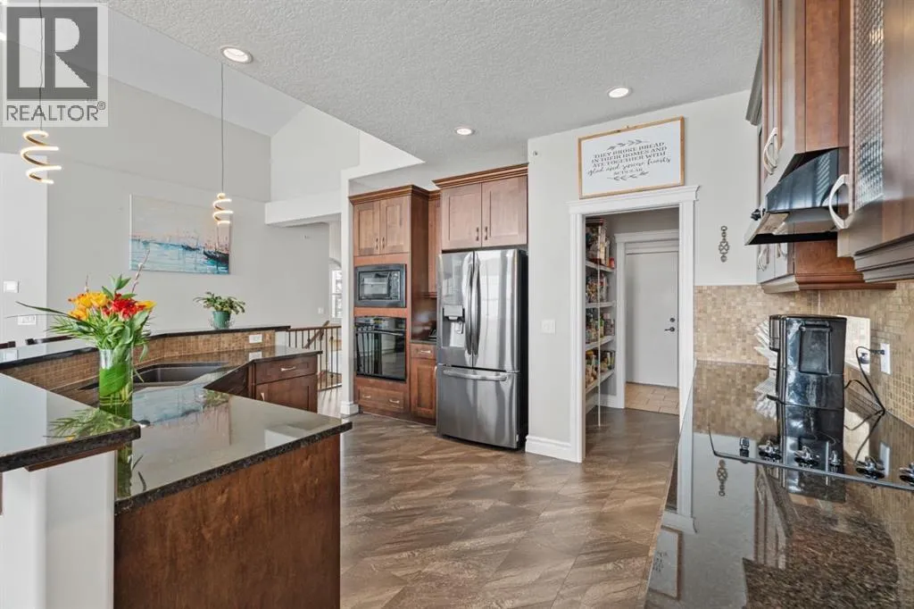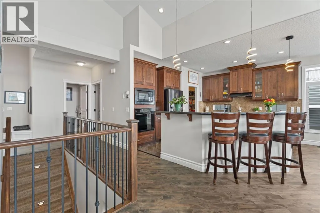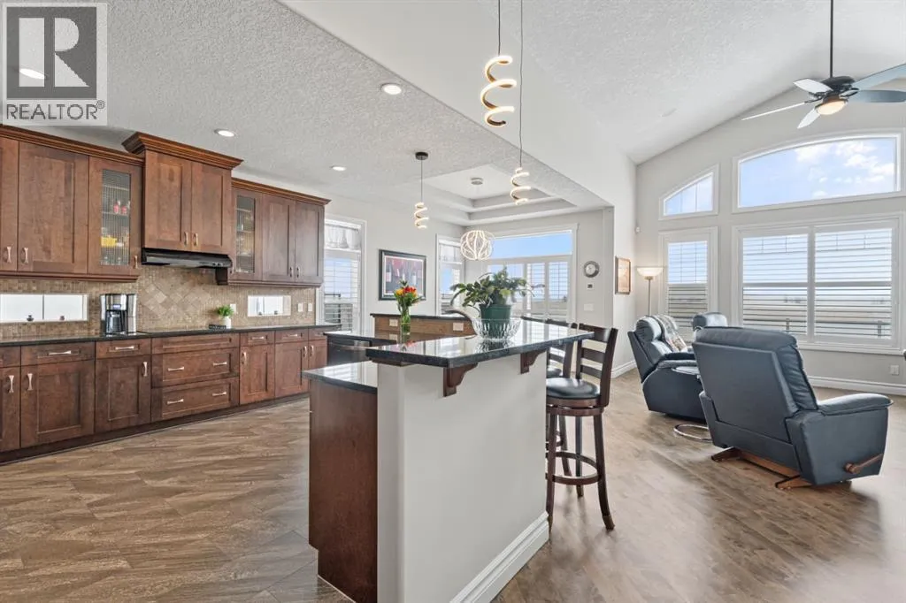Welcome to golf course living and this beautiful well maintained walk out bungalow in the country. As you step inside, you will marvel at the large foyer and open floor plan, vaulted ceilings, refurbished hardwood floors and upgraded luxury vinyl tile in the kitchen and pantry. Take in the abundance of natural light from the large living room and pocket windows in the kitchen. This open and cozy upper main level offers so much space, including a comfortable office/den, large kitchen with granite counters and breakfast bar, walk through pantry with pocket doors and main floor laundry, extended cabinets, built in storage benches and under cabinet lighting. The feature fireplace offers warmth and ambience for those cold winter nights. Enjoy the oversized garage, extra wide driveway, work bench and tool wall for working on various projects with plenty of shelving for storage. Enjoy the pristine view of wildlife and golfers off of the large deck and invite neighbours, family and friends to join you on the aggregate patio below. The front and backyard are fully landscaped and an automatic underground sprinkler system is in place. This community is 30 minutes from Calgary, 20 minutes to Chestermere and 20 minutes from Strathmore. Enjoy time on the 18 Hole Golf Course, a secure RV Storage lot exclusive to Lakes of Muirfield Residents and the natural landscapes of country living and wildlife backing onto the canal! Book your showing today with your favourite REALTOR®. (id:27476)