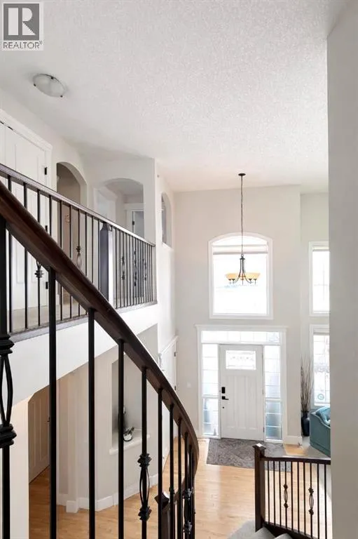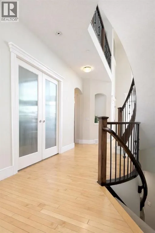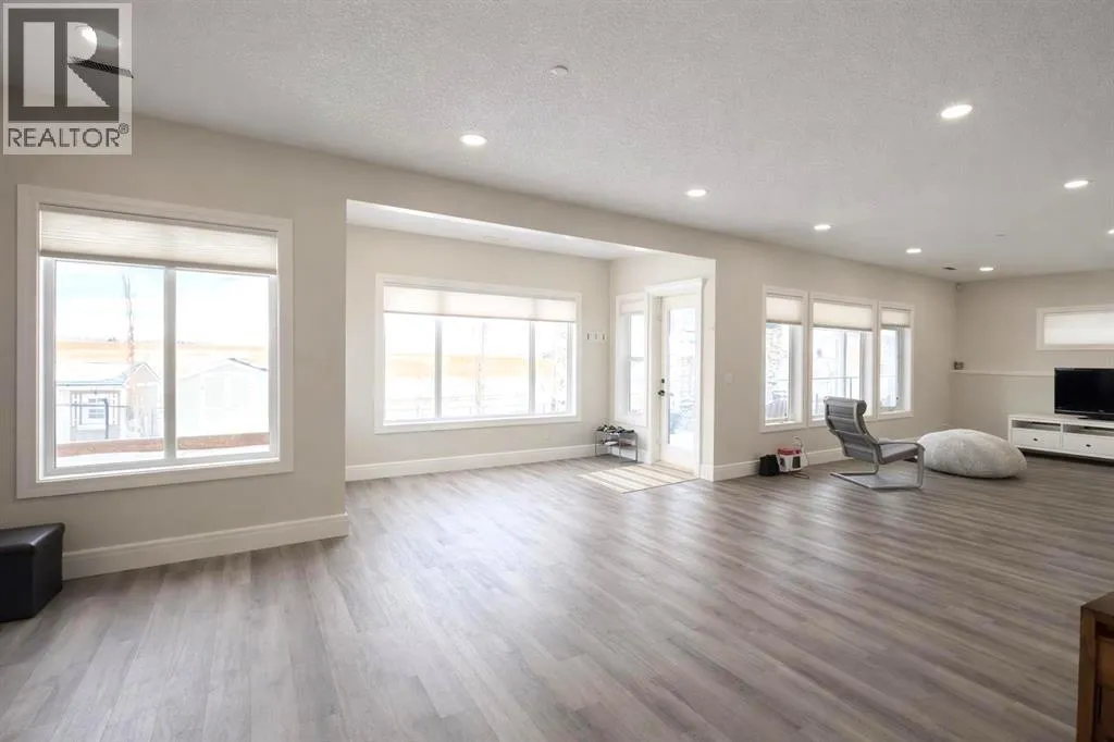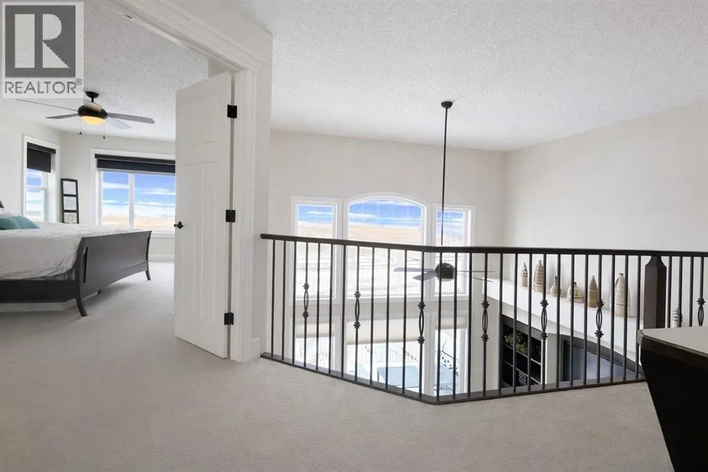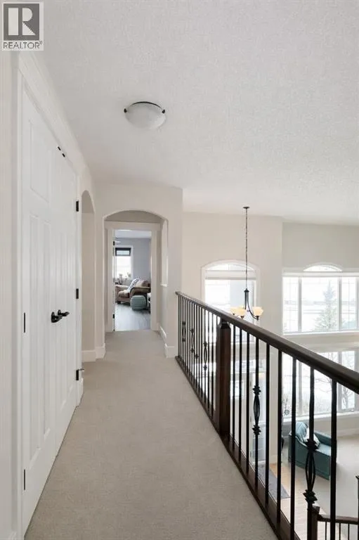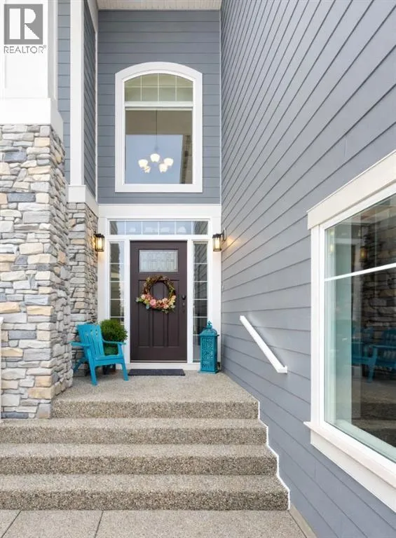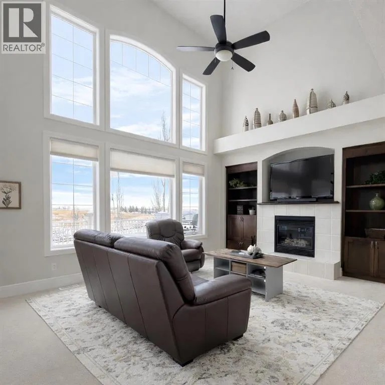 Introducing this amazing luxury home in the prestigious âLakes of Muirfieldââoffering over 4,200 sq ft of developed living space, perfectly positioned backing onto the canal and golf course with greenspace to the side and rear, creating a rare private setting with no neighbours behind! This stunning residence showcases 4 bedrooms and 4 bathrooms, impressive curb appeal, and a grand interior featuring hardwood flooring and a striking curved staircase. The main level boasts a vaulted family room with oversized windows open to above, a formal dining room, and an elegant open-to-above living room, flooded with natural light. The spacious kitchen is designed for both function and style with rich cappuccino cabinetry, a corner pantry, a large sit-up island with prep sink, an additional main sink overlooking the views, and a bright dining nook with tray ceiling and direct access to the large deck with gas line for BBQâperfect for entertaining. A private office/den with sleek sliding pocket doors and a powder room complete this level. Upstairs, a grand double-door entry leads to the luxurious primary retreat featuring a spa-inspired ensuite with oversized shower, standalone soaker tub, dual vanities, and a generous walk-in closet, while two additional bedroomsâboth with walk-in closetsâalong with a full bathroom and convenient upper laundry complete the upper floor, all enhanced by open-to-below design elements that elevate the homeâs sense of space and elegance. The fully developed basement offers vinyl plank flooring throughout, a large recreation/entertainment space, gym area, fourth bedroom, and full bathroom, with direct access to a covered patio and beautifully landscaped yard featuring a pergola and shed, all set against serene canal and golf course views. Note, New roof, siding & trim! Ideally located just minutes to Strathmore, Langdon, and Chestermere, with an easy 20-minute commute to Calgary and close proximity to the new De Havilland plantâthis is luxury living in a peaceful, scenic setting. (id:27476)