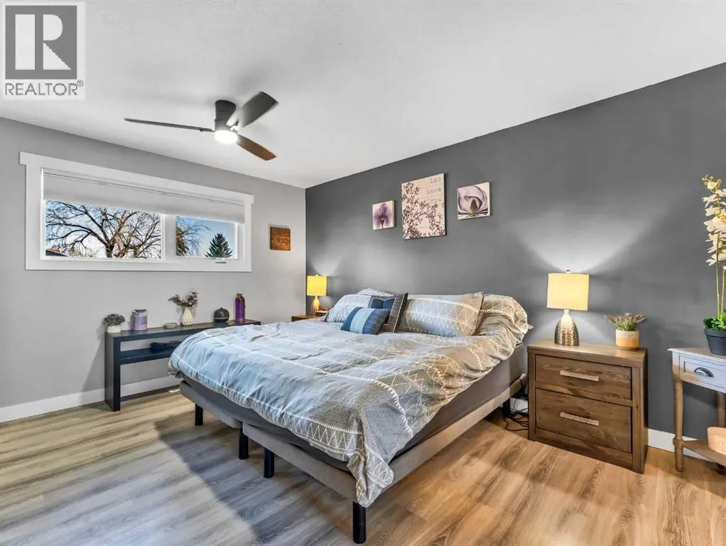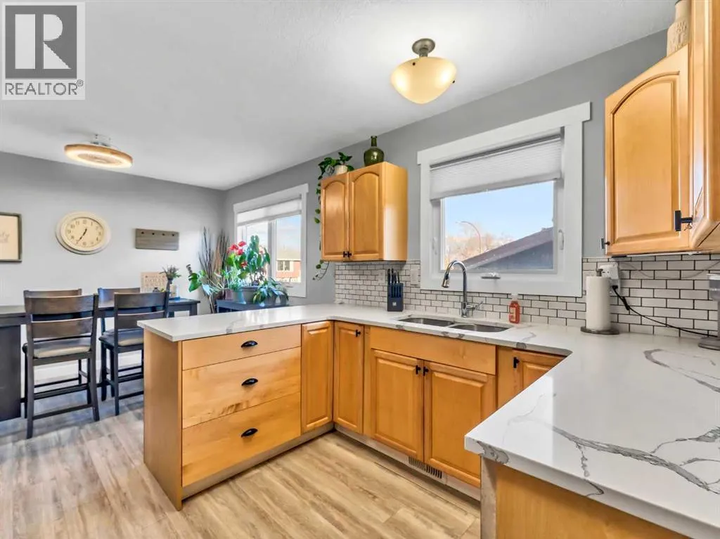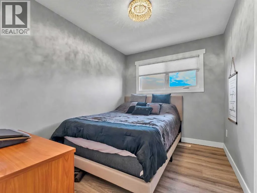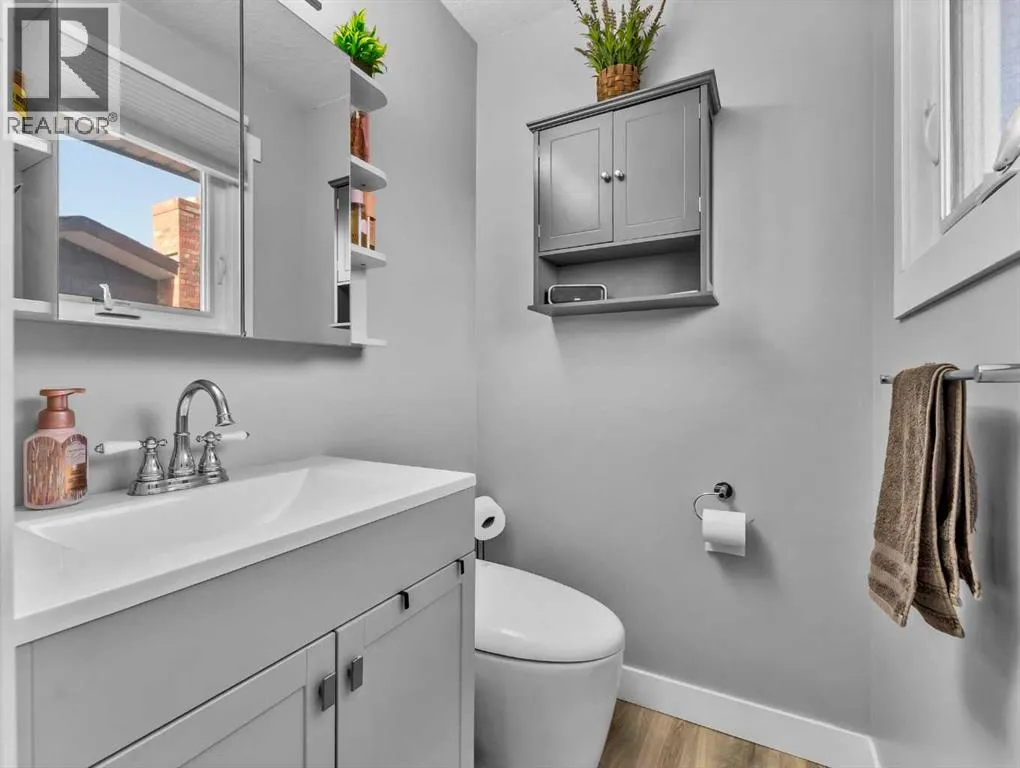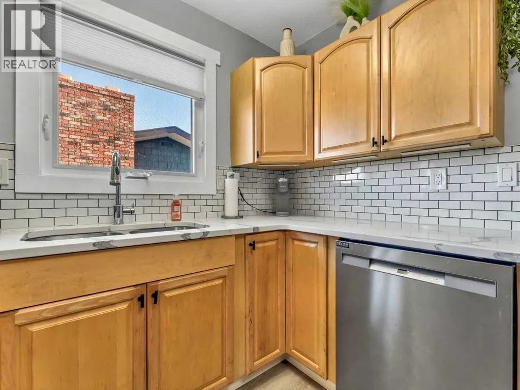 Welcome to this beautifully renovated bi-level home, ideally situated on a large corner lot in a NE Crescent Heights sought-after neighborhood. Located adjacent to a green space with a playground, this home is perfectly positioned for families, kids, or visiting grandkids to enjoy outdoor fun just steps from your door. Updated from top to bottom, this move-in-ready home showcases modern flooring, updated lighting, new windows, new kitchen and bathrooms, and fresh paint throughout. The inviting layout is filled with bright natural light and offers a warm, cozy feel from the moment you step inside. Convenient locker-style closets at both the front and back entrances add everyday functionality and organization. The main level features two bedrooms, including a spacious primary bedroom with a two-piece ensuite, a generous walk-in closet with built-in shelving, and the added convenience of a stackable washer and dryer. The fully developed basement offers a comfortable family room, two additional bedrooms, a four-piece bathroom, ample storage, and a second laundry area with washer and dryerâperfect for busy households or guests. Outside, the fully fenced yard is beautifully landscaped with underground sprinklers, offering both privacy and ease of maintenance. An oversized 24â x 28â garage, ample driveway space, and additional off-street parking provide excellent parking options. Added features include all window coverings, exterior security cameras, and a doorbell camera for peace of mind. Located close to the Medicine Hat Golf & Country Club, Big Marble Go Centre, shopping, dining, and amenities, this home combines lifestyle, location, and quality in one exceptional package. With outstanding curb appeal and nothing left to do but move in, this home wonât last long. (id:27476)