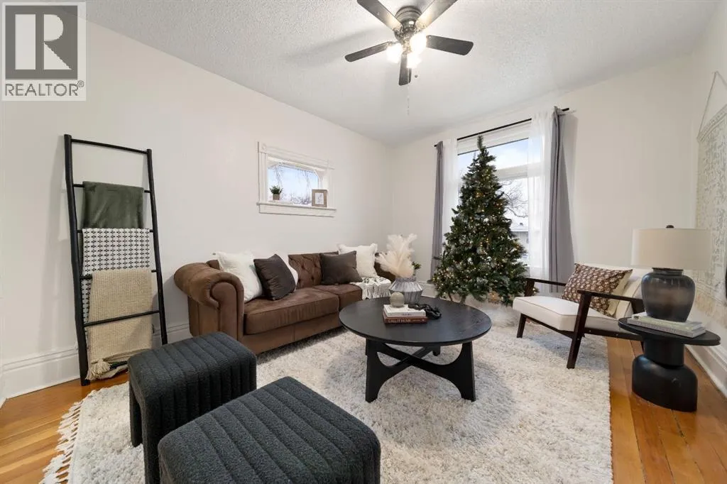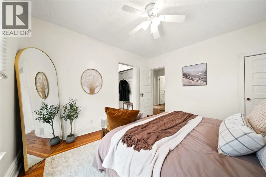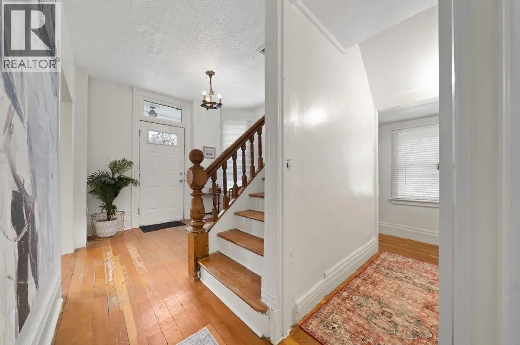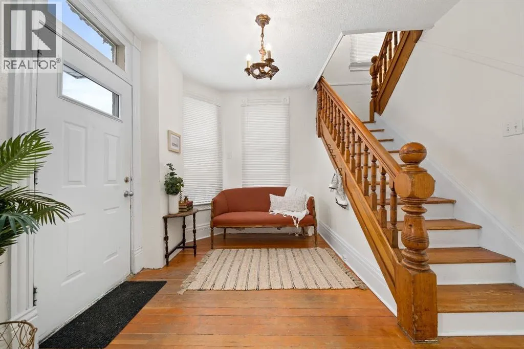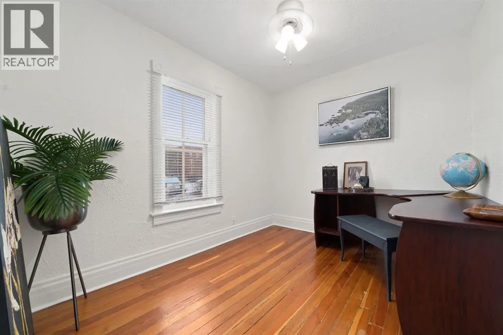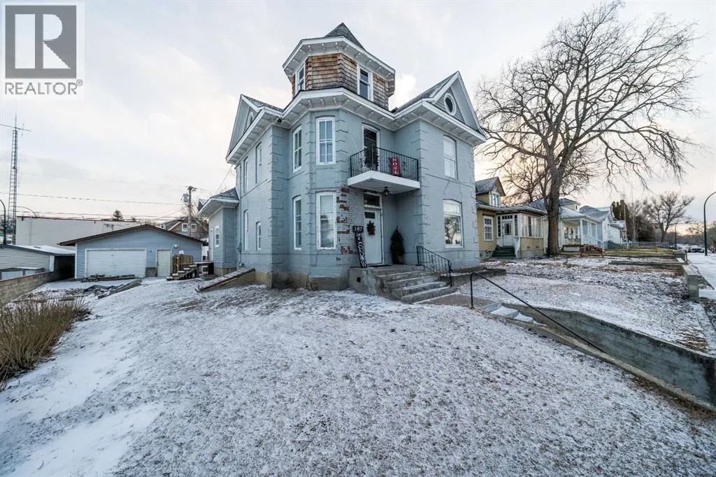 Step into a storybook at this enchanting 1906 character home. With its striking turret and castle like presence, this home is truly one of a kind!! Inside, youâre greeted by a warm and welcoming entryway showcasing the grand original staircase. The main floor flows beautifully through the living room, dining area and upgraded kitchen, making it perfect for both everyday living and entertaining. Upstairs features 2 bedrooms, an office that could easily be used as a bedroom and a 4-piece bathroom with a classic clawfoot tub. The primary bedroom offers a walk-in closet / dressing room with direct access to the patio. The basement provides a large laundry room and additional versatile space ideal for storage, a recreation room, or creative use. At the back of the home, an attached non-conforming suite adds incredible flexibility, complete with one bedroom, one bathroom, and private patio doors opening onto its own deck. Perfect for guests, extended family, or even supplemental income! Completing the property is a heated double detached garage along with ample off street parking for an RV or motorhome . The home is situated on a multi-use lot. Upgrades to the property include a recently updated bathroom, plumbing updates, a newer hot water tank (2022), a high-efficiency furnace (2023). Call your favourite REALTOR® today to book a showing! (id:27476)