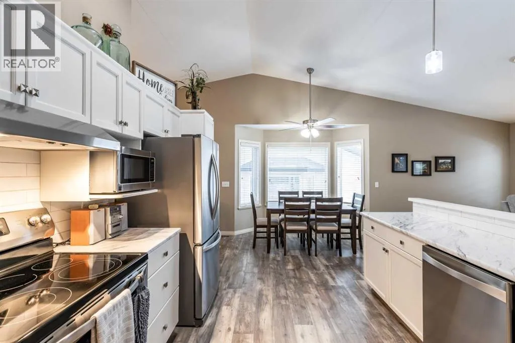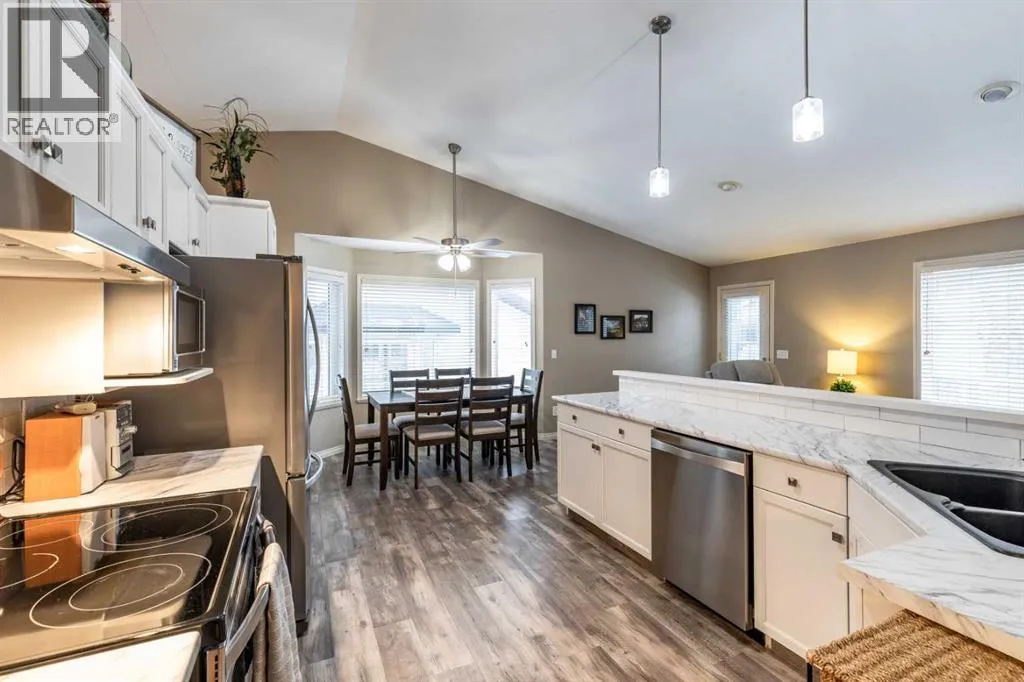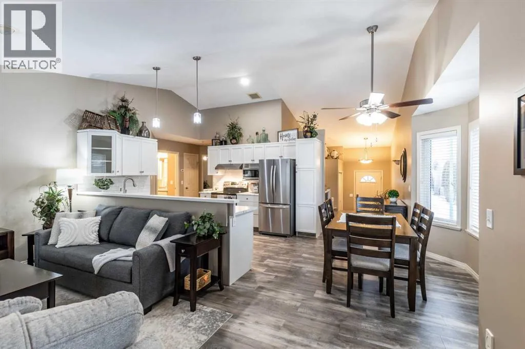 Welcome to 69 Hudson Way SE, a bungalow-style townhouse tucked into a quiet and convenient NECH location. Updated, beautifully maintained, and truly move-in ready, this home also offers immediate possession. Youâll be greeted by a spacious front entry that leads into a bright main floor featuring new vinyl flooring, new carpet, and a fresh, neutral colour palette throughout. The open-concept layout is both functional and inviting, with a generous dining area, a comfortable living room, and a beautifully designed white kitchen that offers plenty of storage and workspace. The main level includes two good-sized bedrooms, a 4-piece bathroom with a new sink and toilet, and the convenience of main floor laundry with additional storage. From this level, step outside to your private back deck complete with a power awning, overlooking a fully fenced and landscaped backyard featuring lawn space and multiple perennial garden beds. Main floor access to the single attached garage adds even more everyday convenience. The fully finished lower level provides excellent additional living space, including a large family room, a storage room with a deep freeze (included), a second 3-piece bathroom, and a third bedroomâperfect for guests, a teenager, or a home office setup. Ideal for first-time buyers, downsizers, or investors, this well-cared-for home offers comfort, functionality, and a fantastic location. (id:27476)