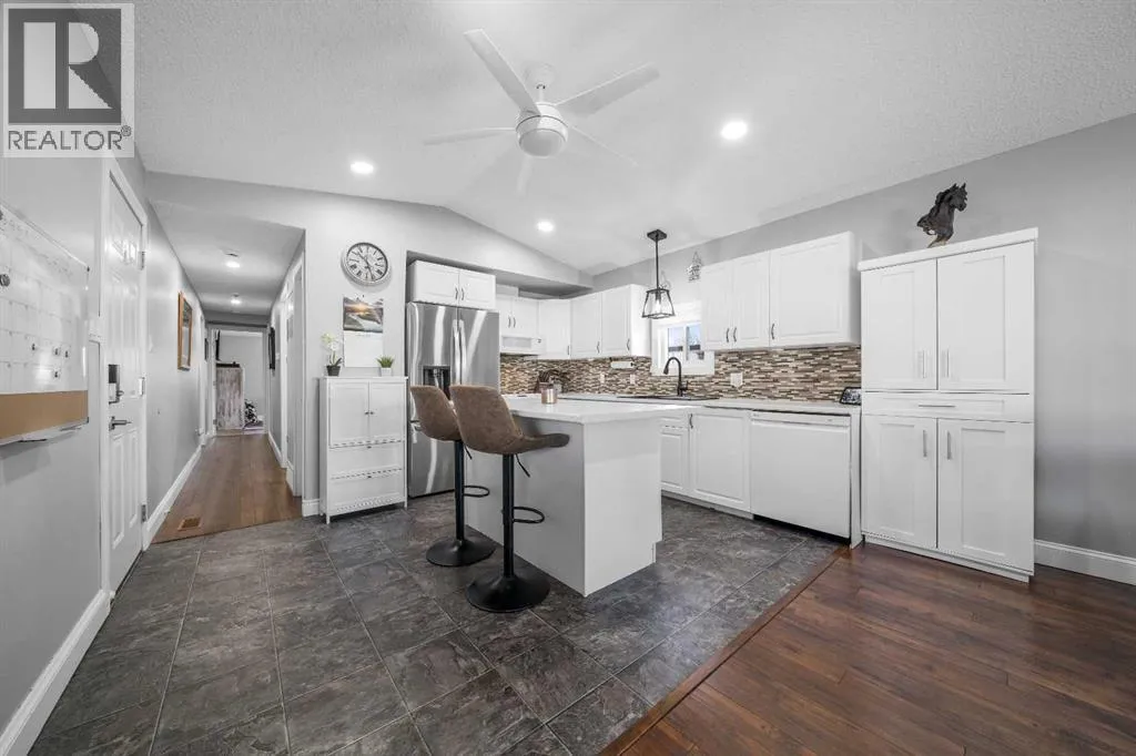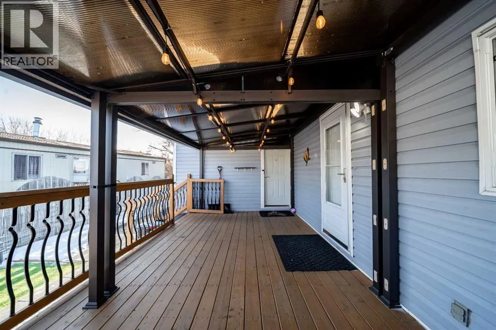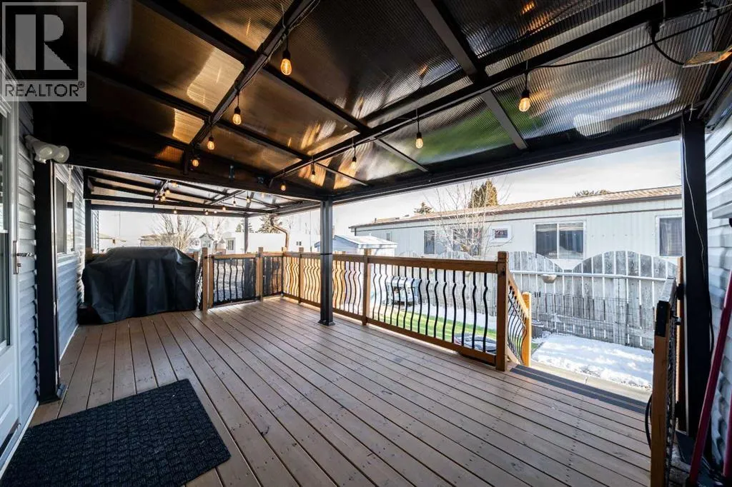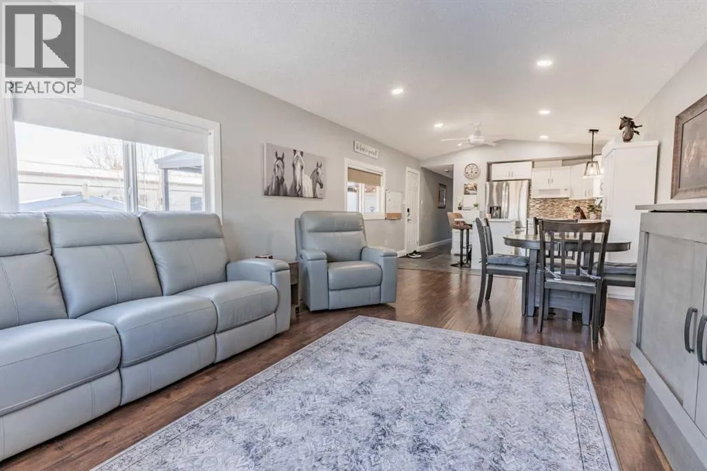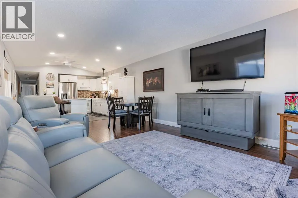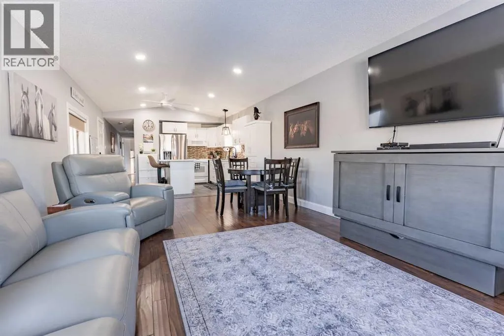 OWNED LAND, NO LOT FEES! Want low maintenance living with everything on one level...with fully fenced yard for your pets or kids? Welcome to this 3 bed 2 bath home that has been meticulously maintained inside and out. The large covered deck (19'5"x 10'5") is welcoming and a great addition to morning coffees, entertaining friends and family in the warmer months, all while being protected from the elements. It's an extension of the home! Step inside the front door to find a beautiful open concept kitchen/dining/living room with vaulted ceilings and newly incorporated pot lights to add to the abundance of natural light. The kitchen has new countertops, new sink and new side by side fridge. Enjoy simple meals at the counter seated island which also supplies numerous storage drawers/cupboards and an electrical outlet for further convenience. Down the hall, away from the noise of living, you will find a four pc bath with laundry, a generous master bedroom with 3pc ensuite and two additional bedrooms..one currently used as an office with outdoor access. No detail has been missed, inside or outside...the list is endless. In addition to a metal roof, a new furnace was installed in July 2025, with a pump so it doesn't drain under the home (affecting moisture below)but rather into the sewer lines, new light fixtures/fans...washer/dryer and dishwasher approximately 2 years old, new flooring in master bedroom. The office has been freshly painted. Moving outside, the covered deck was stained this past summer and the gazebo has sliding panels to control level of sun etc. The yard has been completely transformed into a maintenance free zone including pea gravel and artificial grass. New sidewalks and rubber pads were installed to keep walking easy as well as a new garbage platform. There are 3 sheds and two container holding racks for added storage and convenience. Finally, the home was relevelled with new footings on cement pads and new 8ml poly/pea gravel installed with heat tap e on water lines below for optimal comfort and security. Parking is never a problem, there is plenty extra in the roundabout directly in front of the home. Don't miss the opportunity to check out this great home! (id:27476)