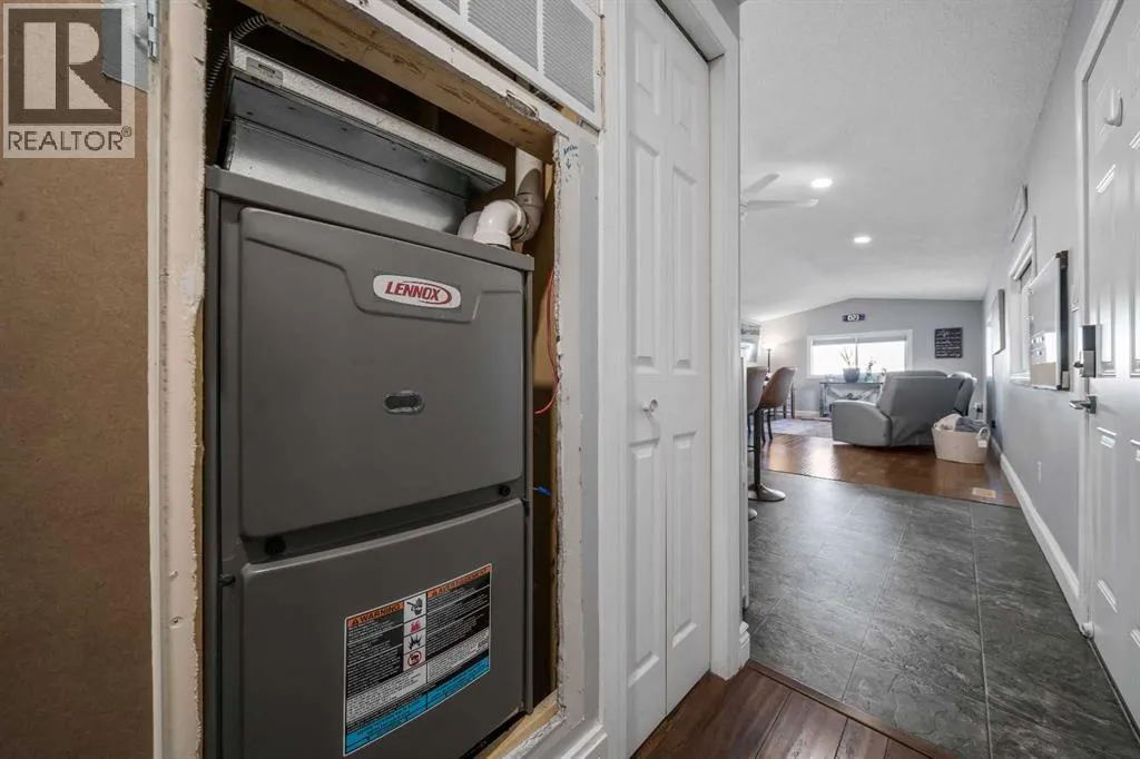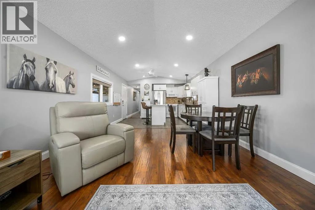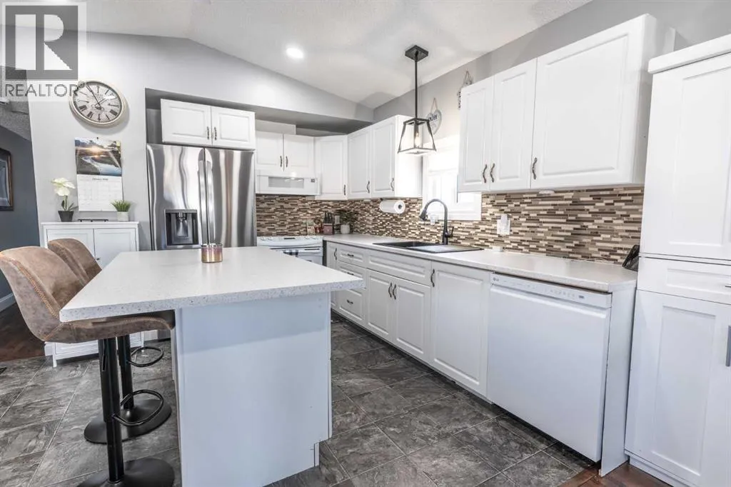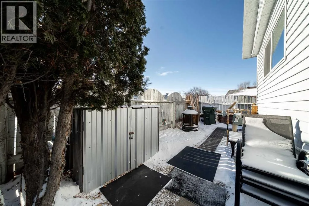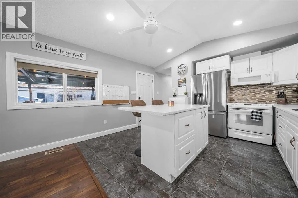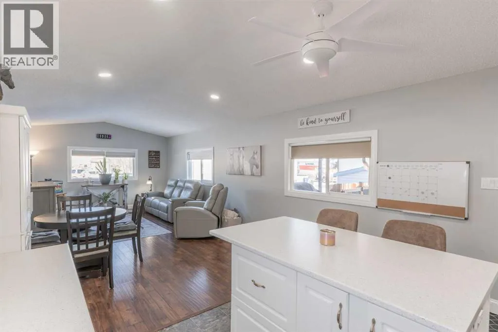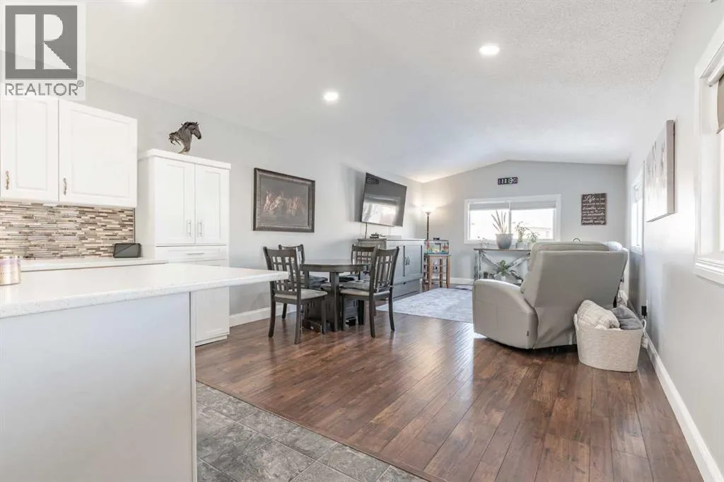 OWNED LAND, NO LOT FEES! Want low maintenance living with everything on one level...with fully fenced yard for your pets or kids? Welcome to this 3 bed 2 bath home that has been meticulously maintained inside and out. The large covered deck (19'5"x 10'5") is welcoming and a great addition to morning coffees, entertaining friends and family in the warmer months, all while being protected from the elements. It's an extension of the home! Step inside the front door to find a beautiful open concept kitchen/dining/living room with vaulted ceilings and newly incorporated pot lights to add to the abundance of natural light. The kitchen has new countertops, new sink and new side by side fridge. Enjoy simple meals at the counter seated island which also supplies numerous storage drawers/cupboards and an electrical outlet for further convenience. Down the hall, away from the noise of living, you will find a four pc bath with laundry, a generous master bedroom with 3pc ensuite and two additional bedrooms..one currently used as an office with outdoor access. No detail has been missed, inside or outside...the list is endless. In addition to a metal roof, a new furnace was installed in July 2025, with a pump so it doesn't drain under the home (affecting moisture below)but rather into the sewer lines, new light fixtures/fans...washer/dryer and dishwasher approximately 2 years old, new flooring in master bedroom. The office has been freshly painted. Moving outside, the covered deck was stained this past summer and the gazebo has sliding panels to control level of sun etc. The yard has been completely transformed into a maintenance free zone including pea gravel and artificial grass. New sidewalks and rubber pads were installed to keep walking easy as well as a new garbage platform. There are 3 sheds and two container holding racks for added storage and convenience. Finally, the home was relevelled with new footings on cement pads and new 8ml poly/pea gravel installed with heat tap e on water lines below for optimal comfort and security. Parking is never a problem, there is plenty extra in the roundabout directly in front of the home. Don't miss the opportunity to check out this great home! (id:27476)