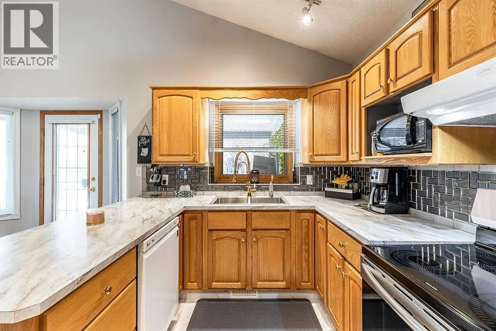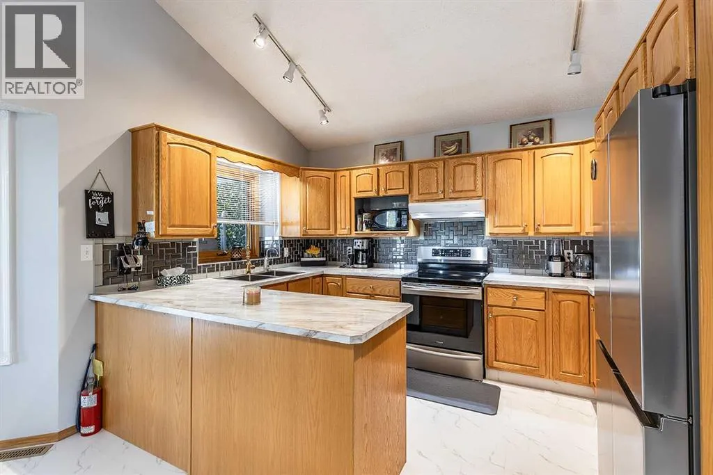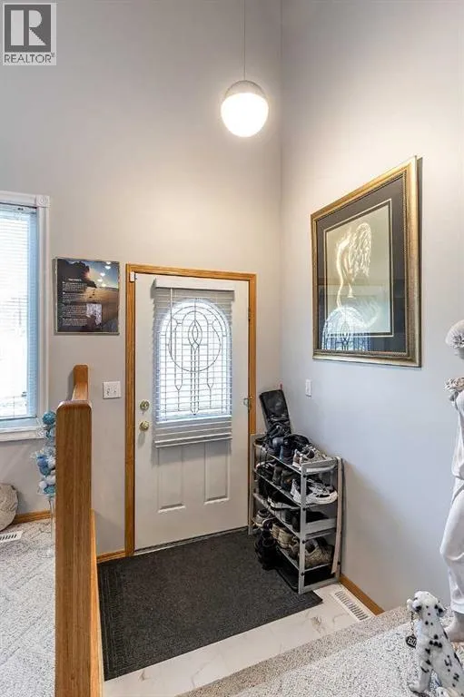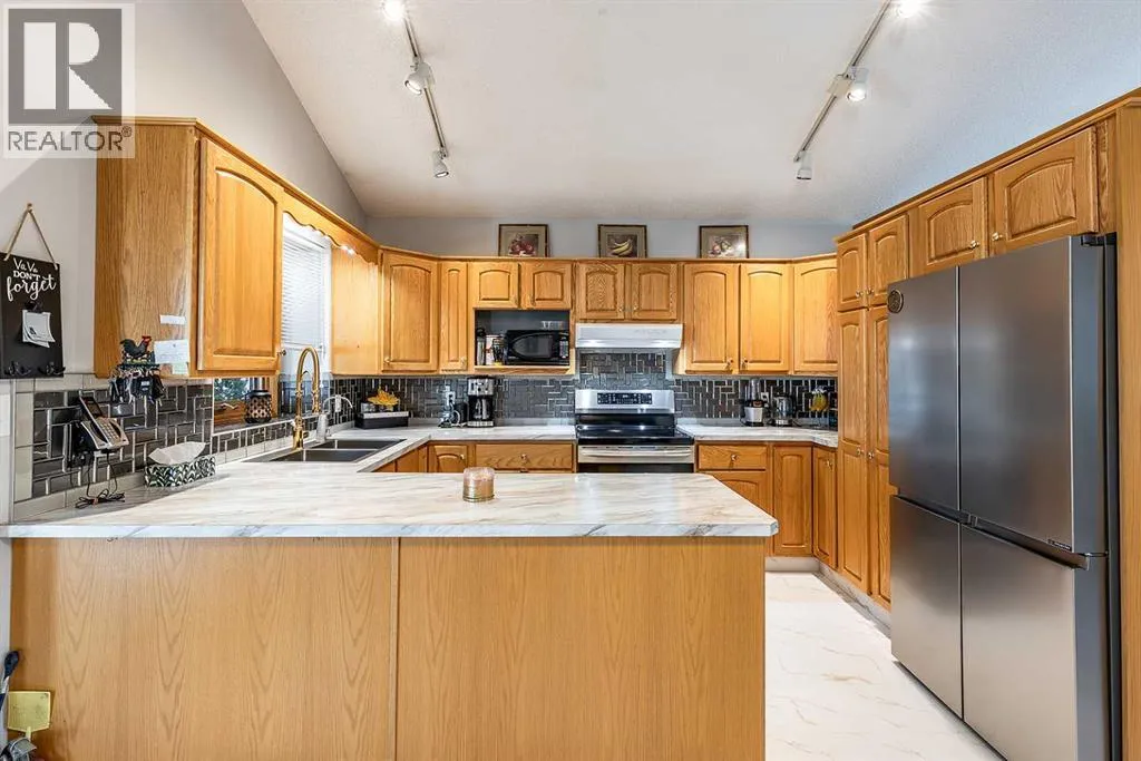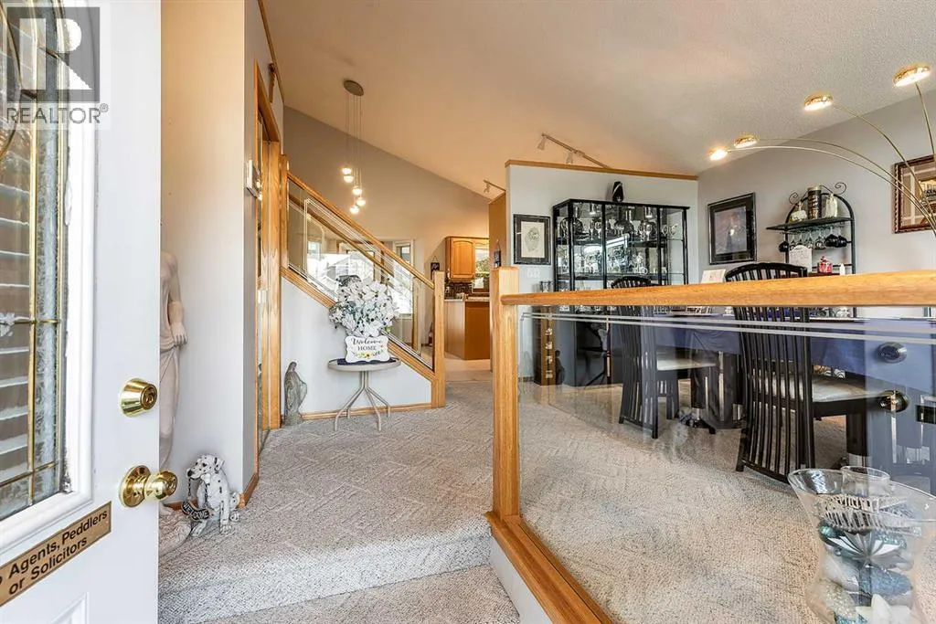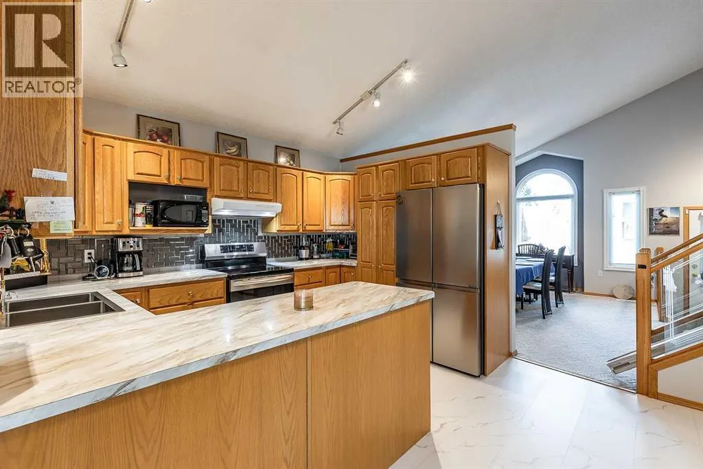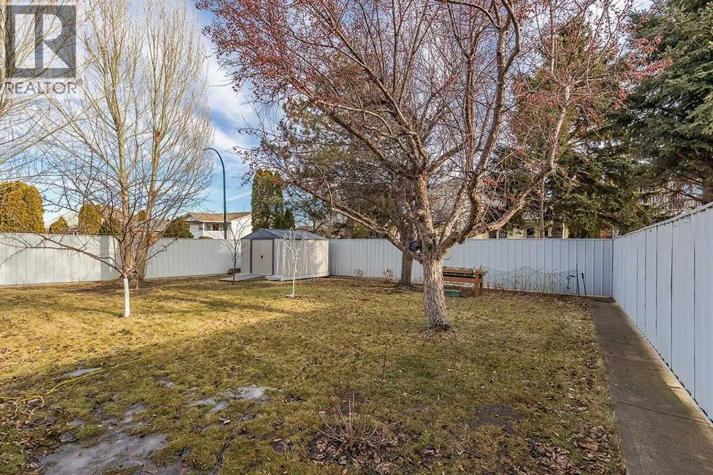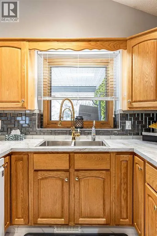 Located in the highly sought-after Parkview neighbourhood, just one minute from the Medicine Hat Golf & Country Club, this well-maintained two-storey split home offers space, flexibility, and a long list of updates. Featuring 3 bedrooms and 3.5 bathrooms, this property is ideal for families looking for a comfortable home in an established location. The main floor welcomes you with a front flex room currently used as a formal dining area, but easily suited for a living room, home office, or play space. The kitchen offers ample oak cabinetry, updated countertops and backsplash, newer stainless appliances (including fridge with ice maker), and a spacious dining area with direct access to the back deck and yard. From here, the layout flows into the large sunken living room, highlighted by a cozy gas fireplace. A convenient 2-piece powder room and main-floor laundry are located just off the attached double garage. Upstairs, youâll find three bedrooms, including the primary suite featuring a walk-in closet and a private updated 3-piece ensuite with a newer air-jetted tub. A full updated 3-piece bathroom with a newer large spa-style shower completes the upper level. The lower level provides a generous family room, an updated 3-piece bathroom, and a huge storage room, offering plenty of space for recreation and organization. Outside, the fully fenced (Metal) and landscaped backyard is a standout feature. Enjoy the new, oversized two-tier covered deck, underground sprinklers, RV parking, and an abundance of mature fruit including plum and apple trees, raspberry and blueberry bushes. Two sheds ( 16' x 6' and 10' x 9.5') provide additional storage. Notable updates include a new roof (4â5 years), windows (6 years), A/C and furnace (6 years), hot water tank (2024), updated kitchen finishes and appliances, renovated bathrooms, and the new deck. A wonderful opportunity to own a move-in ready home in one of Medicine Hatâs most desirable neighbourhoods. Garage will be reverted back to a fully finished heated garage for possession. (id:27476)