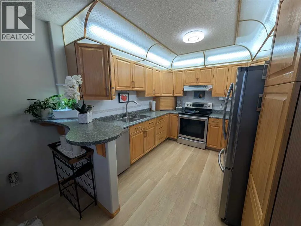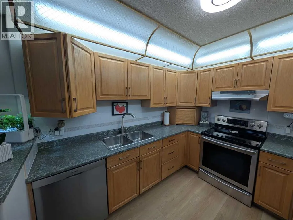 Welcome to this highly sought after top floor condominium in Fairview Village, offering beautiful golf course views and a low maintenance lifestyle in a prime location. Ideally situated just steps from Connaught Golf Course and close to all amenities, this well maintained 1 bedroom, 1 bathroom suite combines comfort, convenience, and an inviting community atmosphere. The bright and spacious living room features vaulted ceilings, a cozy gas fireplace, and direct access to a private balcony overlooking the greens â the perfect spot to relax and enjoy the view. The kitchen provides ample cabinetry and counter space and flows seamlessly into a generous dining area, ideal for everyday living. The primary bedroom also offers private patio door access to the balcony, along with a walk through double closet leading to a well appointed 4pc bathroom with jetted tub that conveniently connects to both the bedroom and main living area. In-suite laundry with additional cabinetry ensures plenty of functional storage and everyday convenience. Residents of Fairview Village enjoy an exceptional range of amenities, including an indoor pool, hot tub, sauna, fitness area, games room, workshop, and car wash bay, along with organized social events that foster a welcoming and vibrant community. Known for its excellent maintenance and pride of ownership, this building offers true peace of mind and easy living. Condo fees $553/month. (id:27476)