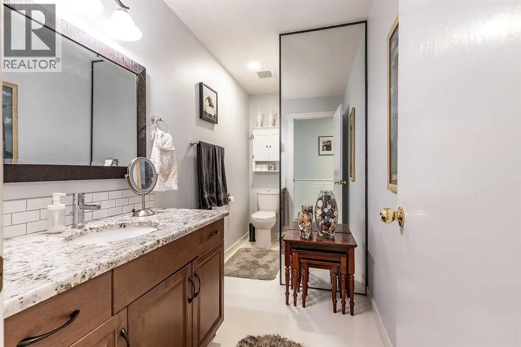 Welcome to this beautifully updated adult-living condo offering over 2,500 sq. ft. of thoughtfully designed living space. Pet-friendly with restrictions and board approval, this home also features an attached garage, private driveway, and its own ground-level entrance. The main floor offers a spacious living room centered around a cozy wood-burning fireplace, with direct access to a private deck overlooking stunning coulee views. Updated vinyl flooring flows into the generous formal dining area, highlighted by a striking feature wall. The renovated eat-in kitchen is both stylish and functional, featuring granite countertops, tile backsplash, maple cabinetry, and newer fingerprint-resistant appliances. Down the hall, youâll find convenient main floor laundry, a full 4-piece bathroom, and two oversized bedrooms, including the primary suite with a walk-in closet and private 3-piece ensuite. The fully developed lower level provides even more living space with a large family room, two versatile rooms ideal for a home office, gym, or hobby space, abundant storage, and direct access to the attached garage. Move-in ready and designed for easy living, this home offers an ideal blend of comfort, space, and low-maintenance living. Condo fees of $533/month include common area and grounds maintenance, reserve fund contributions, and snow removal. Average utilities are approximately $260/month. (id:27476)