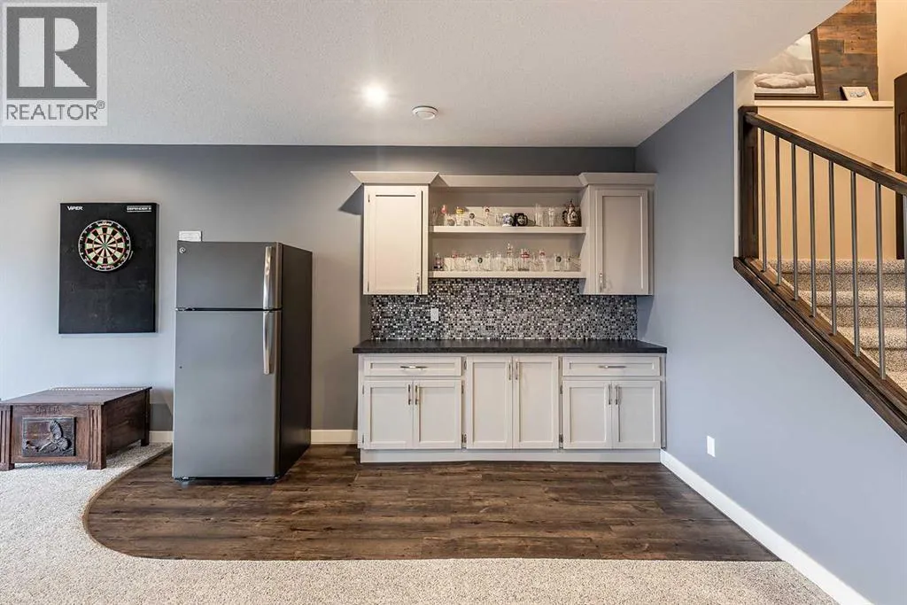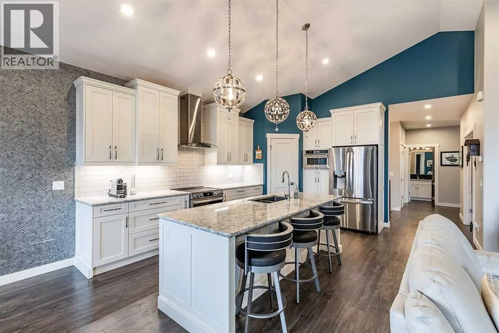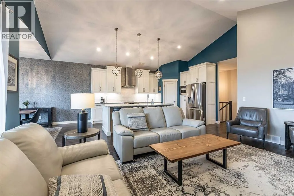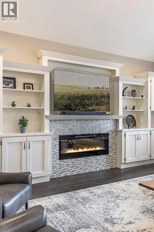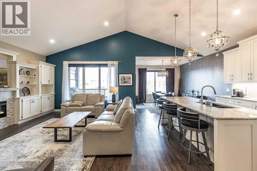 Executive walkout with high-end finishes; and a beautiful VIEW of the pond and environmental reserve. Offering 3000 sq. ft. of total living space, this home is exceptionally well kept with high-end finishes throughout. The main level features an open-concept layout with cathedral ceilings, quality flooring, custom wall detailing, and a built-in entertainment unit around a classy fireplace focal point. The kitchen is designed for both function and style, with a large island, a pantry, GORGEOUS COUNTERS, stainless premium appliancesâ¦this one checks all the boxes! The dining area opens directly onto the covered back patio, the perfect place to relax in the afternoon shade and take in the views. A main floor office with french doors adds flexibility, and the laundry/mudroom provides a seamless transition to the double attached heated garage with APOXY FLOORING, complete with built-in shelving, Husky Cabinets, and additional storage. Upstairs, the primary suite is privately positioned and well-appointed, offering a spacious walk-in closet and a modern ensuite with dual sinks, a glass shower, a soaker tub, and heated tile flooring for added comfort. The walkout basement is fully developed with a clean, open layout, two additional bedrooms, impeccable family room with more BUILT INs; gas fireplace, and a professionally finished bar with full size fridgeâideal for entertaining. Step outside to a landscaped yard with another covered patio space. The low maintenance yard is perfect for those who want to exercise their green thumb with minimal obligation to up keep. A well-executed home in a prime settingâshows extremely well; book a private showing to see for yourself! (id:27476)