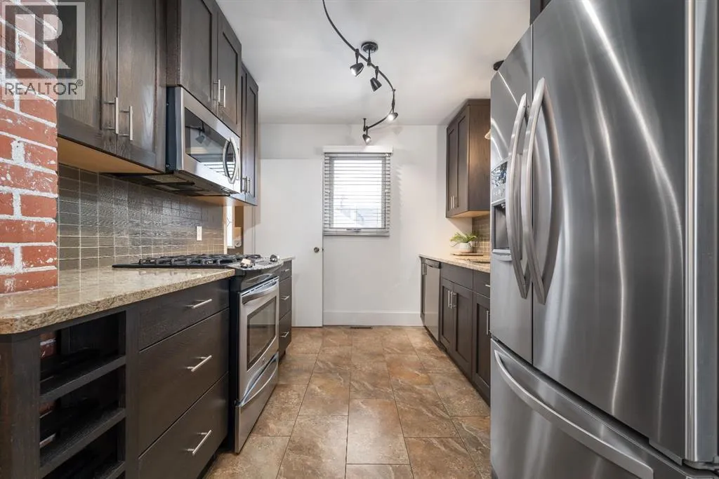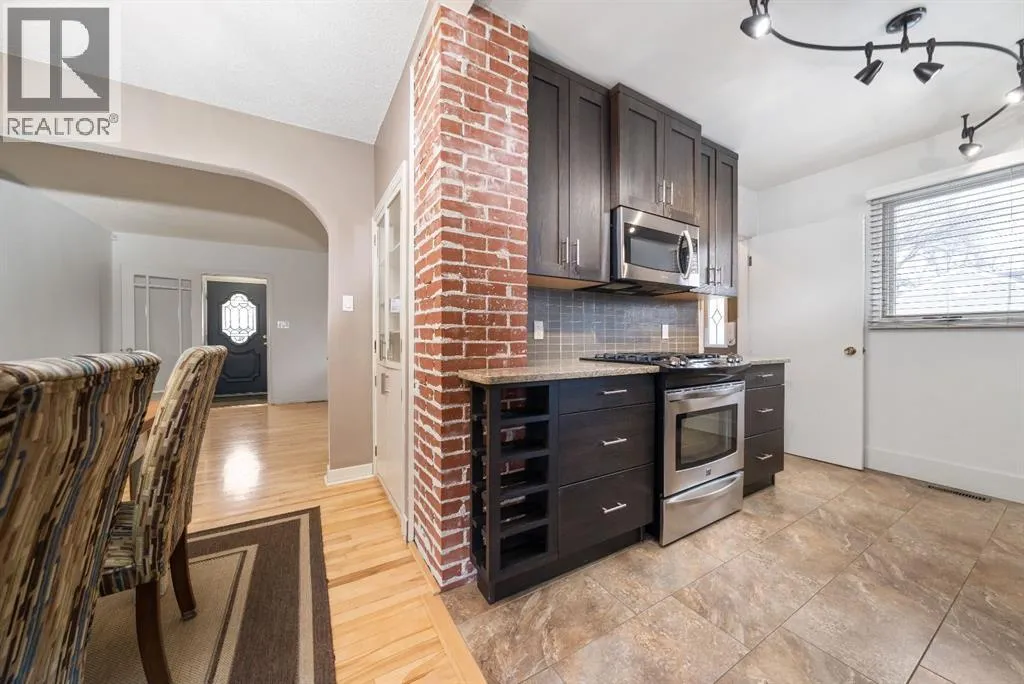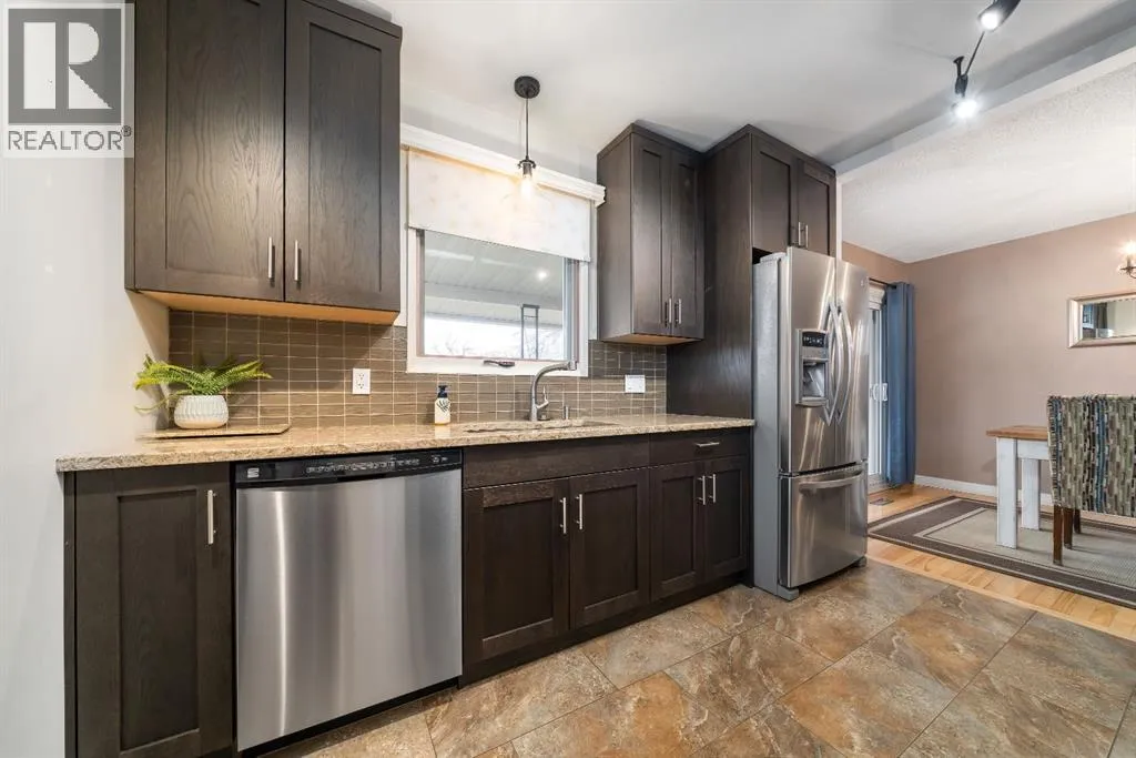 Welcome to 489 10th Street SE â a beautifully maintained and thoughtfully updated bungalow offering space, style, and functionality throughout. Step inside through the front entry and youâre greeted by a bright, spacious living and dining area â ideal for both everyday living and entertaining. Hardwood floors add warmth and character throughout the main level, while large windows fill the space with natural light. From the dining room, step directly onto your oversized covered deck, creating a seamless indoor-outdoor living experience. The kitchen is a true standout, featuring ceiling-height dark stained cabinetry, granite countertops, stainless steel appliances, and a stylish exposed brick feature wall that adds a unique touch of character. The main floor is complete with two comfortable bedrooms and a beautifully updated 4-piece bathroom showcasing granite countertops and a newer tiled tub surround. Downstairs offers excellent additional living space with two more bedrooms, including one with built-in cabinetry and the option to add a sink for a future kitchenette â perfect for guests, extended family, or flexible use. Youâll also find a cozy family room with a gas fireplace, a 4-piece bathroom, a dedicated laundry area, utility room, and plenty of storage. Flooring includes a combination of laminate and carpet for comfort and durability. Outside, the property continues to impress. Enjoy the large covered deck, spacious yard, and a dedicated garden area â all maintained with underground sprinklers in both the front and backyard. The 24â x 24â double detached heated garage provides excellent parking and workspace, while the new vinyl fencing (2025) offers added privacy and a clean, modern finish. Located in the heart of SE Hill, one of Medicine Hatâs most desirable and historic neighbourhoods, youâll love the tree-lined streets, character homes, and unbeatable walkability. Just minutes from downtown amenities, schools, parks, the river valley, and extensive walking and biking trails, this location offers the perfect balance of lifestyle and convenience. Exceptionally clean, well cared for, and move-in ready â this is a home you donât want to miss! (id:27476)