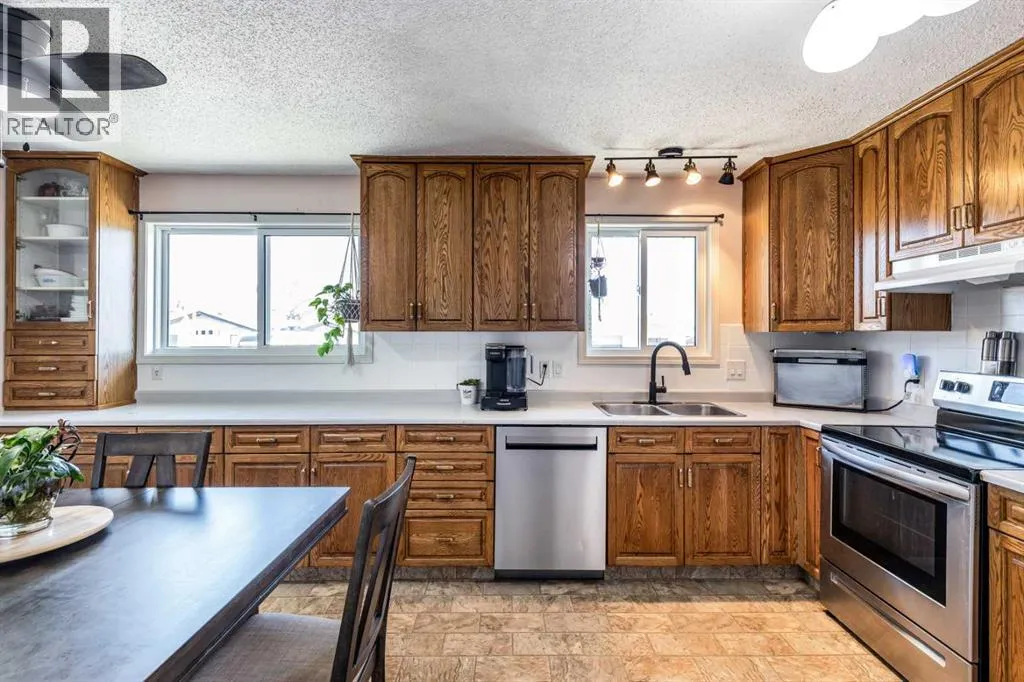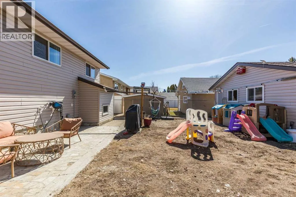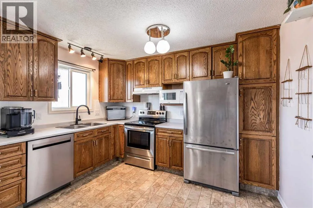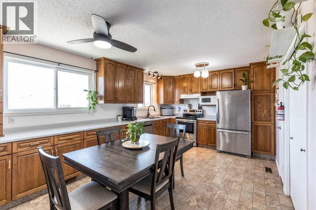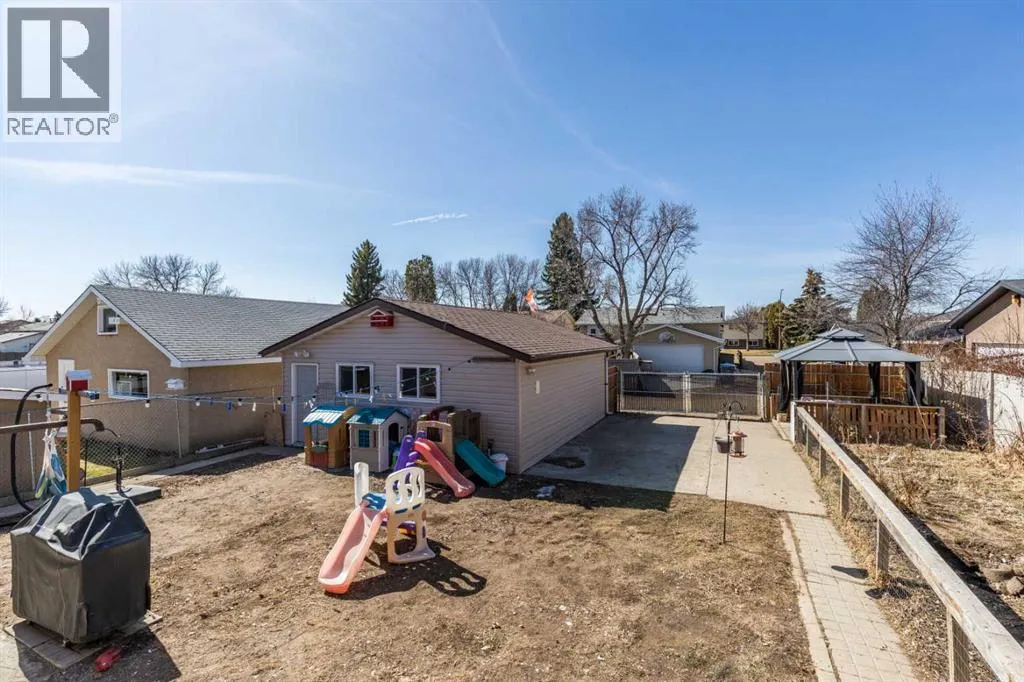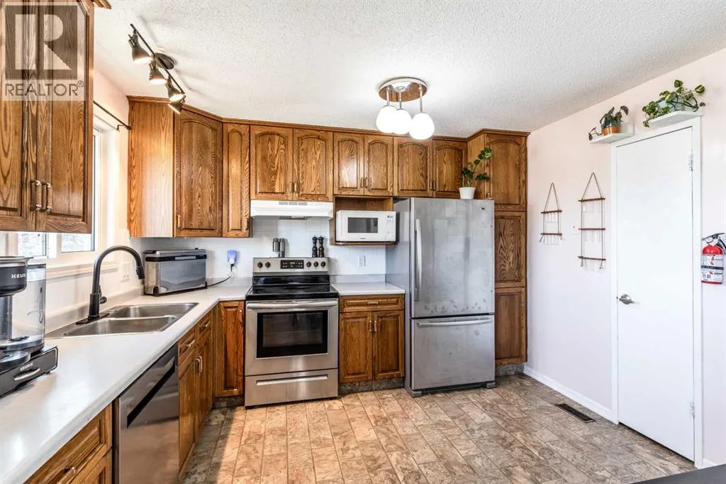 Welcome to this fully finished bi-level located in a family-friendly SE neighbourhood close to schools, shopping, and surrounded by parksâoffering exceptional space and functionality for a growing family. With 5 bedrooms (3 up, 2 down) and multiple living areas, this home is designed for comfortable everyday living. The main floor features a bright and spacious front living room highlighted by a cozy electric fireplace. The large kitchen offers classic oak cabinetry, ample counter space, and a generous dining area ideal for family meals and entertaining alike. Youâll also find three well-sized bedrooms on the main level, including the primary bedroom with a walk-in closet and patio doors leading directly to the back deck. An updated 4-piece bathroom completes this floor. The fully developed lower level has been beautifully refreshed with new flooring and fresh paint throughout, creating a bright and inviting second living space. Here youâll enjoy a large family room with a gas fireplace, a wet bar with sink âperfect for entertainingâplus two additional bedrooms, a renovated 3-piece bathroom, a large flex room, laundry area, and abundant storage. A convenient walkout provides direct access to the backyard. Outside, the spacious yard offers something for everyone, featuring a large garden area with raspberry bushes, a covered pergola space ideal for a future hot tub, and extra storage. There is a double parking pad with room for RV parking, along with a detached garage featuring a new insulated overhead door and opener, new man door, and updated windows. Extensive updates provide peace of mind, including appliances (2022), paint, windows (2022â2026), roof (2022), central A/C (2022), gas and electric fireplaces (2022), and new gates (2026). Move-in ready and offering excellent space both inside and out, this is a fantastic opportunity in a sought-after SE location. (id:27476)