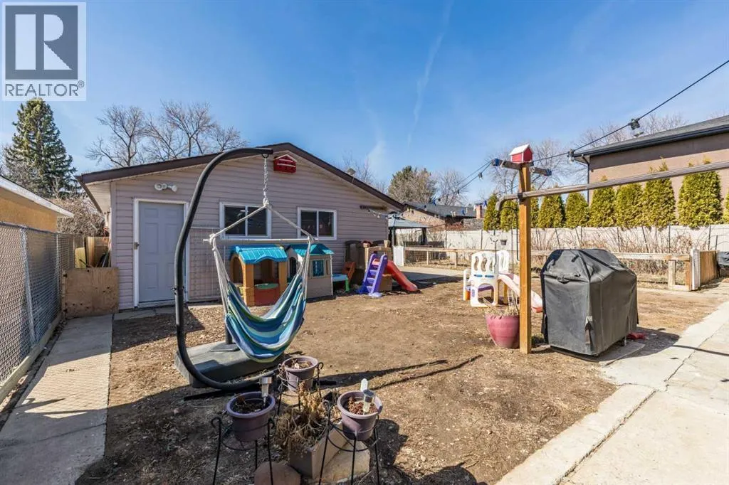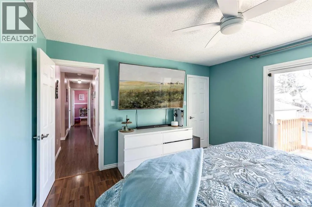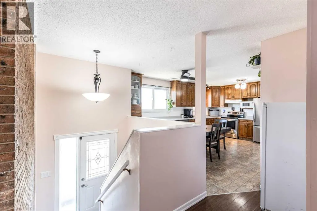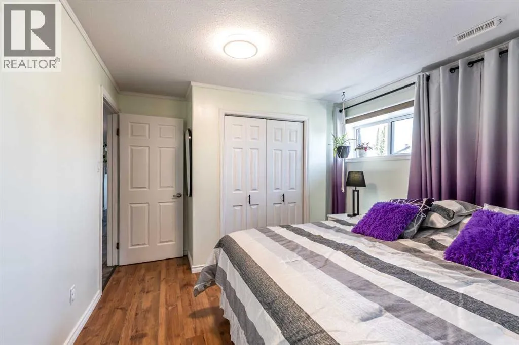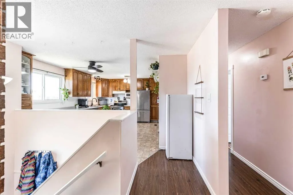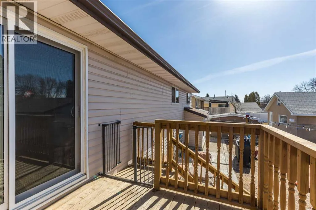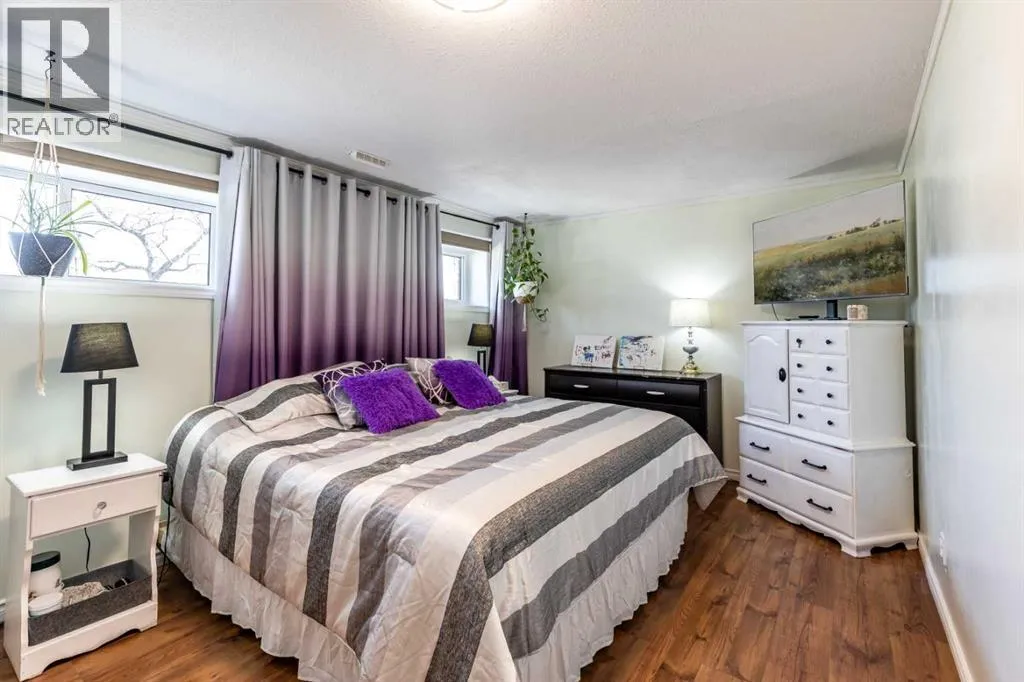 Welcome to this fully finished bi-level located in a family-friendly SE neighbourhood close to schools, shopping, and surrounded by parksâoffering exceptional space and functionality for a growing family. With 5 bedrooms (3 up, 2 down) and multiple living areas, this home is designed for comfortable everyday living. The main floor features a bright and spacious front living room highlighted by a cozy electric fireplace. The large kitchen offers classic oak cabinetry, ample counter space, and a generous dining area ideal for family meals and entertaining alike. Youâll also find three well-sized bedrooms on the main level, including the primary bedroom with a walk-in closet and patio doors leading directly to the back deck. An updated 4-piece bathroom completes this floor. The fully developed lower level has been beautifully refreshed with new flooring and fresh paint throughout, creating a bright and inviting second living space. Here youâll enjoy a large family room with a gas fireplace, a wet bar with sink âperfect for entertainingâplus two additional bedrooms, a renovated 3-piece bathroom, a large flex room, laundry area, and abundant storage. A convenient walkout provides direct access to the backyard. Outside, the spacious yard offers something for everyone, featuring a large garden area with raspberry bushes, a covered pergola space ideal for a future hot tub, and extra storage. There is a double parking pad with room for RV parking, along with a detached garage featuring a new insulated overhead door and opener, new man door, and updated windows. Extensive updates provide peace of mind, including appliances (2022), paint, windows (2022â2026), roof (2022), central A/C (2022), gas and electric fireplaces (2022), and new gates (2026). Move-in ready and offering excellent space both inside and out, this is a fantastic opportunity in a sought-after SE location. (id:27476)