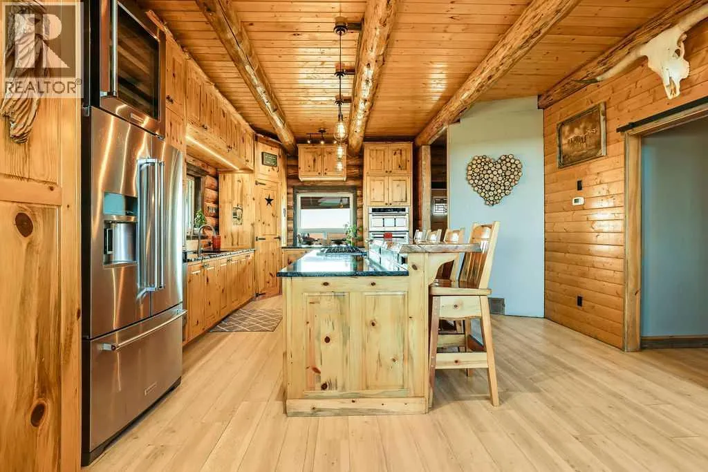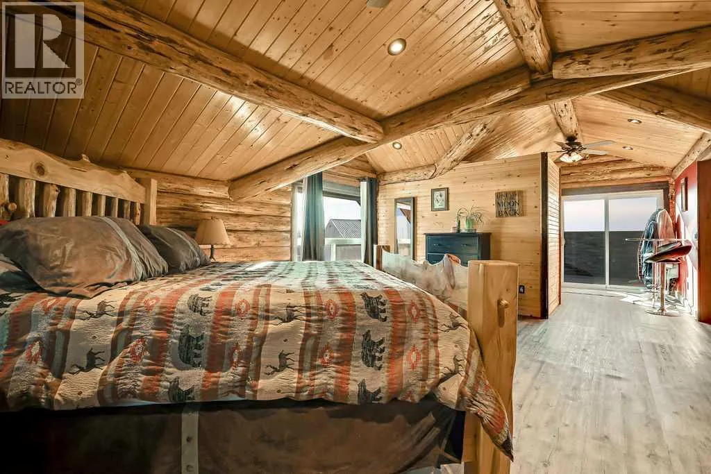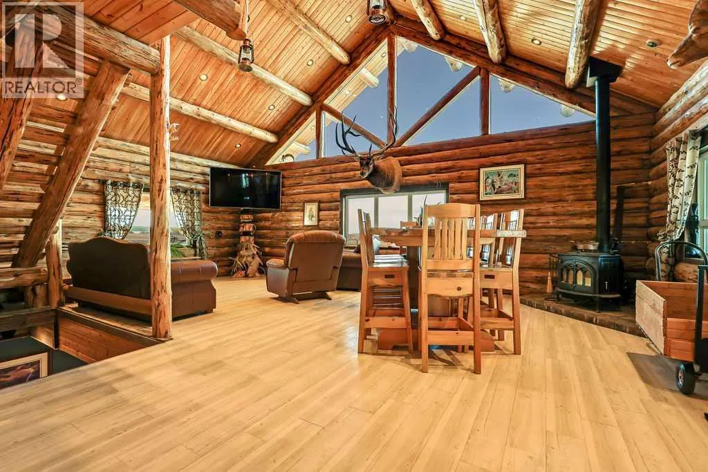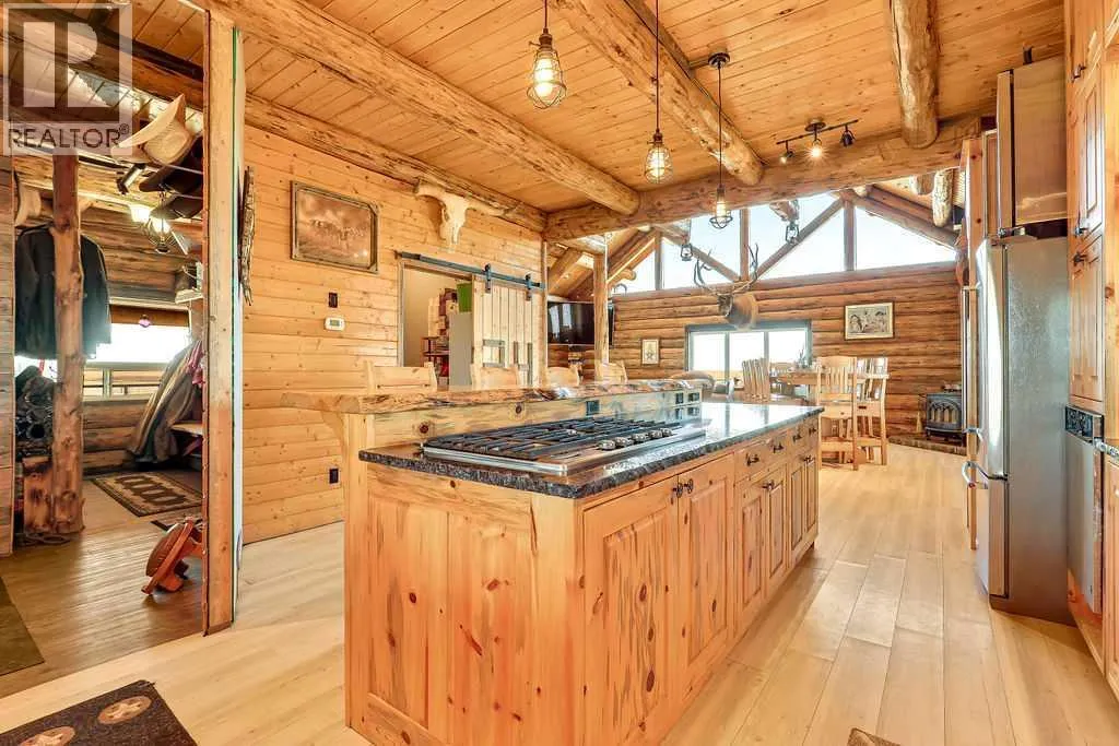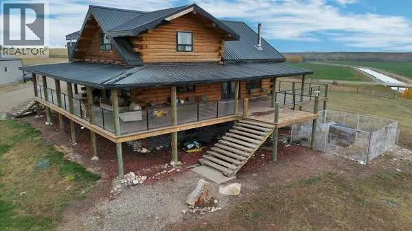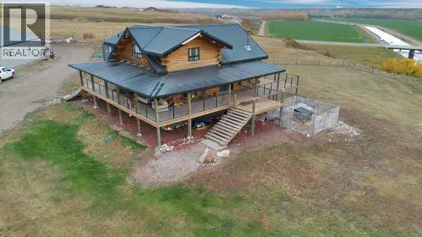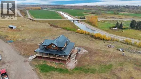 Bring your business and your family to this one-of-a-kind property that blends rugged utility with rustic comfort.Perched high on a hilltop with 360-degree views, this 27.82-acre native pasture property (plus 6 acres of leased land along the river) offers unmatched sunsets, mountain vistas, and a front-row seat to the Bow River valley. Just 40 minutes from Calgary, itâs the perfect balance of rural seclusion and easy access to the city.At the heart of the acreage sits a solid custom-built log homeâwarm, inviting, and uniquely designed.Over 1,800 sq. ft. of living space4+1 bedrooms, 3 bathrooms. Fully Developed Basement.Sun-drenched open-concept living areas with natural wood finishes.Striking live-edge island kitchen for family and entertainingWood-burning stove for cozy eveningsMaster loft retreat with his-and-hers walk-in closets, spa-like ensuite (steam shower, double vanities), private balcony, and two-person hot tub under the stars. The SHOP for mechanics, truckers, and serious operators, the 5,100 sq. ft. shop is second to none.Radiant heat & floor drainageThree overhead cranes (1 Ã 3-ton, 2 Ã 1-ton)Car & truck hoists16x12 walk-in cooler. Warm Storage.On-site bathroom & laundry. Mezzanine Man Cave.3,500-gallon diesel storage tank. Double Decker Storage Can.1,900 sq. ft. man-cave/office spaceIllegal suite for staff housing or rental incomeLifestyle Extras.Ideal for horse lovers with open pasture. Clay Based Area for future riding arenaSpace for trucks, equipment, or large-scale operationsA true blend of work and lifestyleWhy Itâs Special?. This property is more than just land and buildingsâitâs a rare opportunity to live, work, and play without compromise. Whether youâre growing a business, raising a family, or simply looking for wide-open space with top-end amenities, this acreage is in a league of its own.Will not be replaced at this Price! Won't Last Long!Donât miss your chance. Book your private tour today and expe rience the âTop of the Worldâ lifestyle for yourself. Enjoy the Wildlife. Nature's Home. (id:27476)