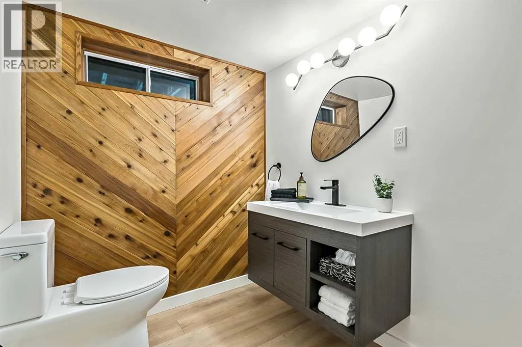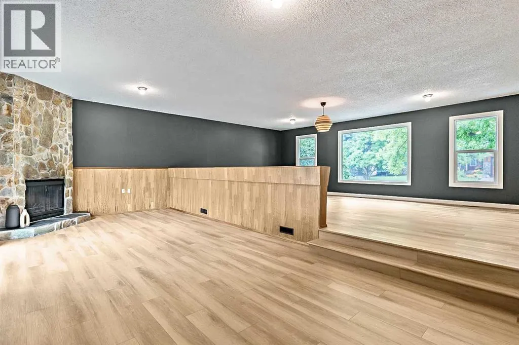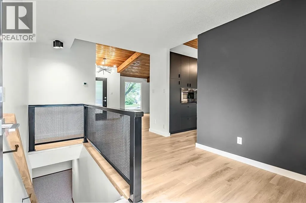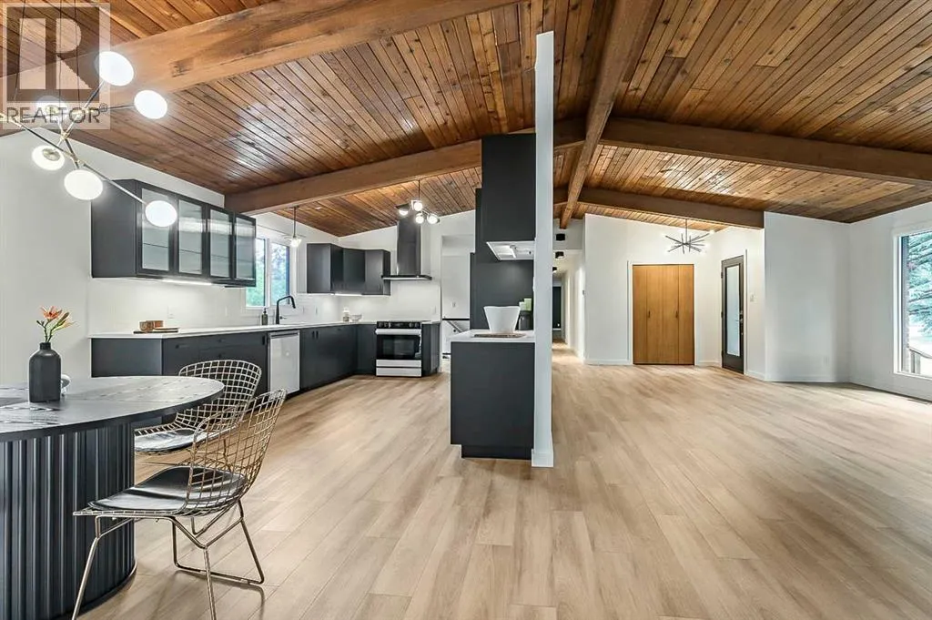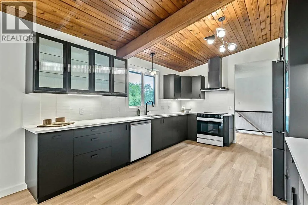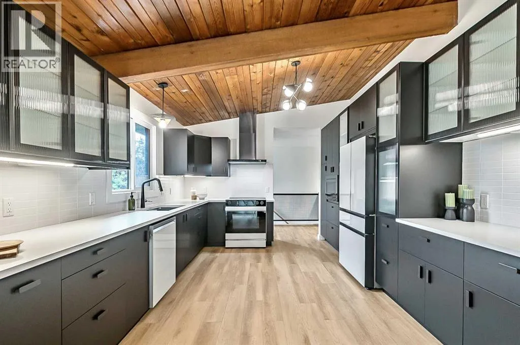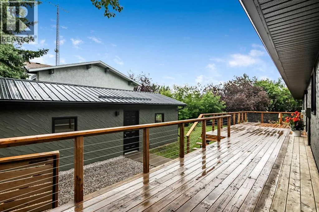 See how far your dollar can go in Nanton . Show-stopping renovation. You canât build this quality for less. Over 3,700 sq ft of reimagined living in a fully transformed five-bedroom, 3.5-bath corner home. Every detail is tailored for modern living while preserving structure and style.This is a move-in-ready home in an established neighbourhood.The exterior makes a refined statement with a new metal roof on both the garage and the home, all-new windows and doors, and sleek steel cable railings on the deck. A secluded yard with mature trees offers privacy and a perfect backdrop for outdoor gatherings, wrapped in new fencing and thoughtfully designed decks.Inside, architectural features abound. A show-stopping vaulted cedar ceiling blends clean lines with organic textures. Two wood-burning fireplaces add character and warmth. All-new flooring flows throughoutâmodern and durable vinyl plank upstairs, plush carpet down, and wall-to-wall tile in the spa bathroom. Fresh cloud-white walls are paired with reclaimed trim and character-rich wood panelling, lovingly restored.The kitchen is a contemporary centrepiece with a mix of solid and glass fronts, an abundance of storage, quartz counters, Samsung Bespoke appliances, and a custom tile backsplash. Each bathroom feels like a boutique spa, from the heated tile floors and cedar sauna in the lower-level bath to the cork wallpaper and floating vanities in the primary suite.A versatile bonus room offers endless possibilities for work, play, or relaxation. Updated mechanicals include a new furnace, serviced secondary furnace, new hot water tank, and upgraded electrical. New hardware, fixtures, lighting, and thoughtful touchesâlike the custom steel railing and reclaimed oak banisterâcomplete the transformation.Close to schools and everyday conveniences, this is a must-see modern masterpiece that effortlessly blends design, function, and comfortâready to welcome your next chapter beautifully. (id:27476)