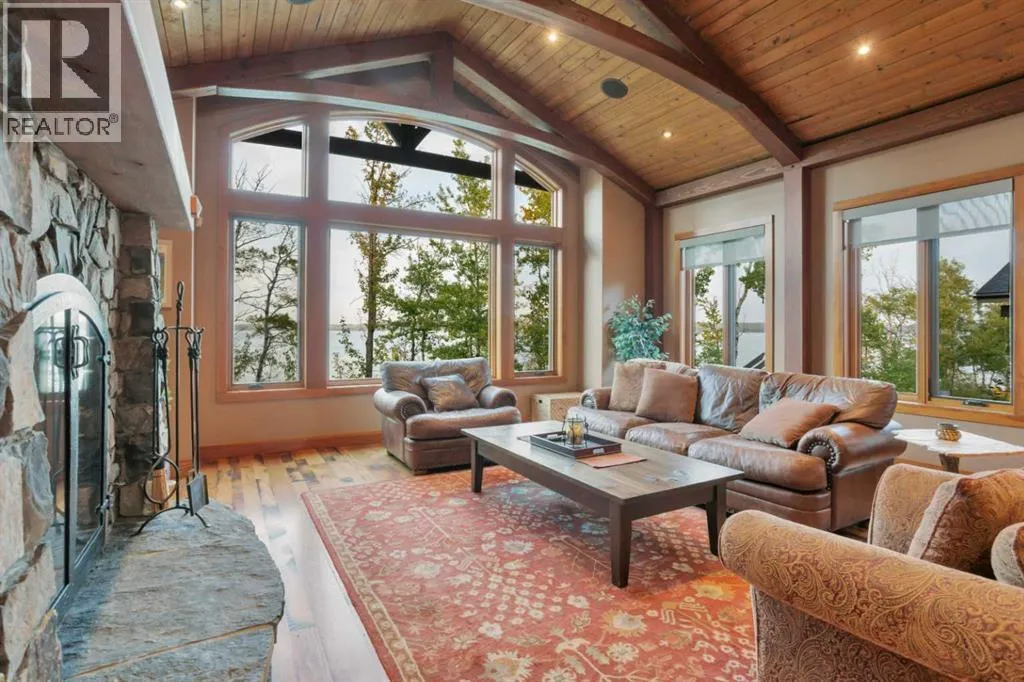 Welcome to your luxury waterfront retreat on the coveted shores of Honeymoon Bay in Sylvan Lake! This prestigious 7-bedroom, 5-bathroom estate spans over 6,900 sq ft of masterfully crafted living space and sits on 87 feet of prime lakefront. From the moment you enter the grand foyer, youâre greeted with warmth and sophistication â featuring timeless post and beam architecture, 100-year-old specialty oak flooring, and exceptional custom stonework. The sun-drenched great room is truly the heart of the home, offering breathtaking views of the lake. Entertain in style with a formal dining room that flows seamlessly into a chef-inspired kitchen equipped with a stunning 9-ft granite island, WOLF gas range, built-in commercial fridge/freezer, and dual dishwashers. The upper-level primary suite is your private sanctuary, featuring a large walk-in closet and a spa-like ensuite with jacuzzi, shower, and dual vanities. Step into the inviting three-season screened in porch off the kitchenâcomplete with a wood-burning fireplace, bar, and professional grillâperfect for entertaining. Just outside, your private heated pool area offers total privacy, a convenient pool house room, and direct access to the beautifully landscaped backyard. Updated landscaping includes new fencing, a cozy fire pit area, and a charming woodshed. From your private dock, set off for a day on the lake, or enjoy a quiet evening under the stars. Upgrades include a new 5-ton central A/C system, HVAC, hot water heater, commercial-grade Reverse Osmosis system, and updated security and Sonos sound systems. With a triple in-floor heated garage, this exceptional lakefront property offers an unparalleled lifestyle of comfort, privacy, and lakeside luxury. (id:27476)