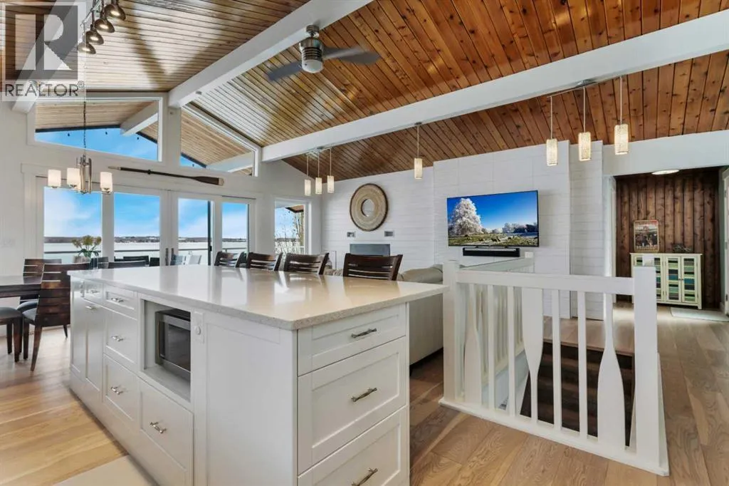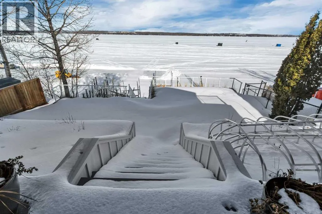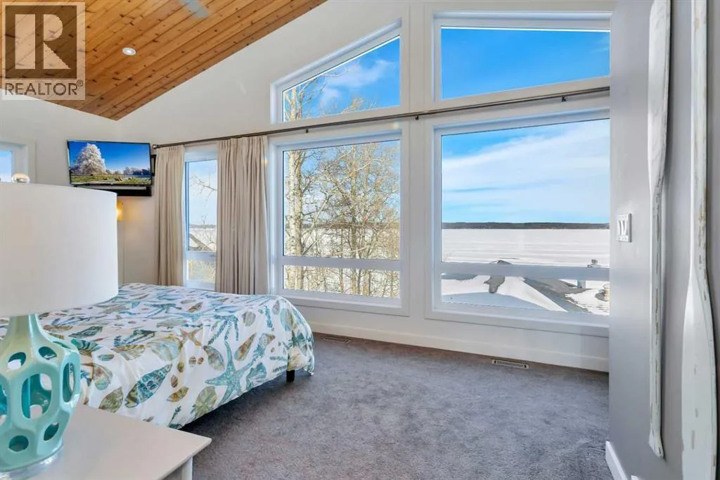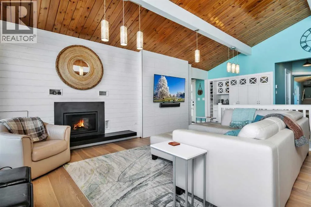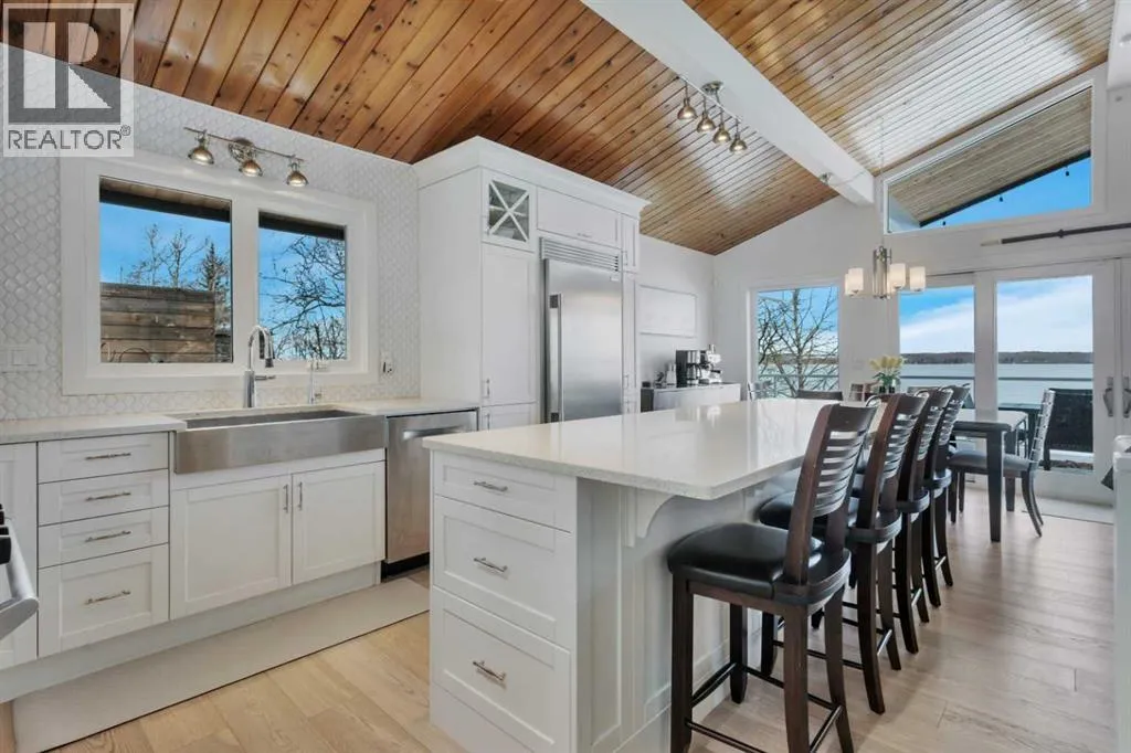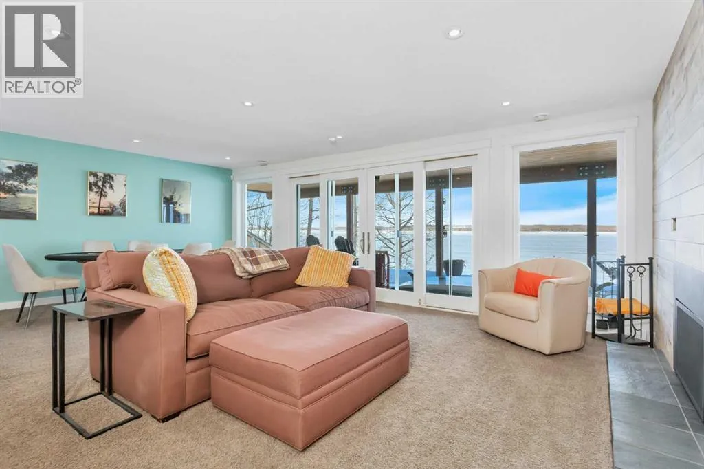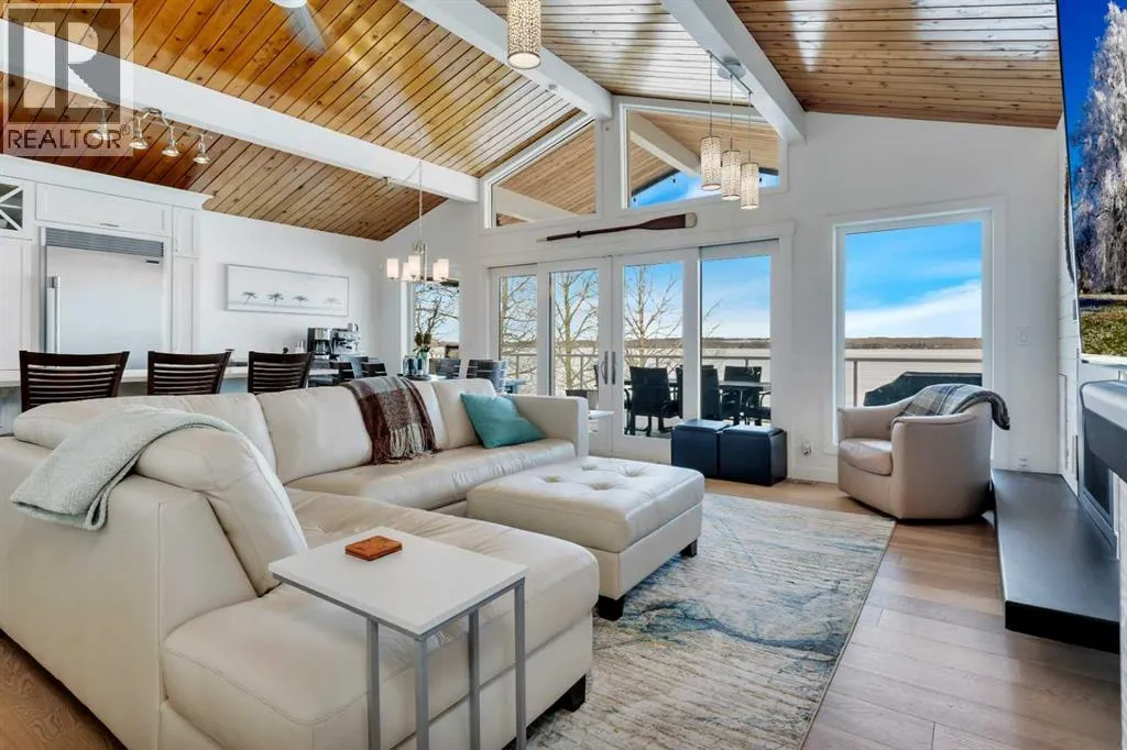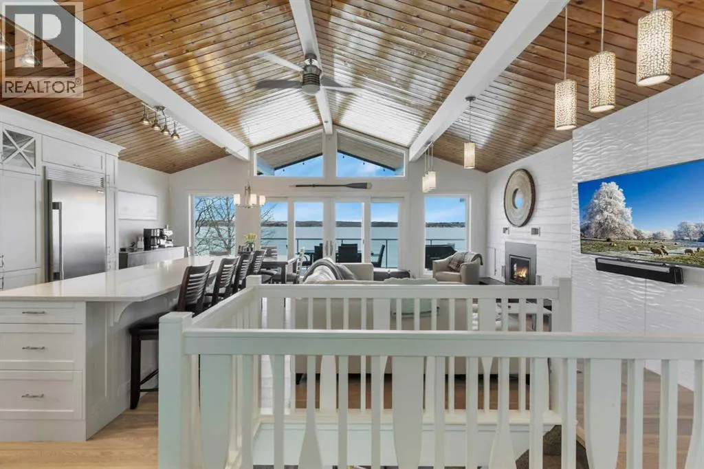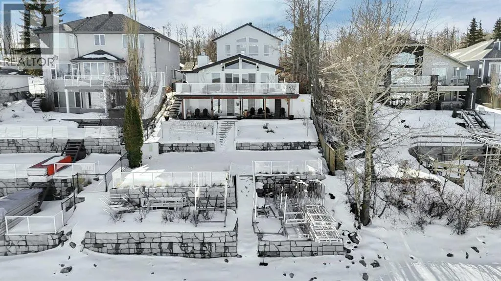 Set behind a gated entrance and surrounded by mature trees, 87 Grand Avenue offers a rare blend of privacy, modern design, and true lakefront living, just minutes from Sylvan Lake. This walkout bungalow with a custom second-storey primary suite retreat was extensively updated in 2022, when the original cabin was completely renovated and a substantial addition was completed, creating a home that is both refined and highly functional. Inside, soaring vaulted wood ceilings with exposed beams and expansive windows flood the space with natural light while capturing stunning lake views. The kitchen features white cabinetry, Caesarstone quartz countertops, stainless steel appliances, and a central island, flowing seamlessly into both casual and formal dining areas. Two brand new gas fireplaces add warmth and atmosphere, while two new air conditioning units ensure comfort throughout the seasons. Upstairs, the primary suite offers a peaceful retreat with lake views, a custom walk-in closet, and a spa-inspired ensuite with a soaker tub and rain shower. The walkout basement opens to a fully landscaped yard and direct access to the lake, creating a seamless indoor-outdoor lifestyle. A standout feature of this property is the completely rebuilt shoreline and retaining wall, professionally completed by Lakeview Contracting. From the lake all the way up to the home, the entire structure has been redone, offering improved usability, enhanced access, and long-term structural integrity, a significant investment and a rare advantage for waterfront ownership. The lower level offers a flexible recreational space, ideal for kids, guests, or a dedicated hangout area after a full day on the lake. An oversized attached garage with extended ceiling height offers excellent storage, including room for a boat. A rare opportunity to own a fully upgraded waterfront property where privacy, quality renovations, and true lakefront functionality come together. (id:27476)