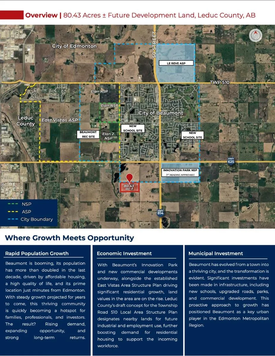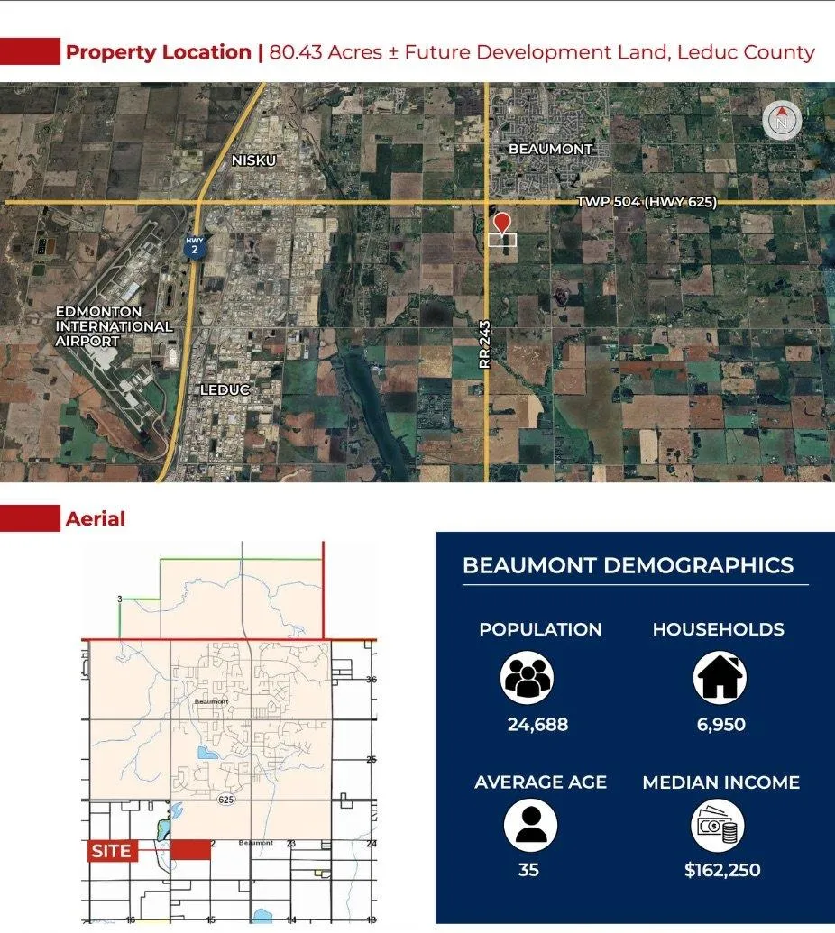 80.43 acres ± of future development landLand neighbours City of Beaumont, located in Leduc County.Ideal for current agricultural use, agri-business ventures, or as a strategic investment for future value growthQuick access to amenities and major transportation routes from Highway 625 (Township Road 504)Close proximity to Beaumont, Nisku, and the EIA (id:27476)