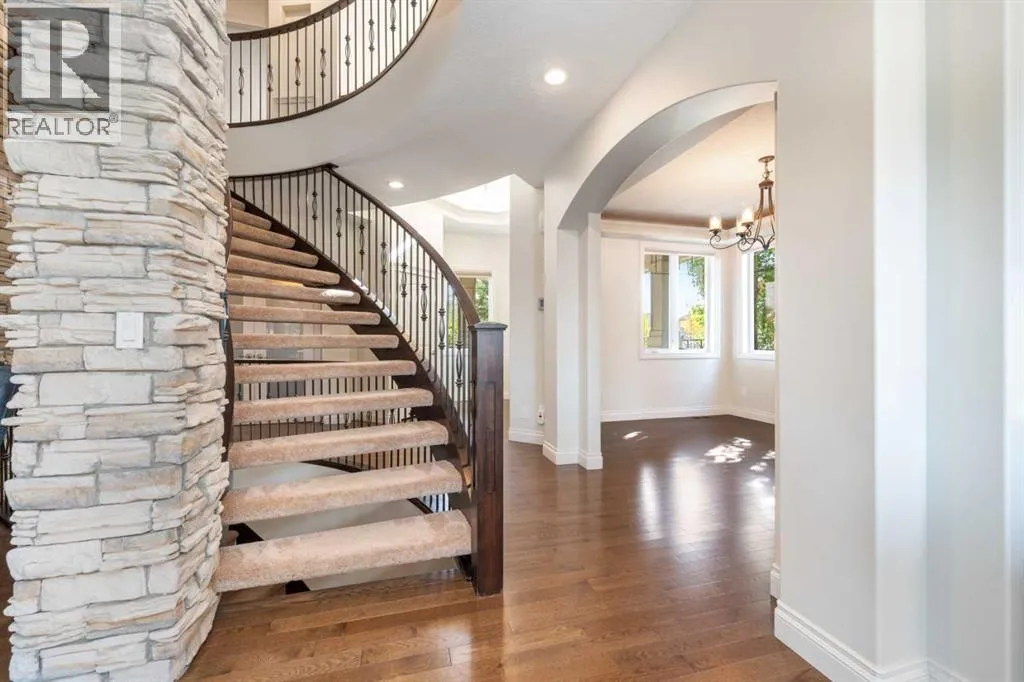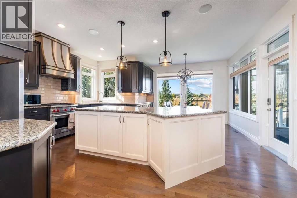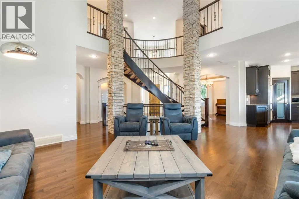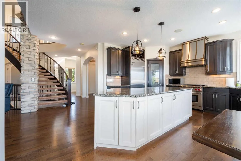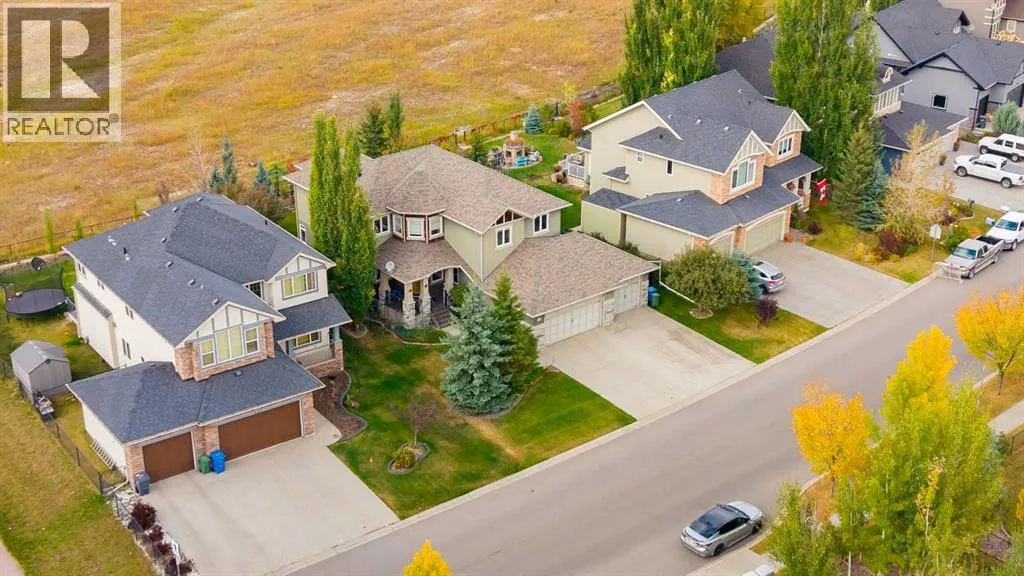 Looking for a home that has the âwowâ factor the moment you step inside? This former show home in Okotoksâ highly desirable Air Ranch community delivers exactly thatâand so much more. With 5 bedrooms, 3.5 bathrooms, and nearly every upgrade you could ask for, this property backs directly onto greenspace, offering a unique setting you wonât find anywhere else. Itâs a rare combination of refined design and everyday comfort, all wrapped up in one incredible package. From the moment you walk in, the grand foyer makes an impression with 18â ceilings, a sweeping spiral staircase, and natural light that fills the main floor. The layout is built for both entertaining and family living. The kitchen is every chefâs dreamâfeaturing a Wolf gas range, Viking fridge, custom Hammersmith hood fan, and a convenient water filtration/softener system. Rich cabinetry runs floor-to-ceiling, paired with granite counters, a large island, and a walk-in pantry to keep everything organized. Throughout the main level, youâll notice thoughtful details that set this home apart. A built-in audio system lets you enjoy music in every room. The office, tucked behind distinctive arched French doors, provides a quiet space for work or study. Even the laundry room has been elevated with granite counters to match the homeâs cohesive, upscale feel. Upstairs, three generously sized bedrooms and two full bathrooms provide plenty of space for family and guests. The primary suite is the highlightâa true retreat with room for a king-sized bed and private seating area. The 5-piece ensuite feels like a spa with a granite double vanity, corner soaker tub, walk-in tiled shower, and expansive walk-in closet. The fully finished lower level is where this home really shines. With two additional bedrooms, a 3-piece bath featuring a steam shower, and a large family room complete with a cozy gas fireplace and built-in entertainment centre, thereâs space for everyone. A granite-topped wet bar with sink, wine fridge, and microwave makes it easy to entertain or kick back for movie nights. Youâll also find a large finished storage area to keep everything neatly tucked away. Car enthusiasts or families with multiple vehicles will appreciate the massive heated garage, designed with both function and space in mind. Outdoors, the lifestyle continues with a screened-in covered sunroom off the kitchen eating nook, leading to a stone patio with a built-in fireplace and additional gas lines ready for your BBQ & sunroom. Surrounded by mature trees, Gemstone lights for year-round curb appeal, and serviced by an underground sprinkler system, the yard is both private and low-maintenance. Central AC adds comfort through the summer months, so youâll enjoy this home year-round. Air Ranch is one of Okotoksâ most distinctive communities, known for its quiet streets, beautiful homes, and unique aviation history. If youâre after a property that checks every boxâstyle, function, and locationâthis home has it all. Come take a look for yourself! (id:27476)