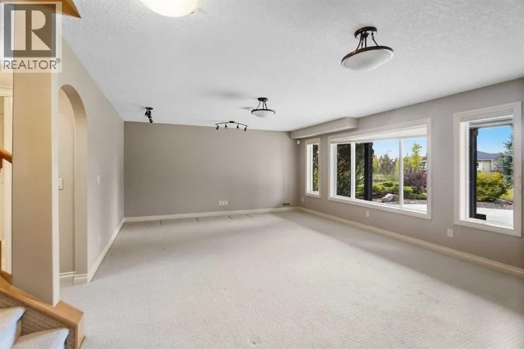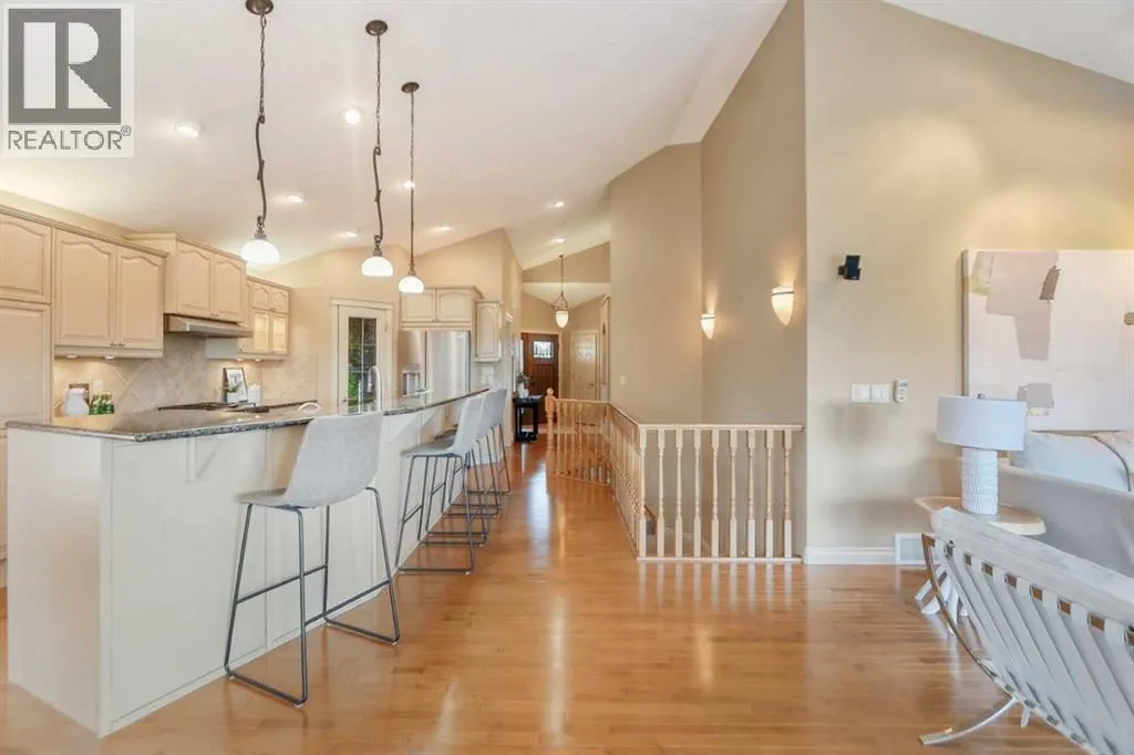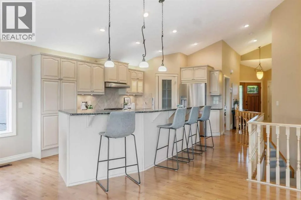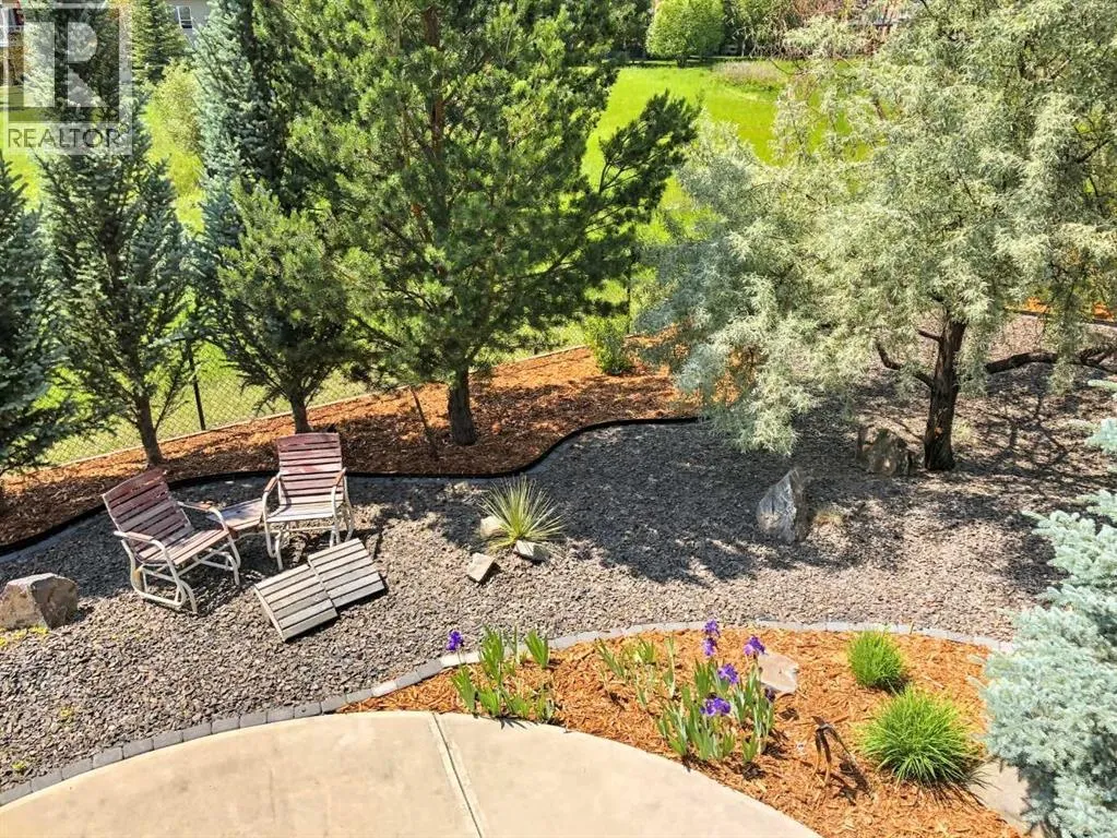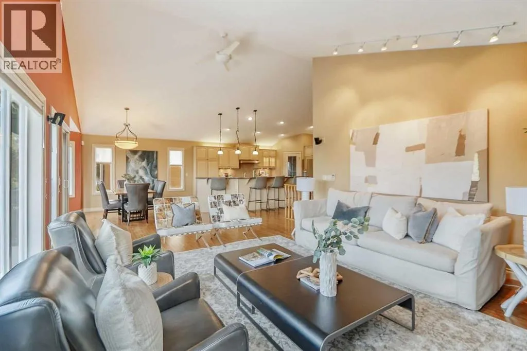** EXECUTIVE bungalow in Okotoks â âAir Ranchâ - with STUNNING mountain, lake and natural environmental reserve views! â AMAZING sunsets!! ** QUIET cul-de-sac location, beautiful south-west facing backyard with low maintenance landscaping and perimeter fencing. ** OVERSIZED, heated double garage with ceiling-mounted storage racks, several storage lockers, and closets. ** COZY front porch with poured concrete walks & patio stone accents. ** BRIGHT, spacious open foyer with direct access to garage and the 2 pce powder room. â- OFFICE/den at front door with vaulted ceilings & lots of natural light (could be a second bedroom â with adding a wardrobe or closet). ** PRIMARY bedroom & ensuite â an oversized room with vaulted ceilings, scenic views from the window â and featuring a 4 pce ensuite with double sinks, custom vanity and stand-up shower. -- PLUS, a large walk-in closet â PLUS a separate ensuite laundry room with extra shelving and washer / dryer. ** OPEN concept floor plan â SPACIOUS kitchen with loads of custom cabinets, QUARTZ counter tops, a corner pantry and a full complement of Stainless-steel appliances. ** an EXPANSIVE formal dining area with great flow into the living room that features VAULTED ceilings tons of natural light (GREAT views) a gas fireplace and patio door to the massive back deck. AMAZING views of the mountains, lake, and natural reserve areas. ** DEVELOPED walk-out basement with expansive family room / games room area â with direct access to large, covered patio area and private landscaped backyard. ** LARGE lower-level bedroom, a full 4 pce bathroom with tub/shower. ** ADDITIONAL hobby/storage//utility room â PLUS a massive storage utility room with loads of shelving. (GOOD potential to add another large bedroom if needed) ** A very functional & meticulously maintained Executive bungalow featuring hardwood floors, vaulted ceilings, Quartz counter tops, Stainless Steel appliances and so much more!! ** TRULY a rare property that needs to be seen!! ** CALL your favorite REALTOR â or come by our OPEN House â both Saturday & Sunday from 1:00 pm -to- 4:30 pm. ** COME and CHECK-it-OUT! *** NOTE: this is a âstand aloneâ â single family âBareland Condoâ *** (id:27476)