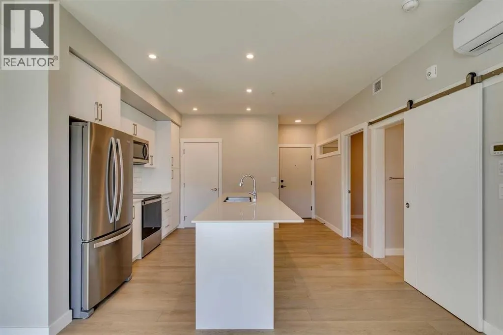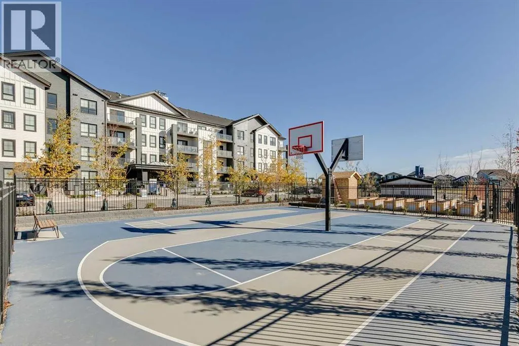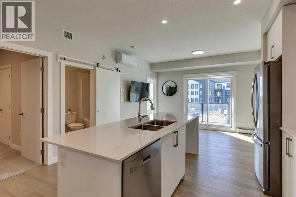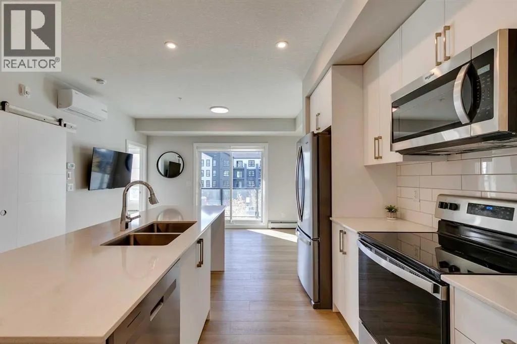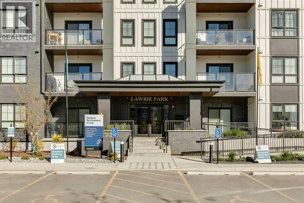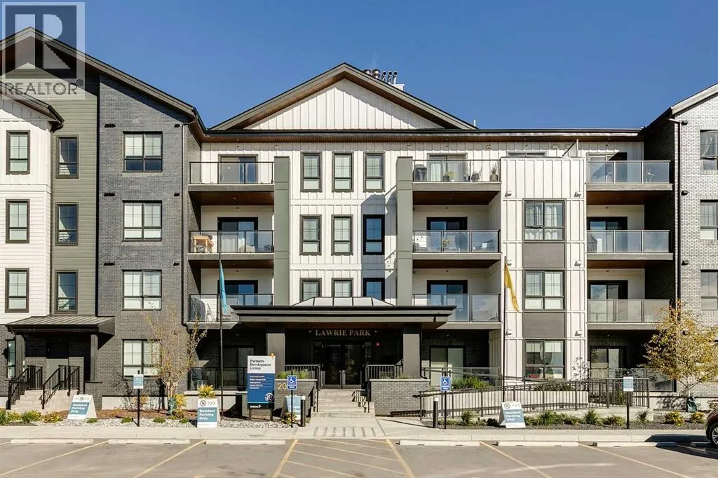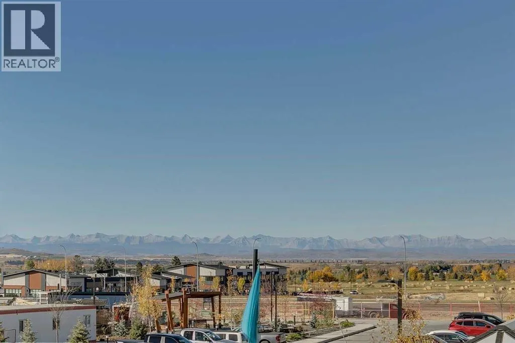 Welcome to the Lawrie Park, Okotoks' newest apartment complex, surrounded by parks, walking paths, and panoramic views. Enjoy the convenience of being within walking distance to D'Arcy Crossing Shopping Centre, as well as easy access to Calgary. This development, quality built by Partners Homes, offers a prime location with modern design and finishings. This is an ideal option for first time buyers, retirees, investors and young professionals. Functional floor plan with 2 bedroom, 2 bath unit has a sunny south exposure from the spacious private balcony (with gas barbeque hook-up). This second floor unit features an open floor plan with high ceilings, large windows, and bright interior colors. Upgrades include air conditioning, barn door, custom window coverings and more. The bright kitchen features white cabinets, quartz counters, and massive center island with huge dining/breakfast bar area. The adjoining living room offers an abundance of space for furnishings with patio door to enjoy the mountain, courtyard and park views. The master bedroom is a good size featuring a 4-piece ensuite. The second bedroom would also be ideal for a home office or flex room. There is a main 4-piece bathroom and convenient in-suite laundry. Titled heated underground parking and assigned storage locker. This is a pet friendly complex. Enjoy a relaxing stress-free lifestyle in this outstanding Lawrie Park condo. Immediate possession. Just move in and enjoy! (id:27476)