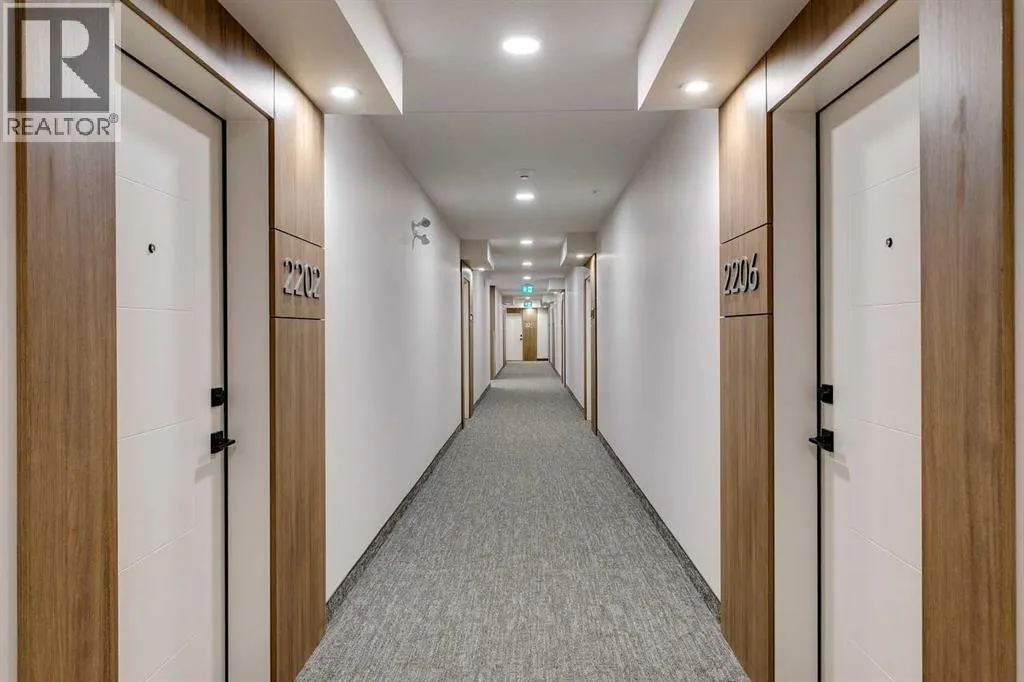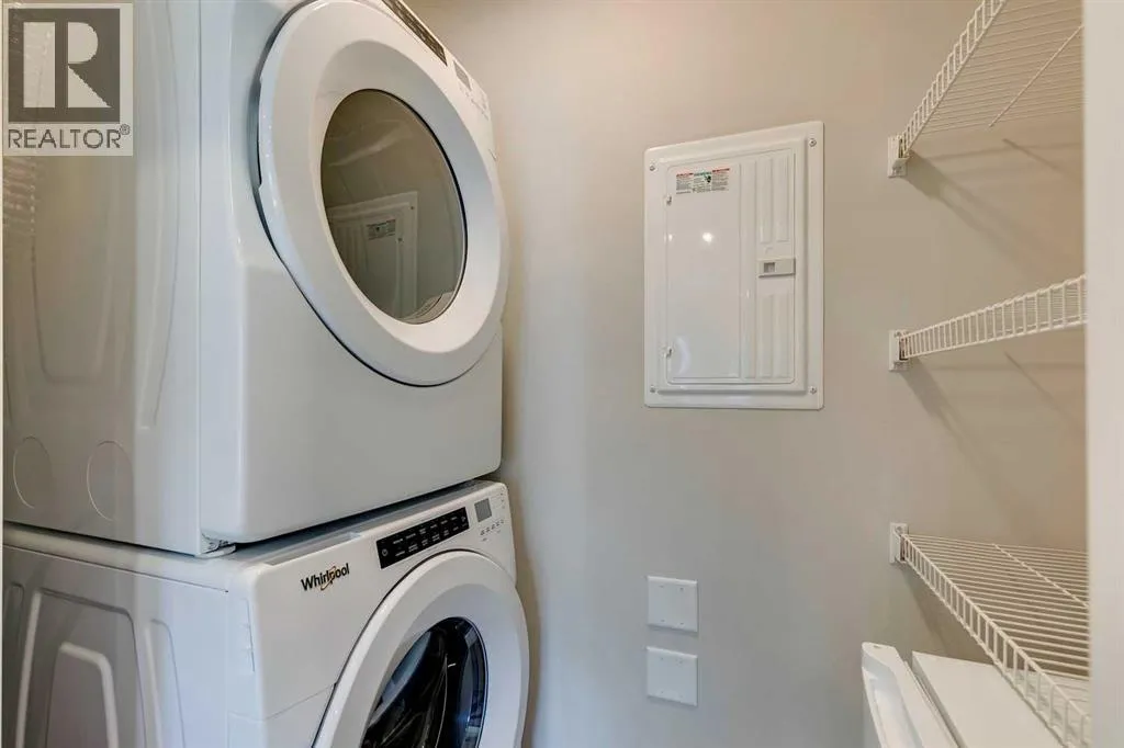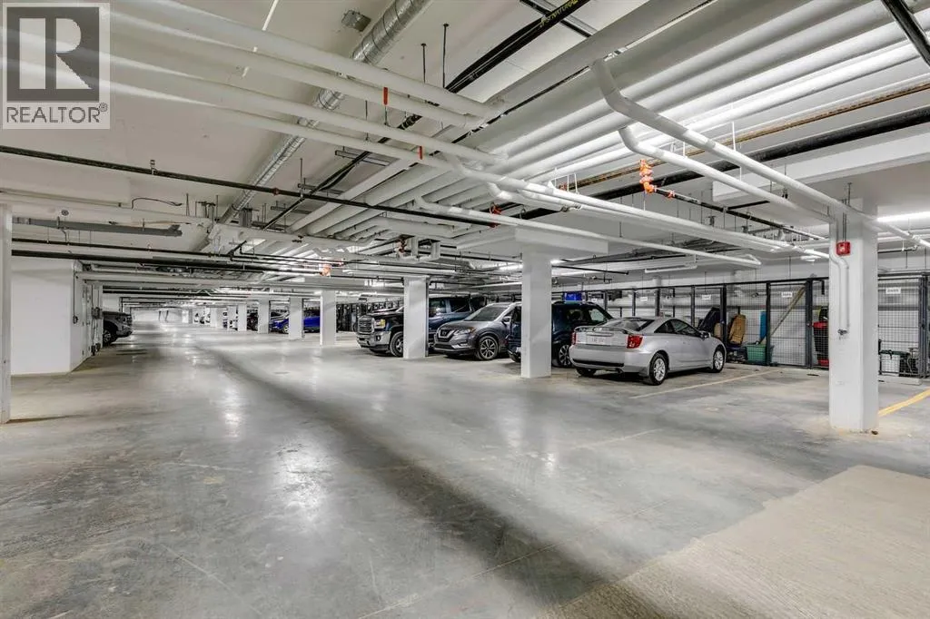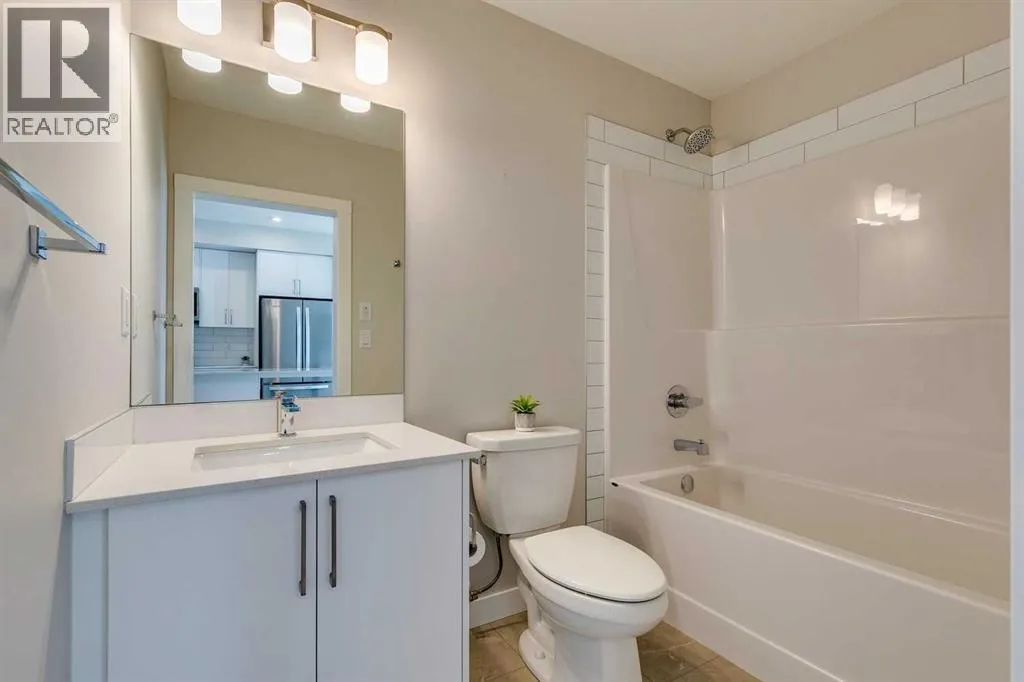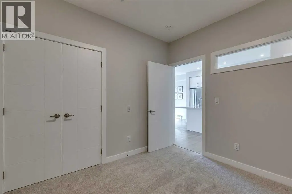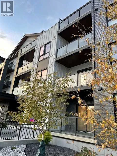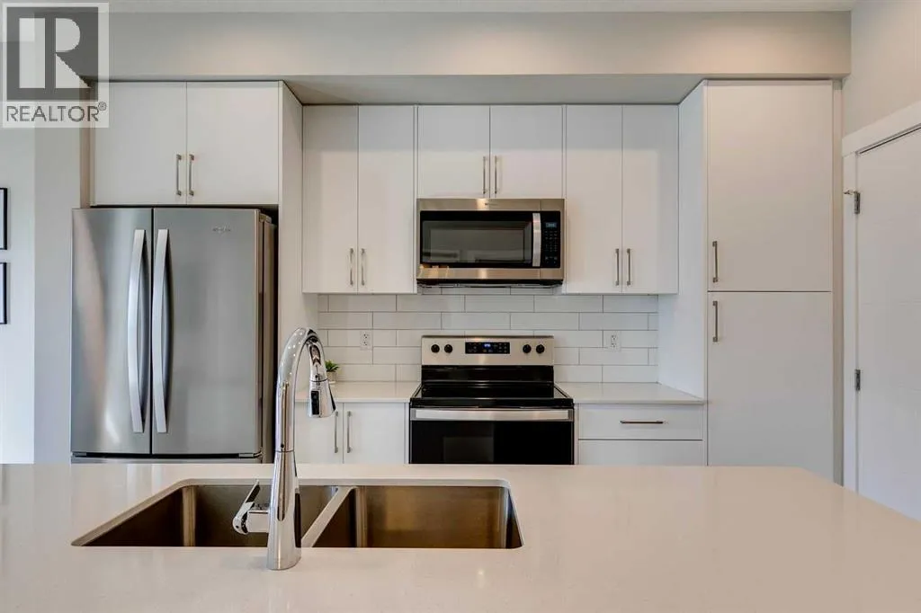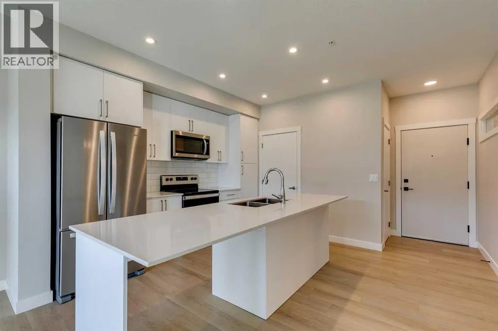 Welcome to the Lawrie Park, Okotoks' newest apartment complex, surrounded by parks, walking paths, and panoramic views. Enjoy the convenience of being within walking distance to D'Arcy Crossing Shopping Centre, as well as easy access to Calgary. This development, quality built by Partners Homes, offers a prime location with modern design and finishings. This is an ideal option for first time buyers, retirees, investors and young professionals. Functional floor plan with 2 bedroom, 2 bath unit has a sunny south exposure from the spacious private balcony (with gas barbeque hook-up). This second floor unit features an open floor plan with high ceilings, large windows, and bright interior colors. Upgrades include air conditioning, barn door, custom window coverings and more. The bright kitchen features white cabinets, quartz counters, and massive center island with huge dining/breakfast bar area. The adjoining living room offers an abundance of space for furnishings with patio door to enjoy the mountain, courtyard and park views. The master bedroom is a good size featuring a 4-piece ensuite. The second bedroom would also be ideal for a home office or flex room. There is a main 4-piece bathroom and convenient in-suite laundry. Titled heated underground parking and assigned storage locker. This is a pet friendly complex. Enjoy a relaxing stress-free lifestyle in this outstanding Lawrie Park condo. Immediate possession. Just move in and enjoy! (id:27476)