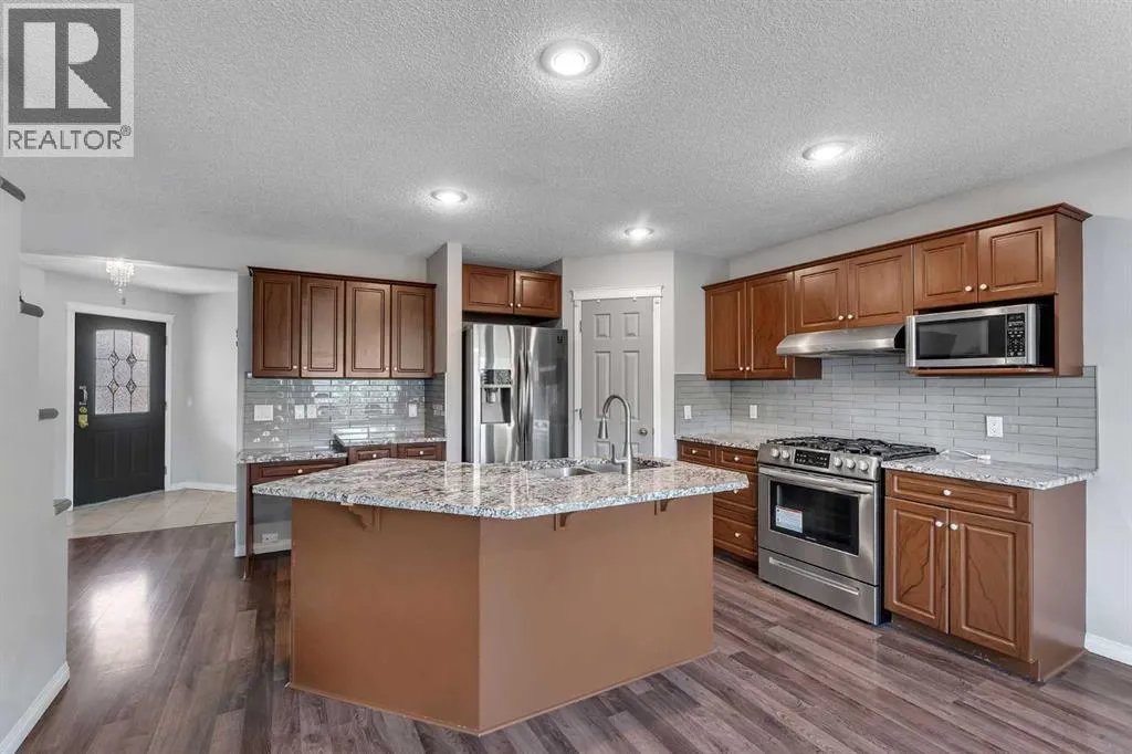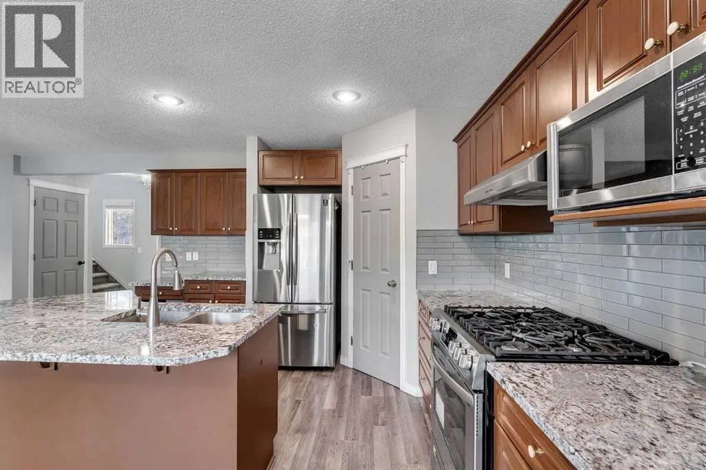 Exceptional family home in Cimarron â 22 Cimarron Crescent. This attractive 2-storey single-family home (approx. 1,850 sq. ft. plus finished basement) features a front double-attached garage, open main floor with spacious living area, well-positioned dining space and a functional kitchen with granite countertops. The second floor offers an oversized bonus room with gas fireplace, a primary bedroom with 4-pc ensuite, two additional generous bedrooms and another 4-pc bath. The private backyard is ideal for gatherings â large wooden deck, mature apple tree, and front + back lane access (excellent for parking, toys or future garage/coach-house options).Located in the family-oriented Cimarron community with extensive pathways, nearby parks and direct access to the scenic Sheep River valley â walk-to-school convenience with several schools in the neighbourhood and quick access to Okotoks amenities and services.Pride of ownership shows throughout â ideal for growing families seeking space, functionality and excellent outdoor access. The roof was changed in this year and comes with a 20 years warranty that can be transferred to the new owner. Book your showing today. (id:27476)