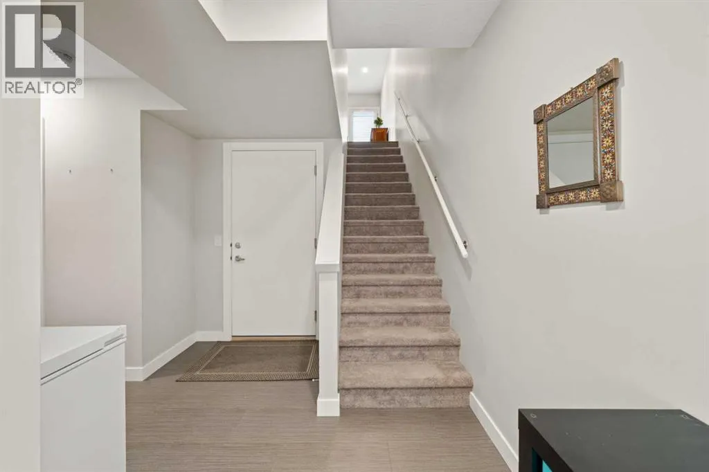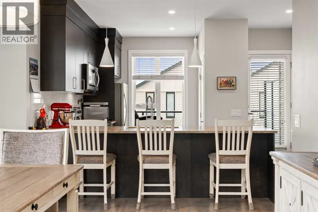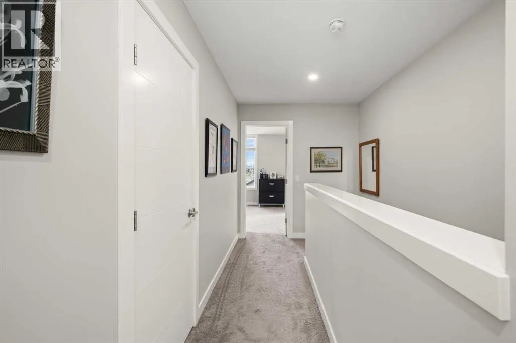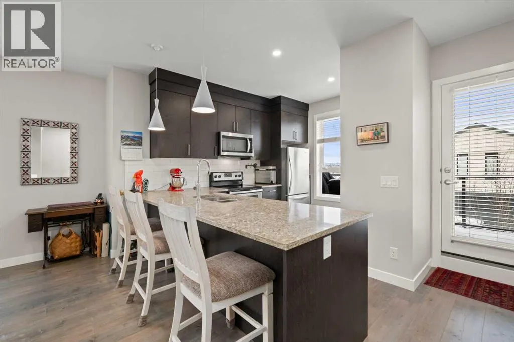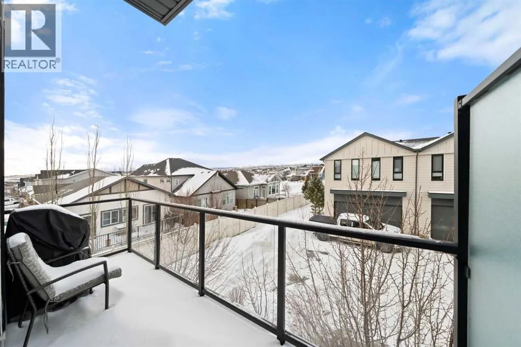 Welcome to this beautifully appointed, air-conditioned end-unit townhouse showcasing stunning west-facing mountain views. Lovingly maintained by its original owner, this home reflects true pride of ownership throughout.From the moment you arrive, youâll appreciate the convenience of a private driveway, ease of parking for visitors, impeccably maintained common areas, and the welcoming front patio. The entry level features durable tile flooring, a versatile den ideal for a home office or flex space, a convenient half bath, and direct access to the oversized single attached garage with additional storage.The main living level offers an open-concept layout enhanced by luxury vinyl plank flooring. The contemporary kitchen is both stylish and functional, featuring quartz countertops, cabinets extended to the ceiling, generous counter space, a pantry, and stainless steel appliances. Step onto the west-facing balcony to enjoy breathtaking mountain views and unforgettable sunsets. This level is completed by a spacious dining area and a bright, inviting living room filled with natural light from the abundance of windowsâperfect for entertaining or relaxing!Upstairs, two generously sized primary bedrooms each feature their own ensuite bathrooms and dual closets. The west-facing primary suite boasts spectacular mountain views and a four-piece ensuite, while the east-facing suite offers a three-piece ensuite with a large walk-in shower. Convenient upper-floor laundry completes this level.Ideally located close to a park, walking paths, a nearby school, and a variety of shopping and everyday amenities, this exceptional end unit seamlessly combines thoughtful design, modern finishes, and a highly desirable locationâtruly a place youâll be proud to call home.View 3D/Multimedia/Virtual Tour. (id:27476)