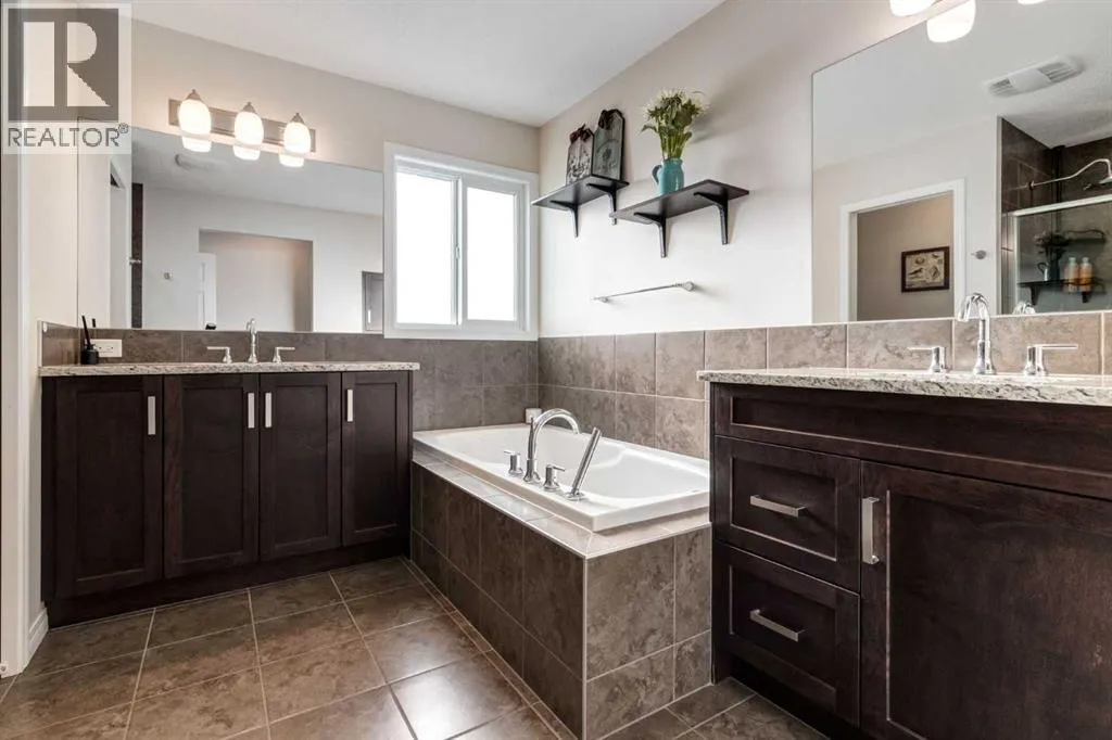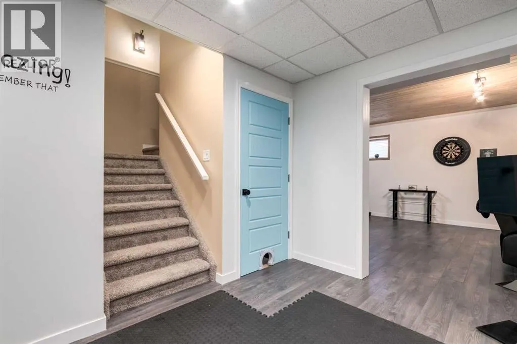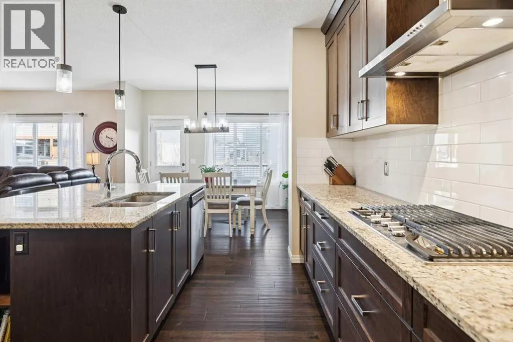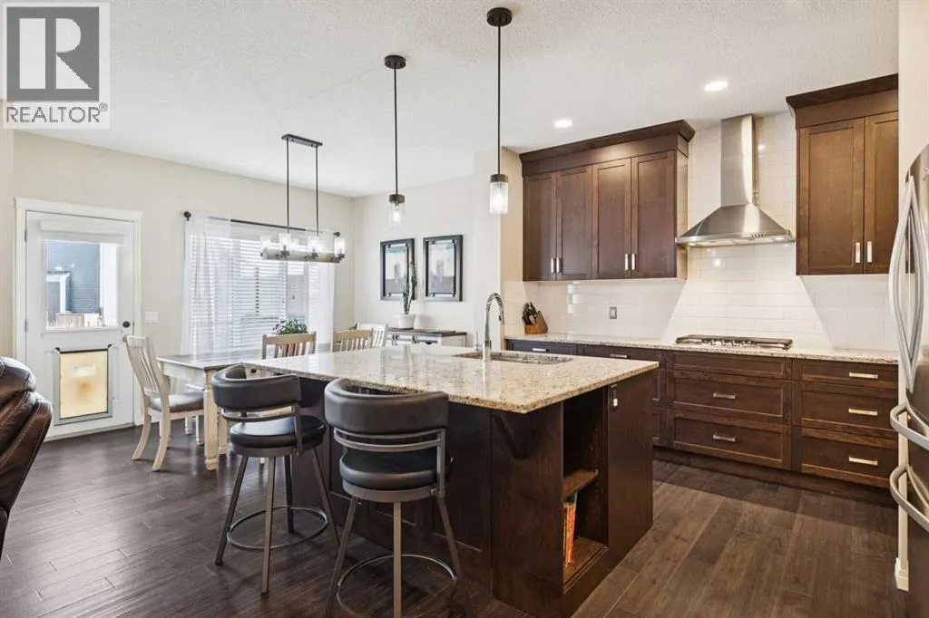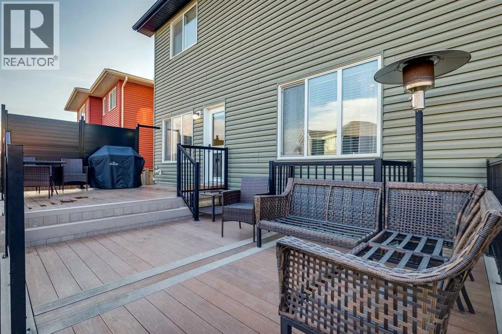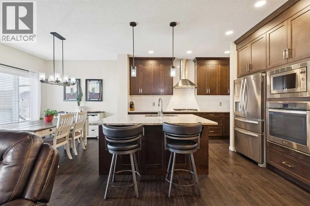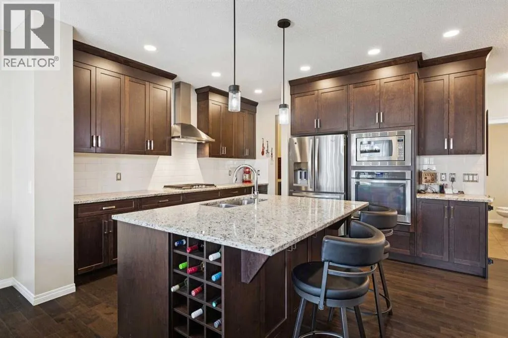 26 Mount Rae Terrace is the perfect family-friendly home to raise a family. The welcoming entry features a tiled foyer paired with the warmth of hand-scraped hardwood flooring, creating an inviting first impression for family & guests. The walk-through mudroom acts as an extension of the kitchen, featuring a stylish coffee bar, pantry with custom shelving, plus the everyday convenience of custom shoe shelving, built-in bench seating & coat hooks. Direct access to the heated garage with gas heater adds exceptional functionality. The chefâs kitchen features extended cabinetry, ample counter space, granite countertops, abundant lower drawers & full-height uppers, with new custom lighting in the kitchen & dining area. A large centre island offers seating for two, wine racks & cookbook shelving. Gas cooktop & stainless steel built-in oven/microwave complete the space. The dining area & family room are open to the kitchen & highlighted by a stone-surround fireplace & large windows overlooking the massive east-facing backyard. Enjoy the expansive composite deck with new privacy screen, ideal for outdoor entertaining, with added trees enhancing privacy. Upstairs, all three childrenâs bedrooms include walk-in closets. The main bath features dual sinks, granite counters & a pocket door separating the toilet & bathing space from the wash area, allowing multiple children to get ready at once. The laundry room includes storage shelving, a raised custom pedestal for front-load washer & dryer & a folding shelf. The primary suite offers west-facing windows with mountain views, a walk-through closet with custom built-ins & an ensuite with dual sinks, high-profile cabinetry & a separate shower. The finished basement includes a refreshed recreation room with wood slat ceiling, central gym space & rough-ins for a future bathroom. New central air conditioning adds year-round comfort. New custom lighting & granite finishes complete this exceptional family home. Freshly painted more photo s coming soon. (id:27476)