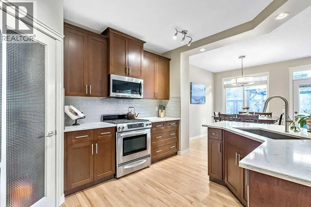 ~LAKE ACCESS ~ STEPS TO GOLF COURSE~ TRIPLE HEATED GARAGE ~ 6 BEDOOMS ~ 4 BATHS ~ ALMOST 4000 SQ FT OF LIVING SPACE~ Check out this absolutely stunning home nestled on one of the quietest roads in Crystal Green. Backing onto the prestigious Air-Ranch homes gives this street that extra feel of luxury and privacy. This home provides the space you need for large families to function together. Step inside the large entranceway and notice the beautifully maintained hardwood floors. The front office/den can be easily converted to a formal dining space or the flex space you need. Step through to the open concept living space with a charming 3 way gas fireplace, a stunning kitchen, huge dining, and cozy living room. This open floorplan is where all the memories will be made. Large windows invite your eye to enjoy the outside greenery. Enjoy cooking meals in this chefs kitchen with recent updates of new quartz counters and backsplash. Plenty of cupboards, workspace, stainless steel appliances, gas stove, corner pantry , and massive sit up island are just a few of the features this kitchen offers. Enjoy watching the kids and pets play in the yard from the kitchen. The upper level has new plush carpets and offer a second living space for your family. The huge bonus room is loaded with natural light and provides a good separation between the primary bedroom and the kids/guest rooms. You will love this massive primary suite!! The walk-in closet is large enough to host all your clothes plus dressers if needed. The ensuite gives a space to relax after a long day at work. 3 more large sized rooms plus another 5 piece bathroom complete this bright and sunny upper level. The fully finished lower level provides a 3rd living space plus 2 more large bedrooms and another full bathroom. If you love outdoor space, this home is for you!! The tranquil oasis of a back yard truly comes to life every summer providing privacy, and pure bliss. Relax on the large deck space and listen to the le aves on the mature trees blowing in the breeze. There are so many spaces on this property to obtain the lifestyle you desire. Enjoy long walks on the extensive path system Okotoks has to offer. Close to parks and playgrounds , in a convenient north end location that is perfect for city commuters. The oversized triple heated garage has epoxy floors, a man door to outside, a workbench area(or extra toy parking) and plenty of space for storage. Air conditioned on all levels of the home! There is truly something for every member of the family to find pleasure in this remarkable home. Upgrades over the last few years include new concrete pathway to back yard, hardwood floors redone, new counter tops and backsplash in kitchen, new carpets, paint, new back door and back windows, epoxy floors in garage... and more. Enjoy 4 season entertainment at Crystal Shores lake, offering beaches, swimming, fishing(summer and winter) and skating. This is a true family home ready for its next family to enjoy. (id:27476)