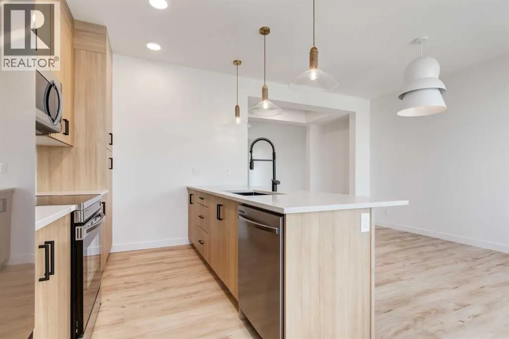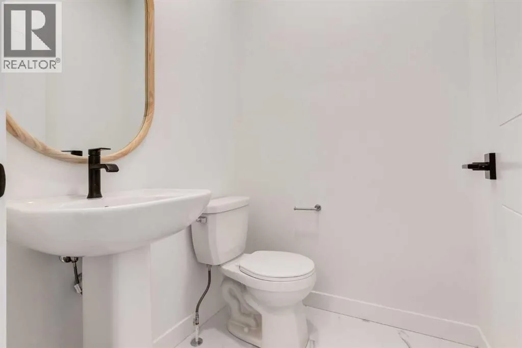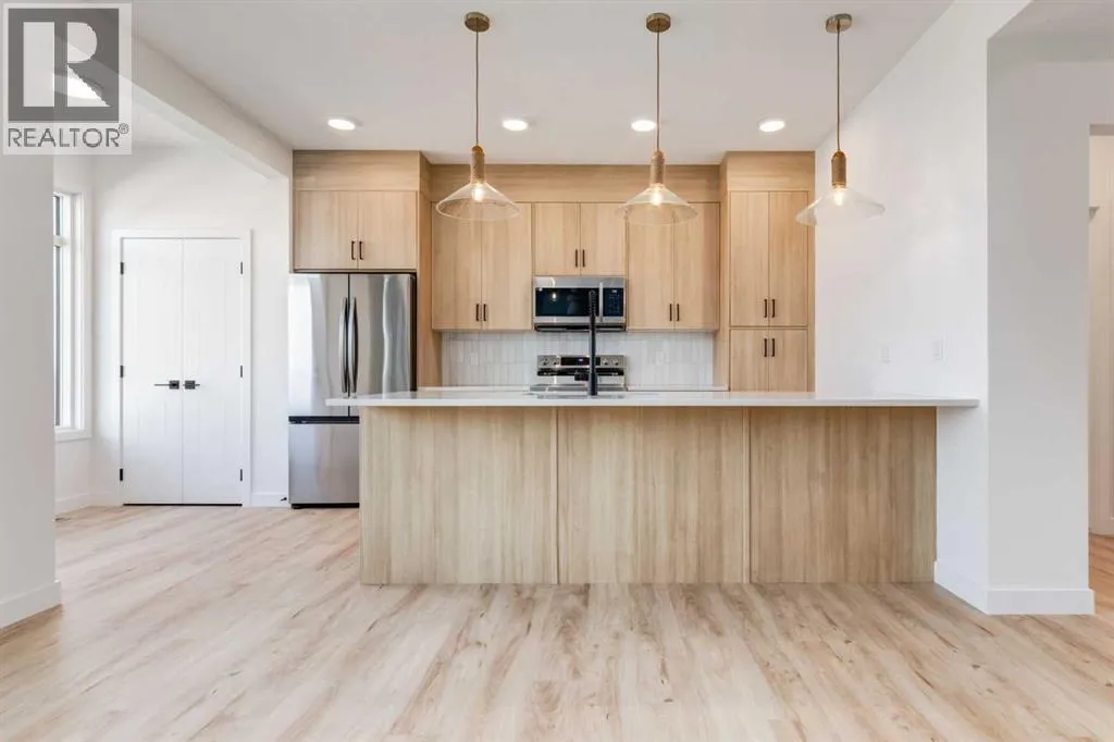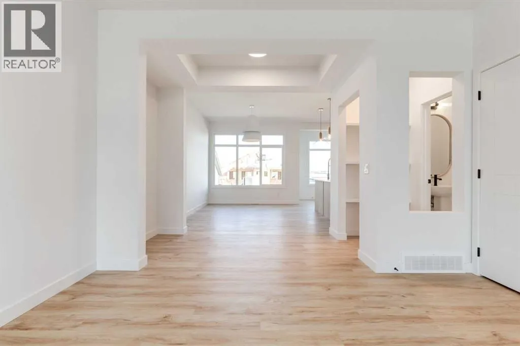 Welcome to The Hudson by Rohit Homes, a well designed 3 bedroom, 2.5 bathroom duplex in Tillotson, Okotoksâ newest community. This home offers a functional open concept layout, modern finishes, and flexibility for future growth. The main floor is bright and welcoming, anchored by a contemporary kitchen with full height cabinetry, quartz countertops, stainless steel appliances, and a generous peninsula ideal for everyday living and casual entertaining. Oversized windows bring natural light into the kitchen, dining, and living areas, while a convenient two piece bathroom completes this level. Finished in Rohitâs Ethereal Zen interior palette, the home features a soft, calming aesthetic with light tones, clean lines, and warm modern finishes that create a cohesive and inviting feel throughout. Upstairs, the primary bedroom offers a comfortable retreat with a walk in closet and a private ensuite with dual sinks. Two additional bedrooms, a full bathroom, and upper floor laundry provide a practical layout suited to busy households, professionals, or downsizers. A separate side entrance allows for future basement development, adding long term flexibility and value. Full new home warranty coverage is included for added peace of mind. Located in Tillotson, a new southwest Okotoks mixed use community designed around walkability, this is an opportunity to get into a thoughtfully planned neighbourhood early. (id:27476)
