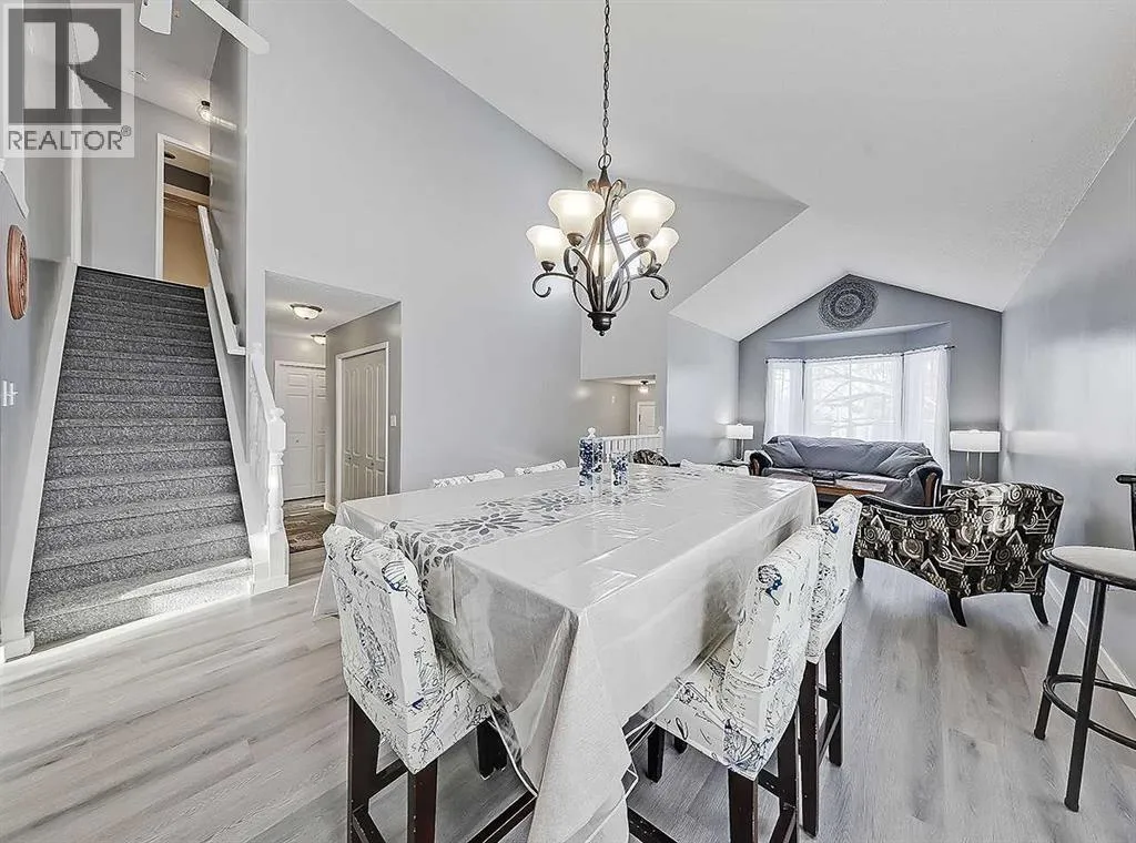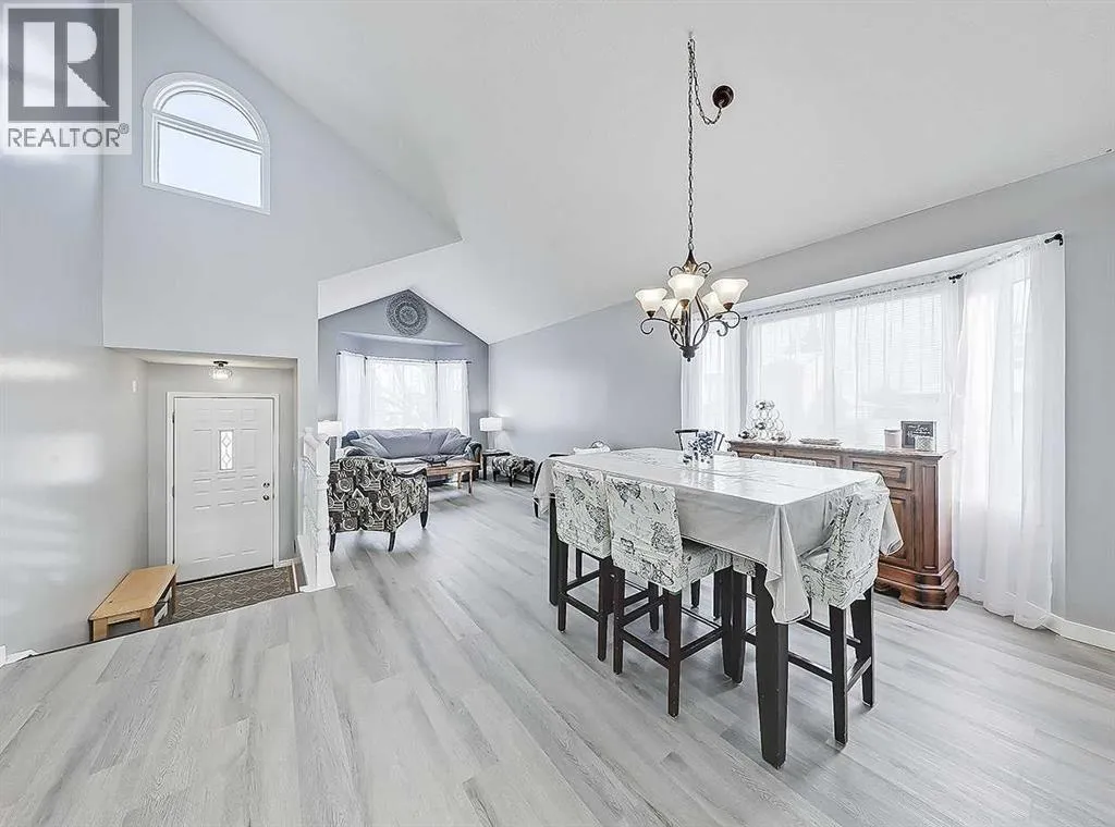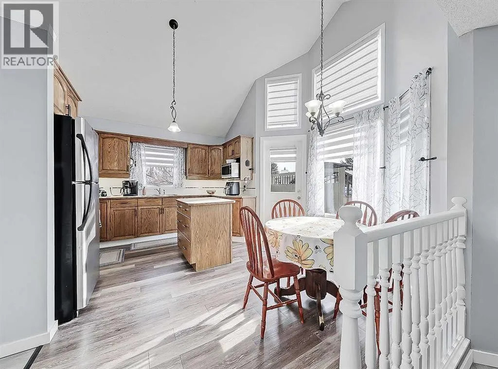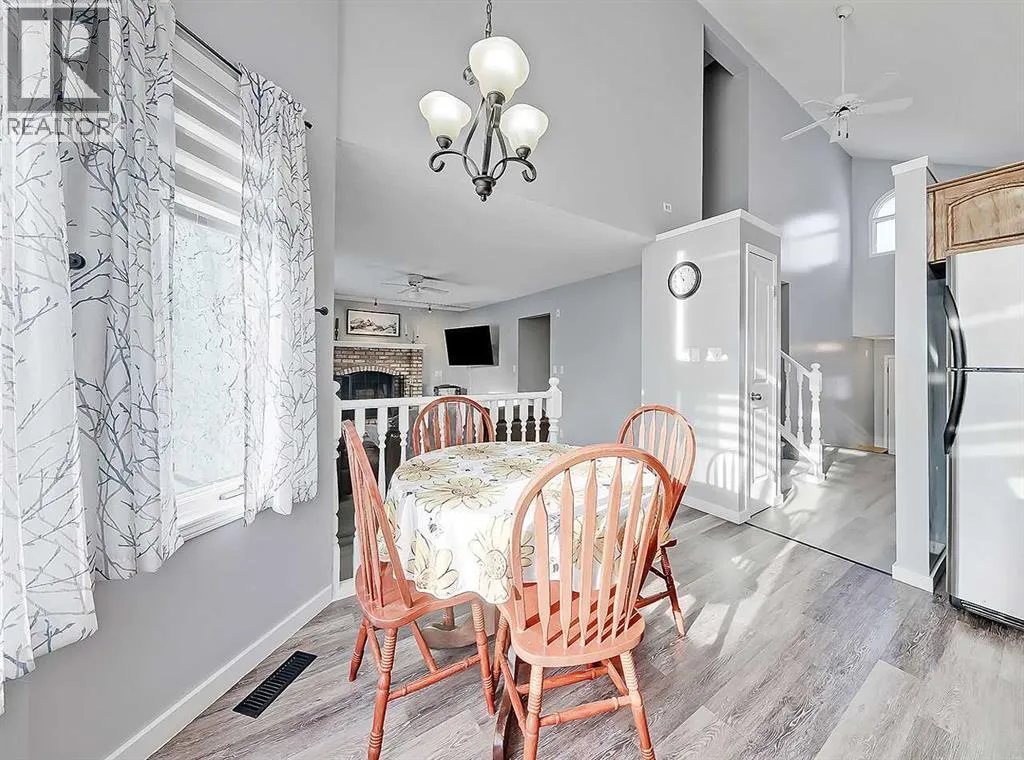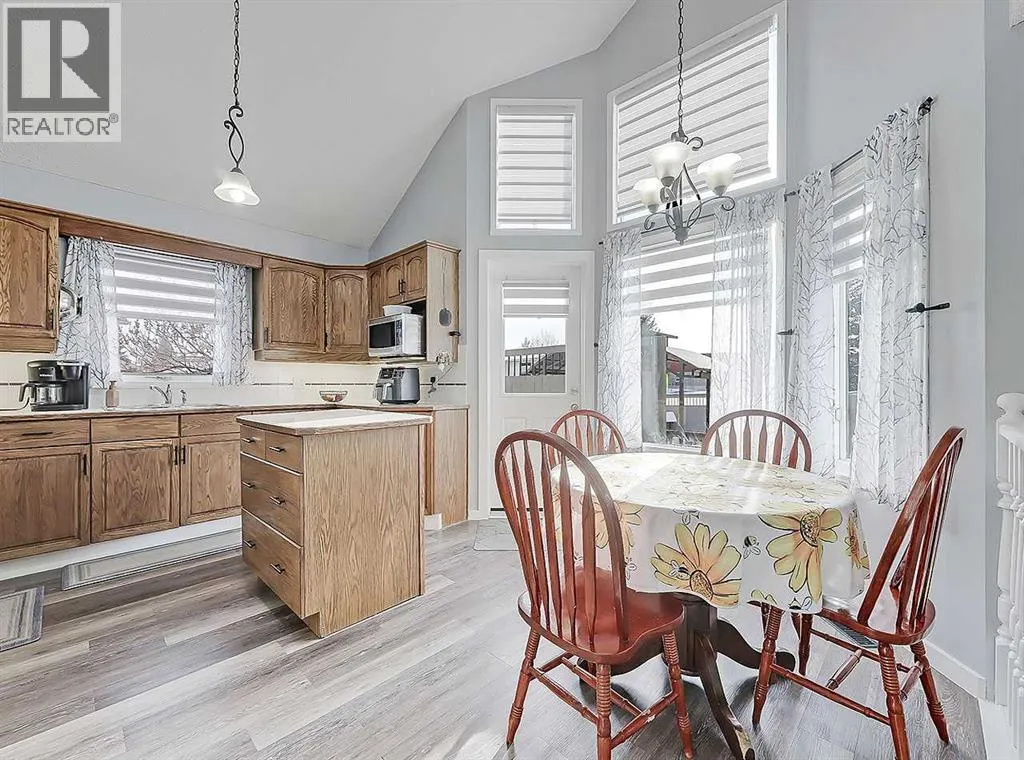 Wonderful opportunity to own a great family home ideally located near schools, shopping, and downtown Okotoks. This fully finished 4-bedroom home sits on a corner lot with abundant off-street parkingâperfect for families, guests, or recreational vehicles.As you enter, youâre welcomed by new vinyl plank flooring and a spacious living and dining area featuring soaring cathedral ceilings that enhance the sense of space and light. The kitchen offers updated appliances, newer flooring, and opens to a bright breakfast nook with direct access to the backyard. Outside, enjoy a large south-facing yard complete with a back deckâideal for entertaining or family time.The family room showcases a cozy wood-burning fireplace, creating the perfect setting for holidays and gatherings. Upstairs, youâll find three generous-sized bedrooms and a 4-piece bathroom. The fully finished basement adds even more living space with an additional bedroom, family room, and another 4-piece bath.Recent upgrades (2024â2025) include: new fence, furnace, central air conditioning, water softener, and updated flooring.This move-in-ready home checks all the boxesâcall today to view and start packing. (id:27476)