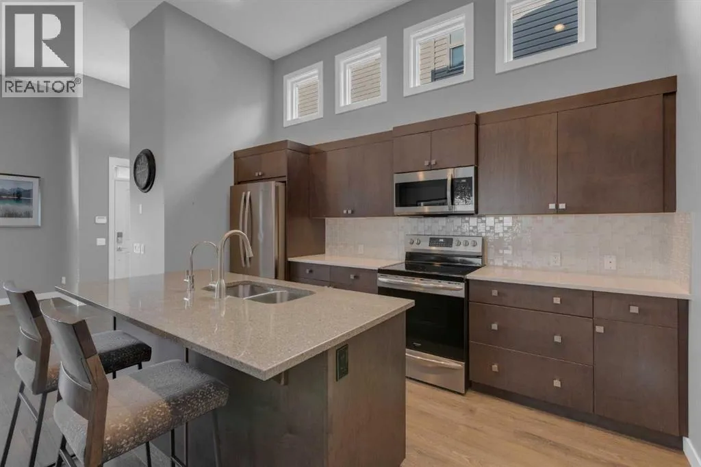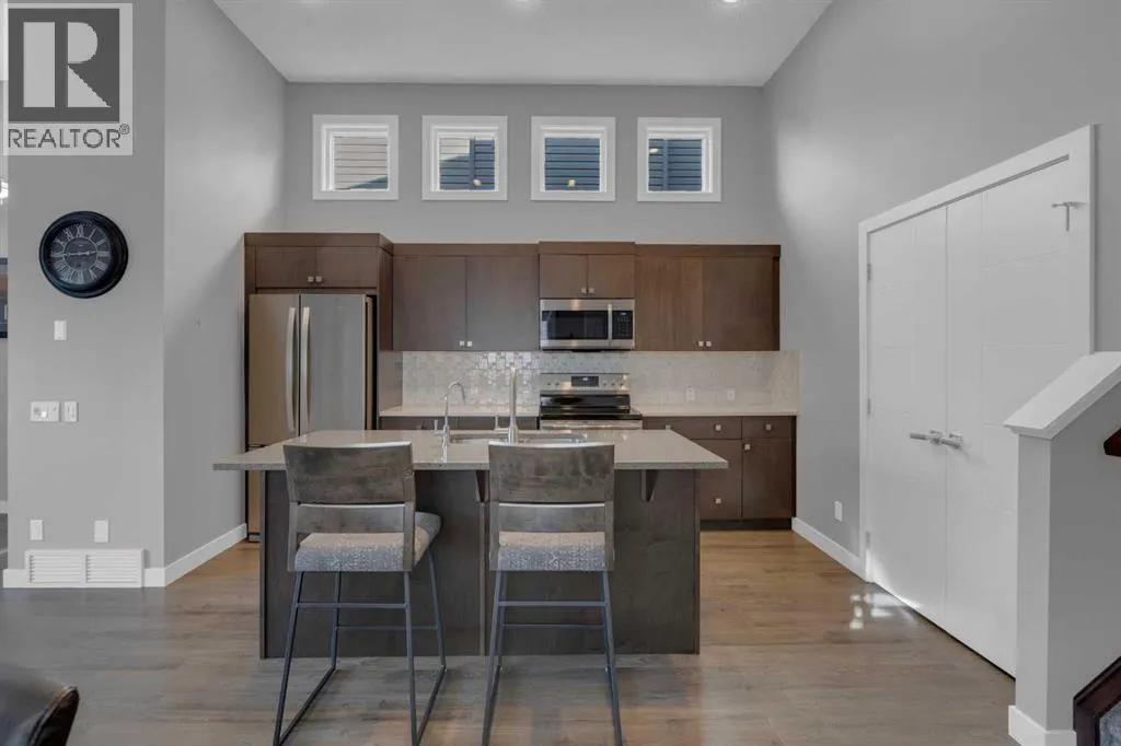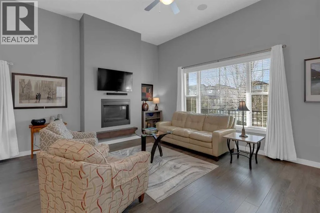 Family walks around the beautiful pond at the end of this street will be so much fun!!! Welcome to this immaculate, bright & spacious home that features 12-foot ceilings & an open-concept floor plan filled with natural light. The large island kitchen is ideal for both everyday living & entertaining, showcasing granite countertops, newer stainless steel appliances, abundant cabinetry & drawers, & a generous pantry. Imagine curling up with a good book in your living room that is warm & inviting with large windows & a gas fireplace. Upstairs, the primary bedroom offers excellent storage with dual closets & a 4-piece ensuite. Two additional well-sized bedrooms & another 4-piece bathroom complete the upper level. The fully finished 3rd level family room is impressively sized, providing ample space for a home theatre, games or craft area as well as a home office. The unfinished basement (4th level) includes laundry & a rough-in for a future bathroom, offering great potential for further development. Outside, enjoy an east-facing backyard with easy-care landscaping, BBQ gas line hook-up & a huge double detached garage. Recent updates include appliances, carpet, interior paint, & the garage. Ideally located near Seaman Stadium for the Okotoks Dawgs baseball games, Costco, shopping, coffee shops & more! Positioned on the outskirts of the community for a quick commute into Calgary, this home offers both comfort & convenience. Youâll love living here!!! (id:27476)