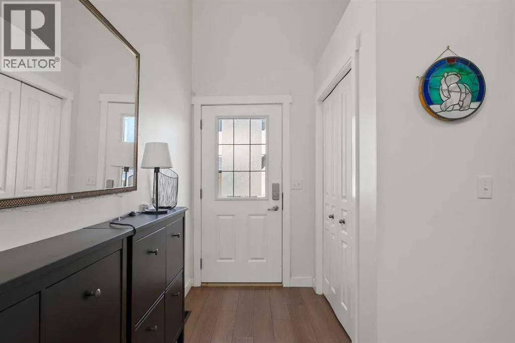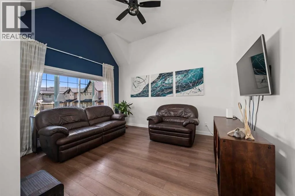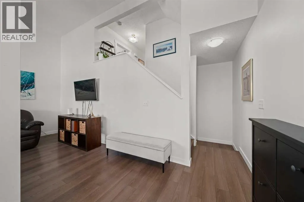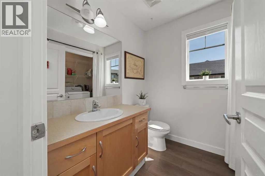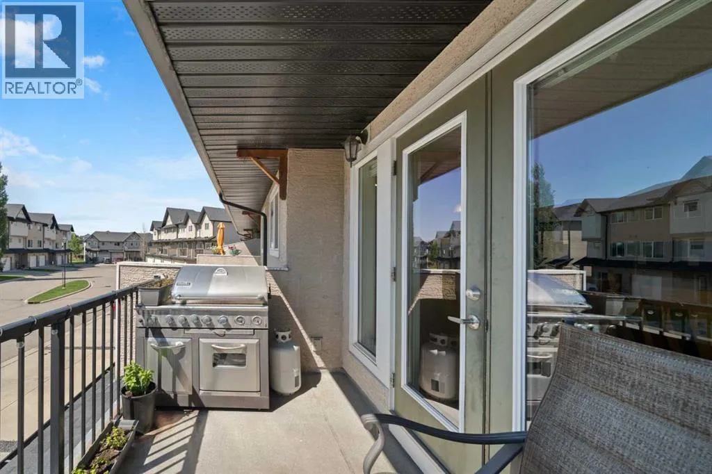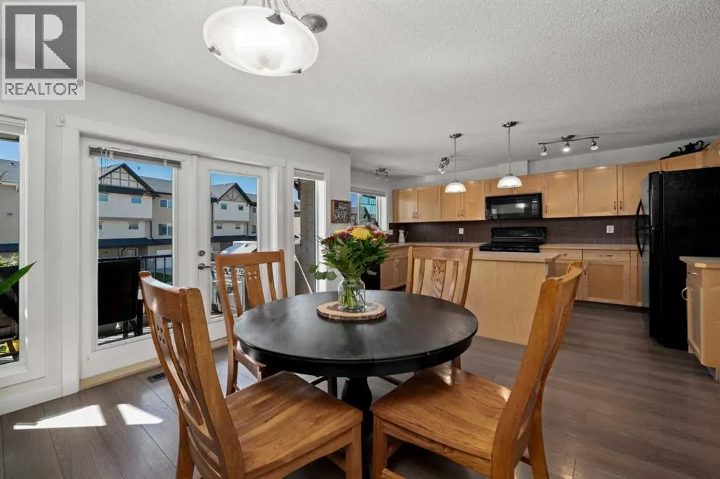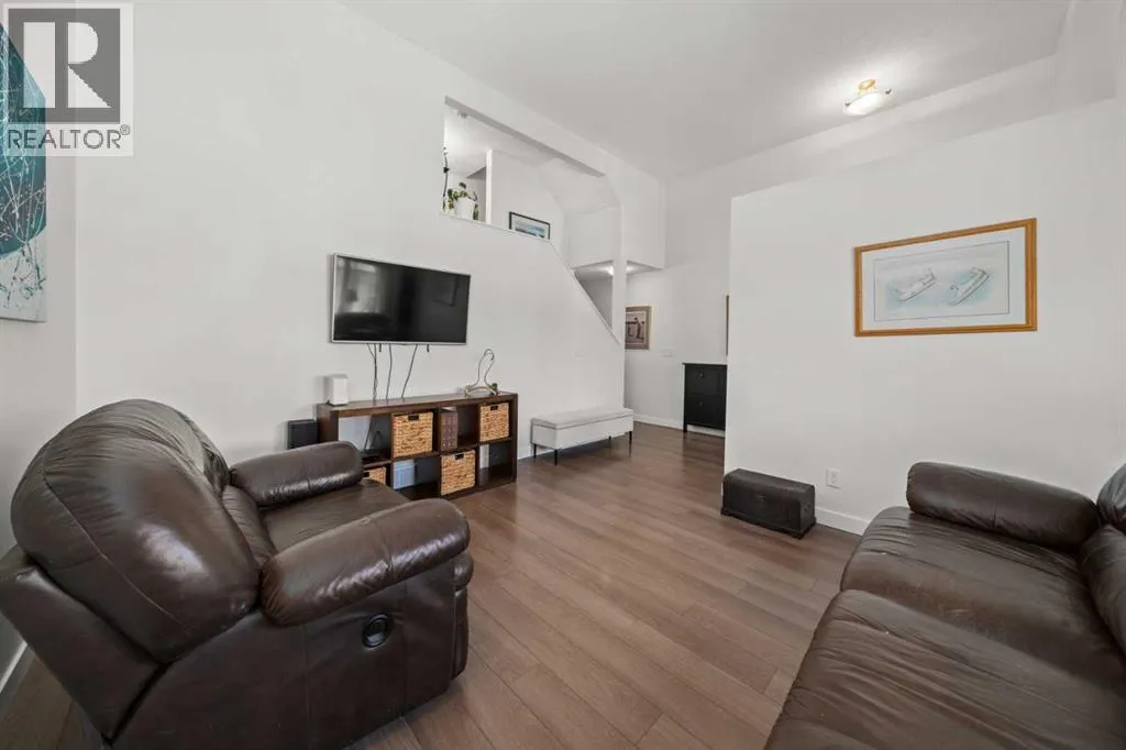 Welcome to this fabulous end-unit townhome offering 3 bedrooms, 2.5 bathrooms, and an attached double garage in the popular community of Cimarron. Beautifully maintained and truly move-in ready, this home features vinyl plank flooring throughout and an ideal layout for everyday living. The main level welcomes you with soaring ceilings, stylish flooring, and a bright, inviting living roomâperfect for relaxing at the end of the day. Upstairs, youâll find a well-designed kitchen with a central island and ample counter space, a spacious dining area, and access to a south-facing balconyâideal for BBQs and enjoying the sunshine. This level is completed by a convenient 2-piece powder room and laundry with washer and dryer.The upper level offers three generous bedrooms, including a primary suite with a 4-piece ensuite, plus an additional 4-piece main bathroom to accommodate family and guests.On the lower level, enjoy easy access to the attached double garage, along with a partially finished family room offering extra flexible living space.This home faces onto the park within the complex, with a playground just steps away. Ideally located within walking distance to shopping, walking paths, and the Sheep River, this is an excellent opportunity to own a stylish, low-maintenance home in a desirable complex. View the 3D tour! (id:27476)