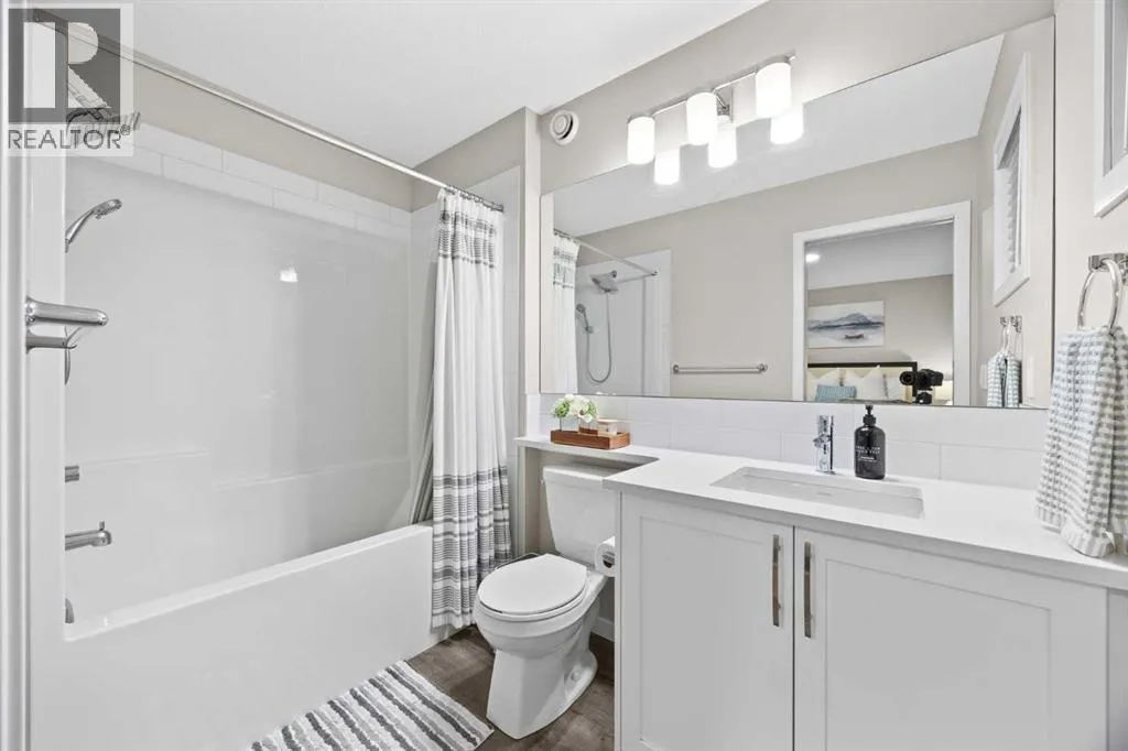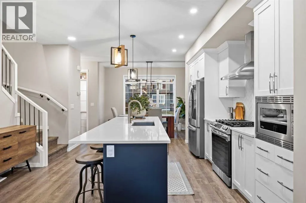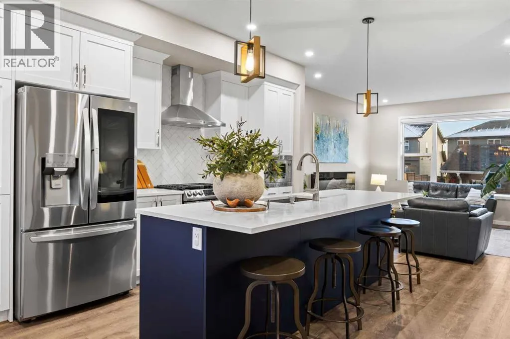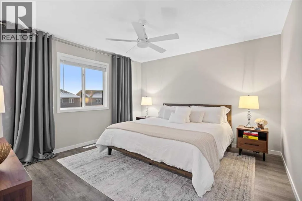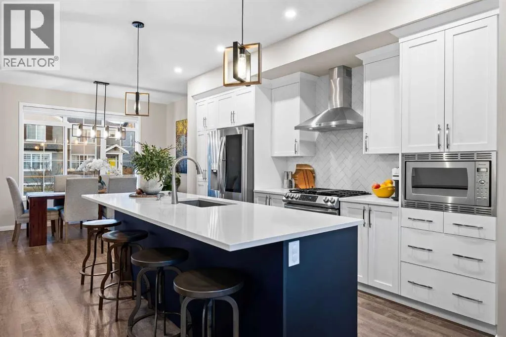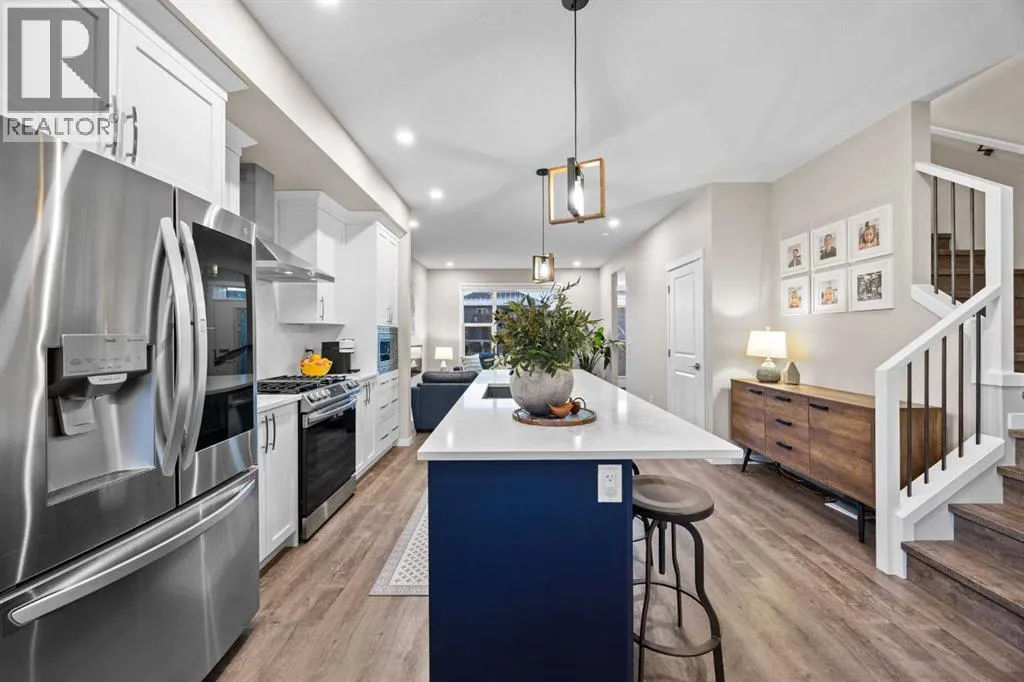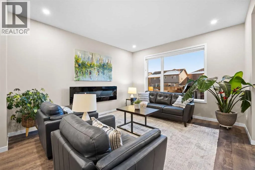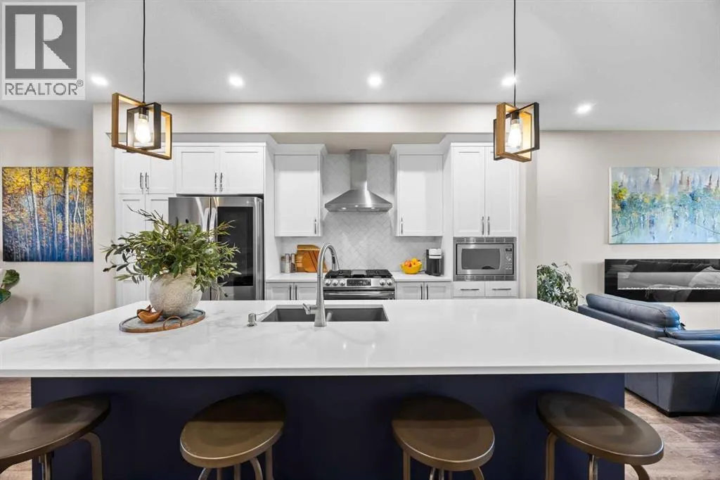 Highly upgraded throughout, professionally finished basement with side entrance and illegal suite potential, south facing backyard with massive composite deck, NO CARPET, transferable new home warranty!! Welcome to this immaculately cared for home, conveniently located on the north side of Okotoks - commuting to Calgary is a breeze. Offering a bright and open main floor with a spacious dining area, central kitchen with 2 tone cabinetry, quartz countertops, upgraded appliances - including gas range and built-in microwave. The spacious living room has an electric fireplace, big south facing window and extra pot lights. The main floor also offers a 2 pc bathroom and access to the SOUTH FACING backyard with 2 tiered composite deck that leads to the double detached garage with epoxy flooring. Upstairs youâll enjoy the double primary layout separated by a bonus room and laundry room with added storage. Both bedrooms have ensuite bathrooms - upgraded to quartz countertops. The professionally finished basement has a convenient side entrance that leads down to the large living room with an electric fireplace and feature wall. There is an L shaped kitchen with sink, fridge and 220v wiring. An additional bedroom with a large window and full bathroom with tiled shower, washer/dryer hookups and under stair storage complete this space. The home also features a water softener, custom window coverings throughout (2 main floor windows are motorized), BBQ gas line, exterior gemstone track lighting and a landscaped front yard with stone patio - no grass to cut here! (id:27476)